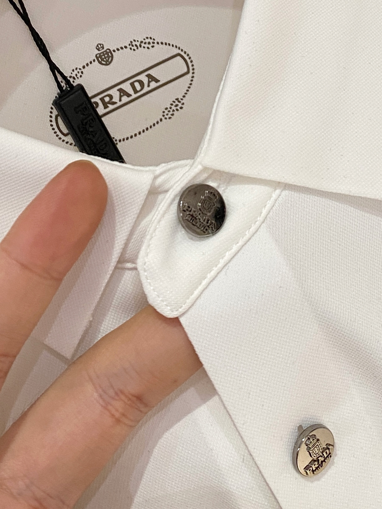 这款衣服是AAAAA 1:1 质量 (非常棒). 使用了和原版一模一样的材料. 商标部分也保持了和普拉达/Prada一样. 图片拍摄是实物衣服拍摄, 您所收到的实物保证和我们图片一模一样.