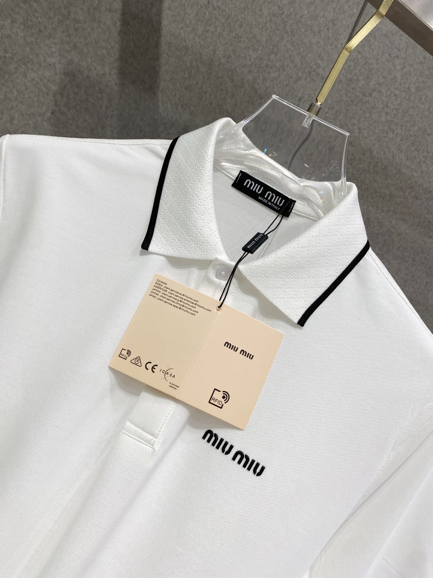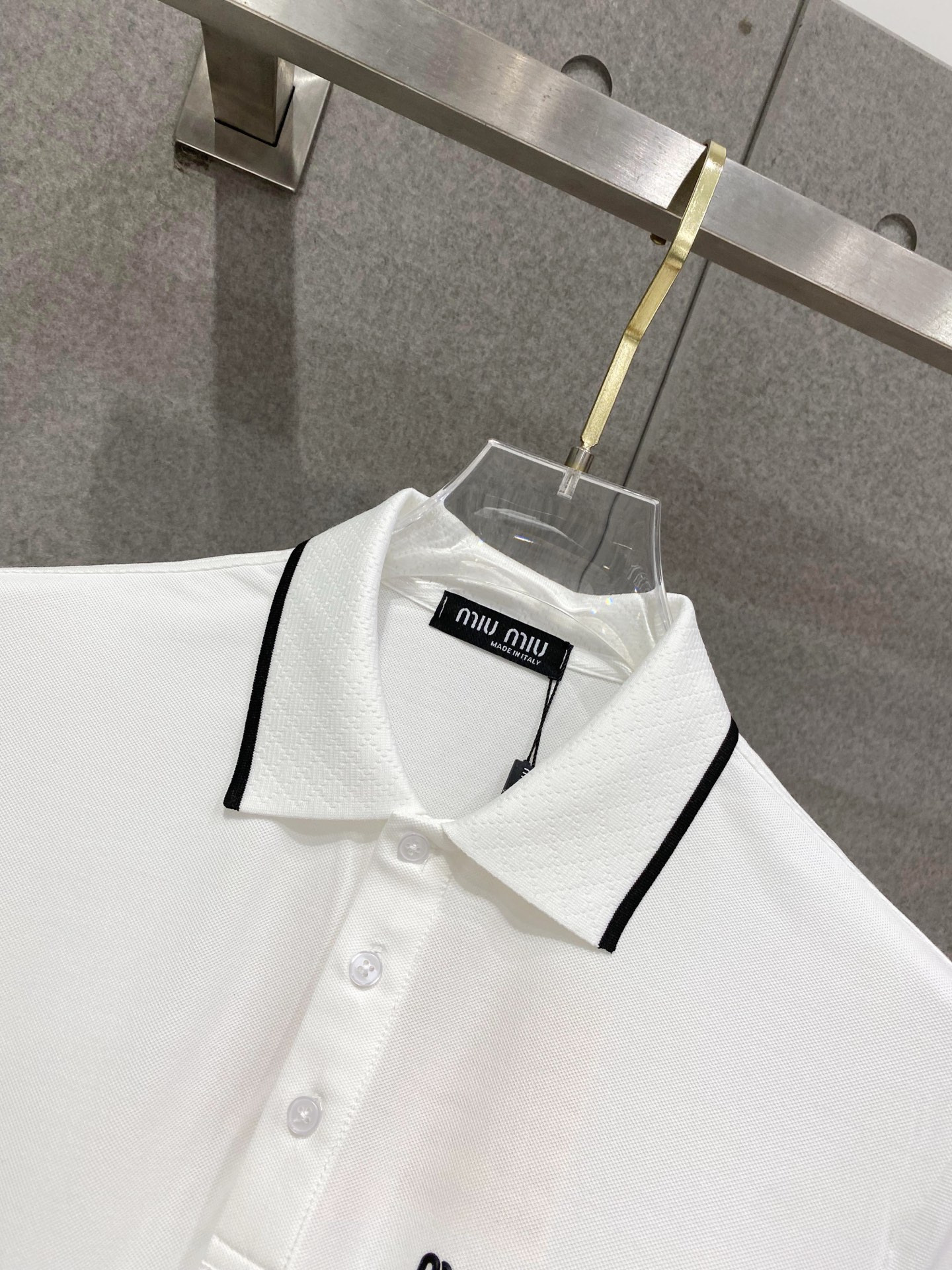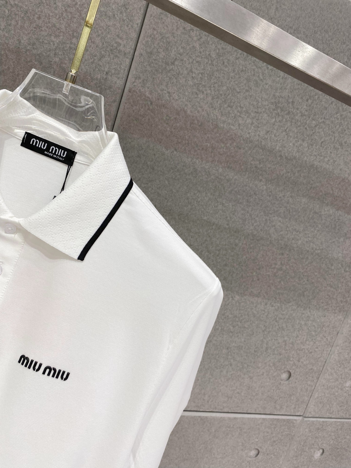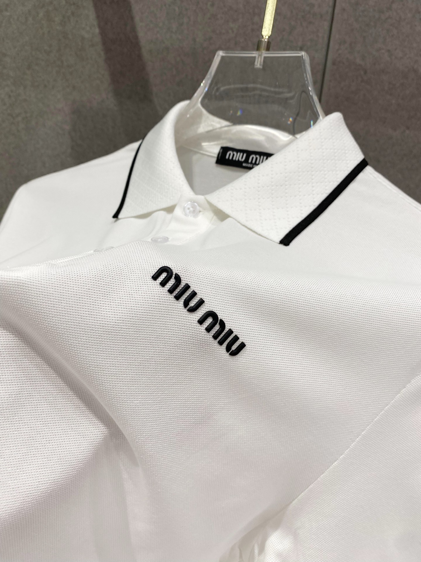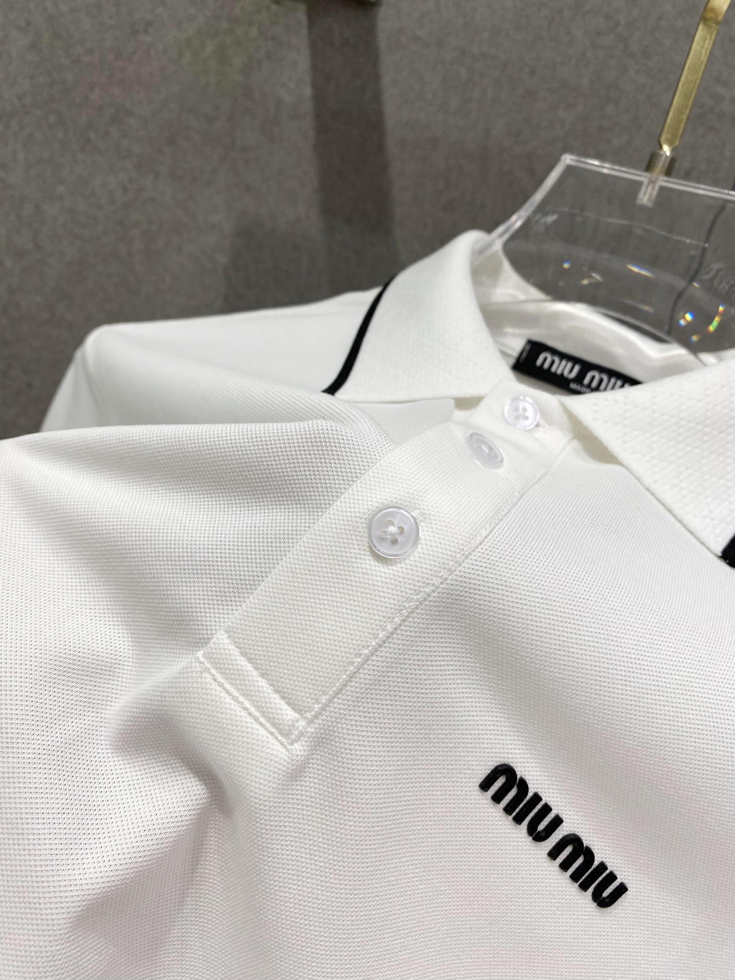 这款衣服是AAAAA 1:1 质量 (非常棒). 使用了和原版一模一样的材料. 商标部分也保持了和缪缪/Miu Miu一样. 图片拍摄是实物衣服拍摄, 您所收到的实物保证和我们图片一模一样.