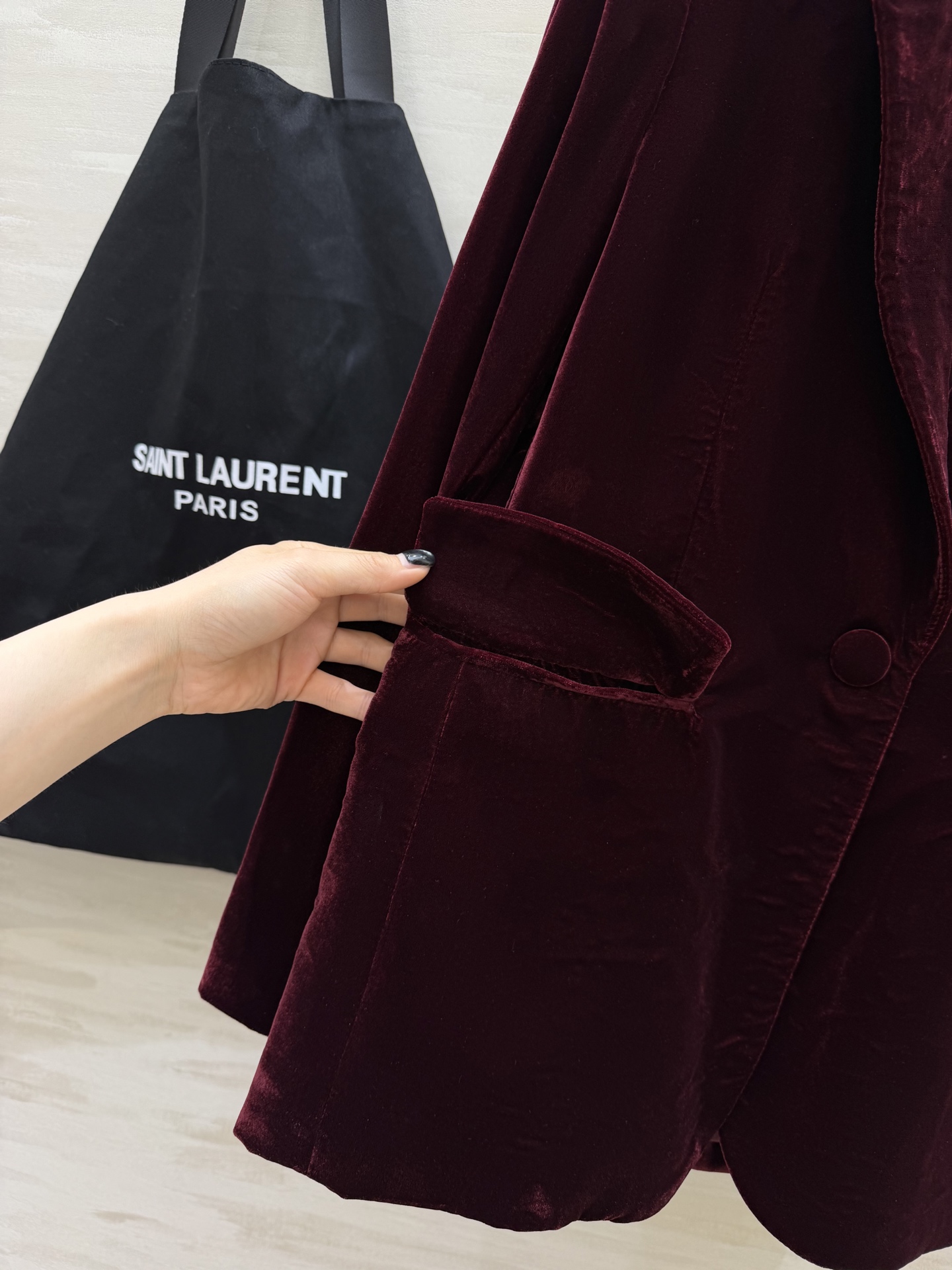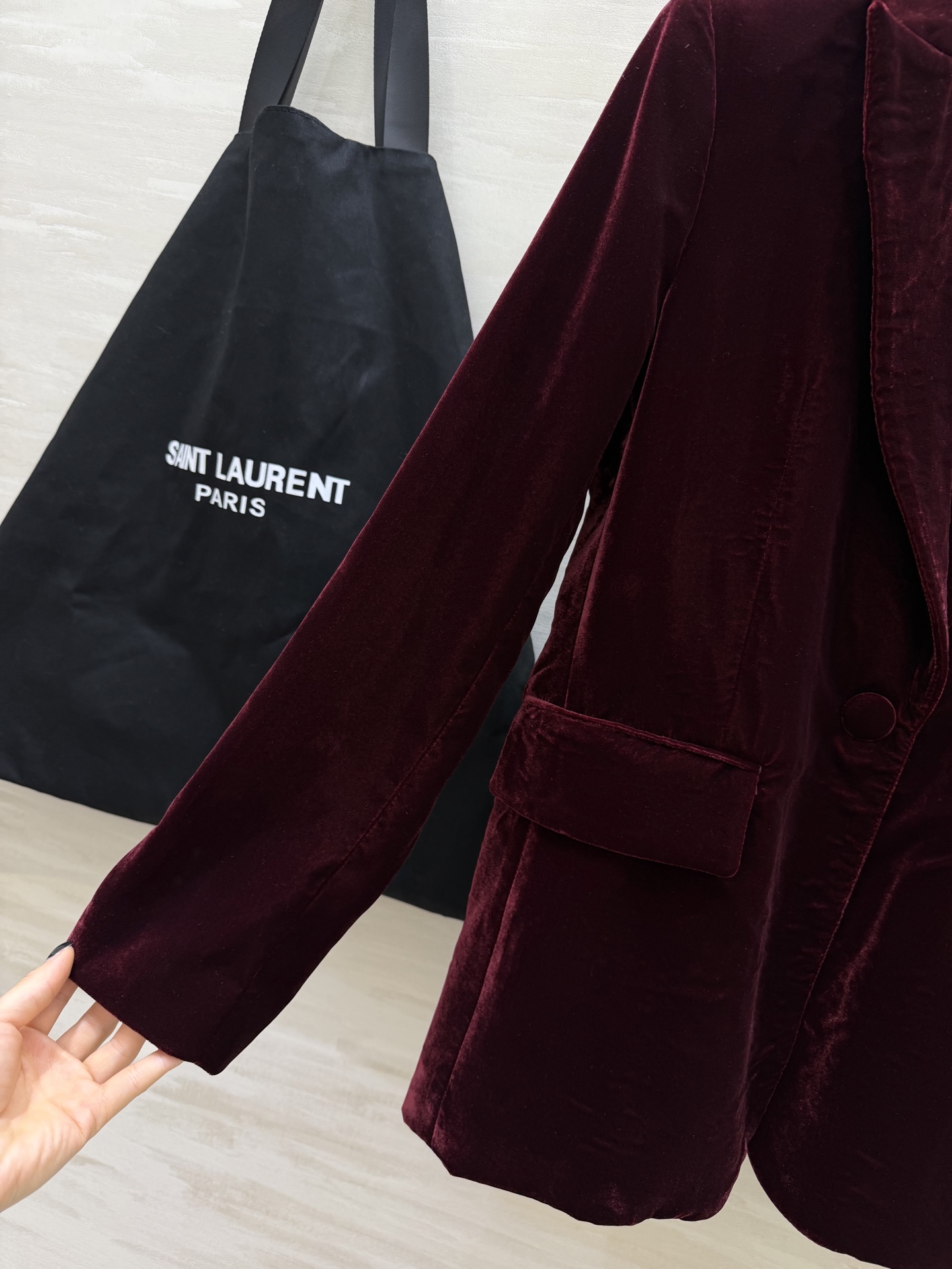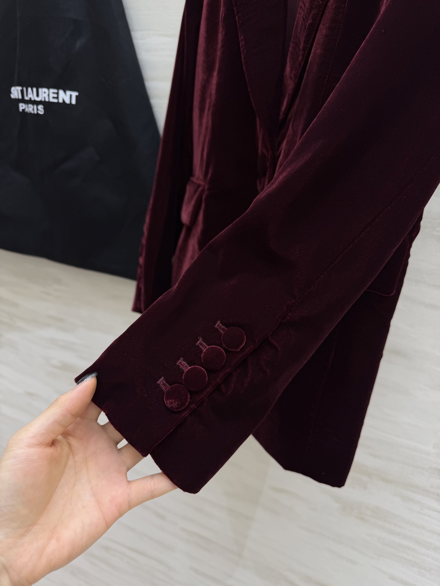 这款衣服是AAAAA 1:1 质量 (非常棒). 使用了和原版一模一样的材料. 商标部分也保持了和圣罗兰/Saint Laurent一样. 图片拍摄是实物衣服拍摄, 您所收到的实物保证和我们图片一模一样.