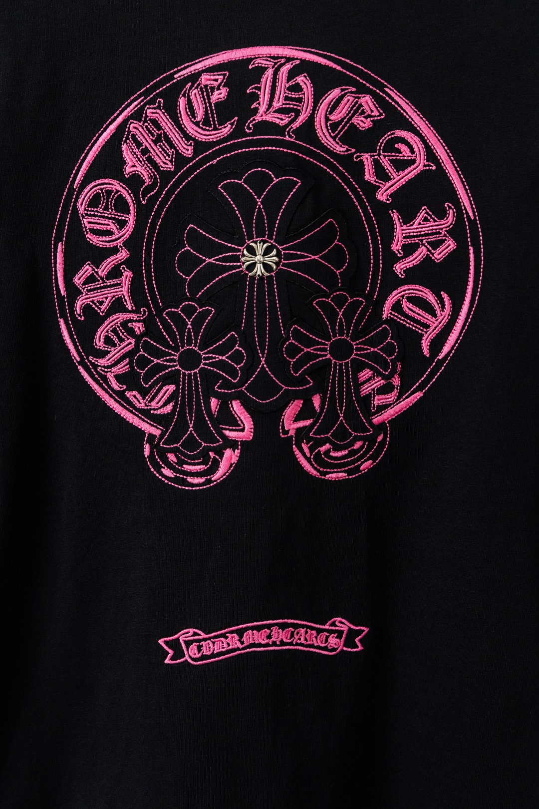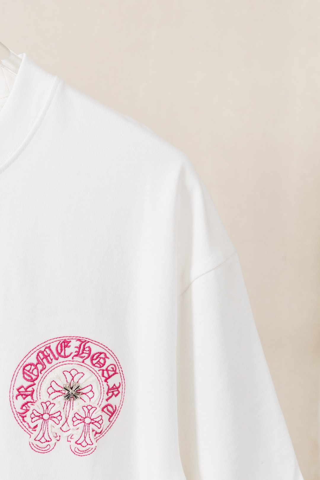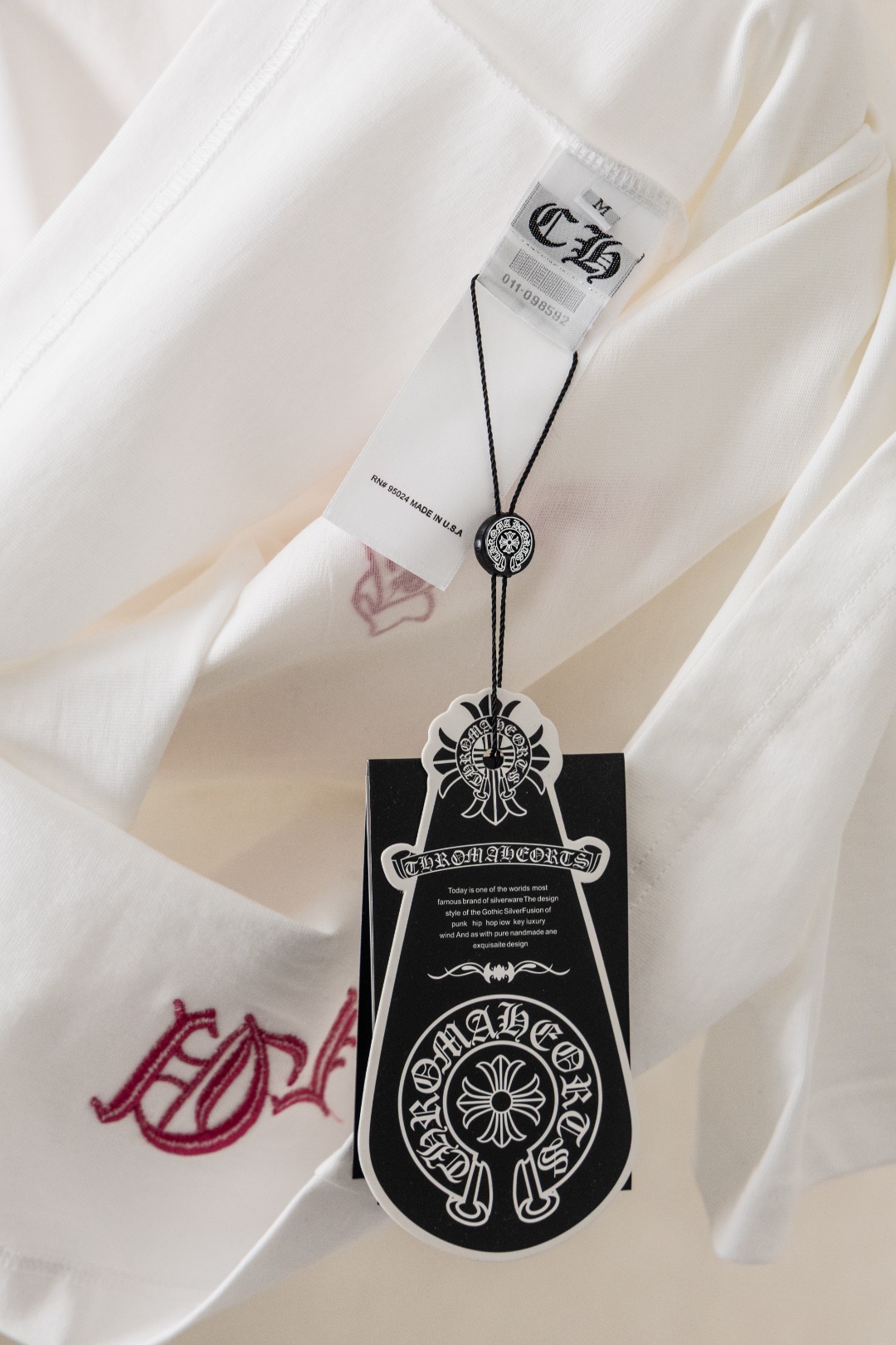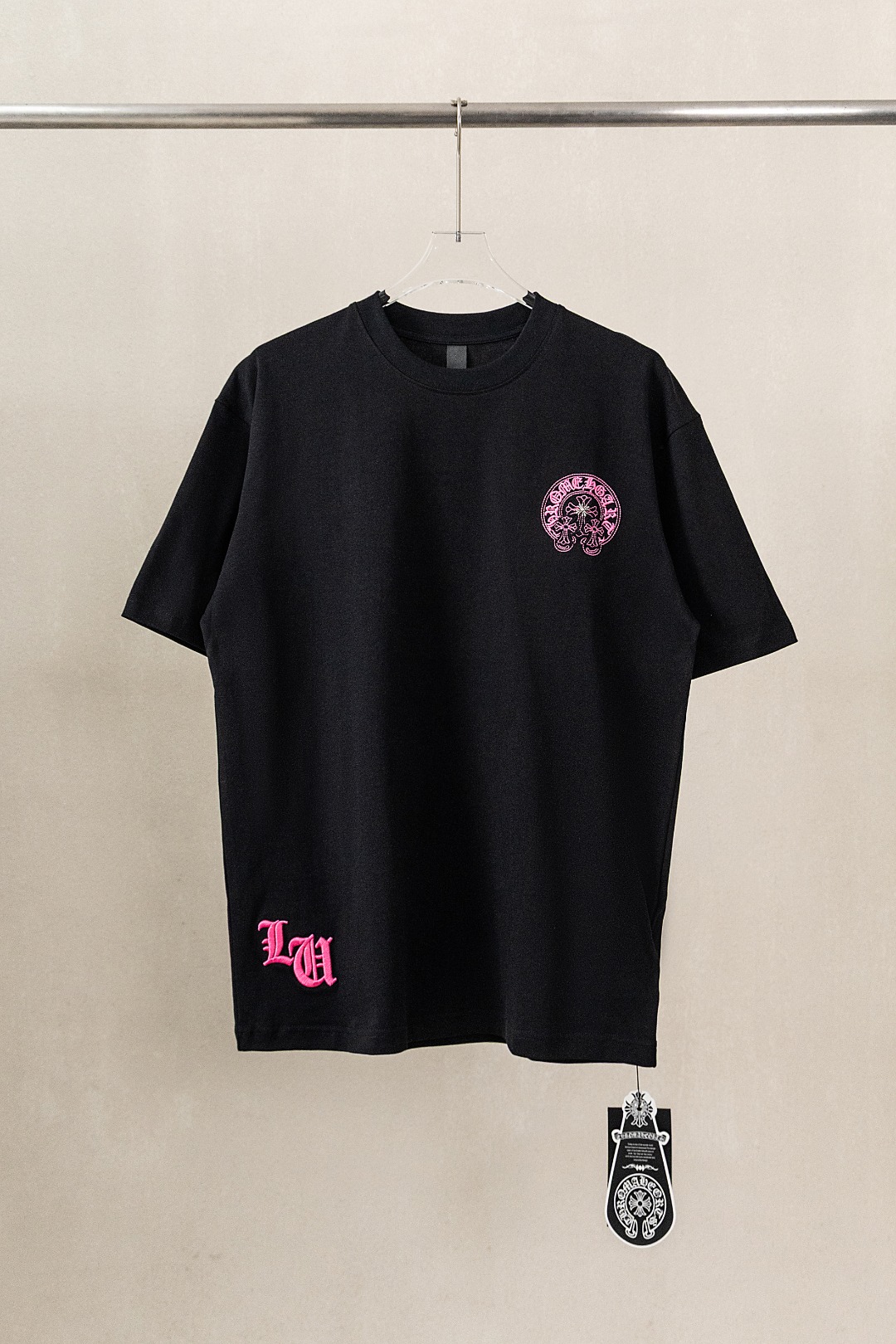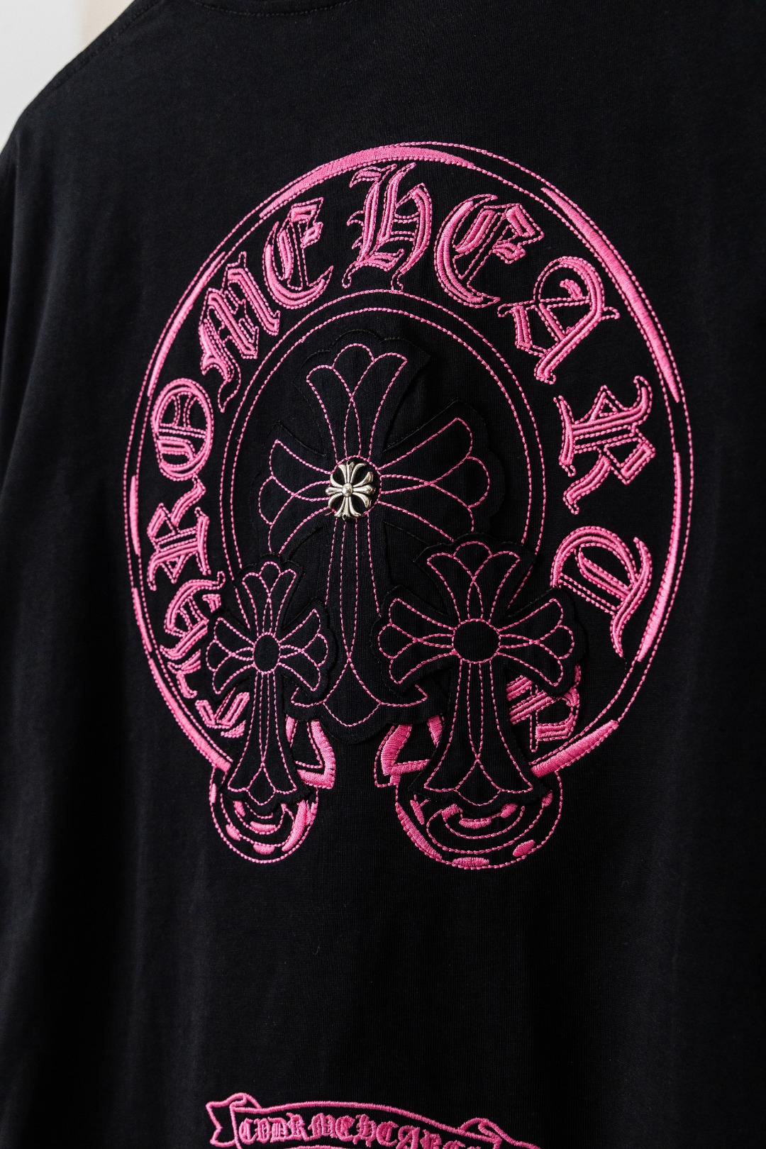 这款衣服是AAAAA 1:1 质量 (非常棒). 使用了和原版一模一样的材料. 商标部分也保持了和克罗心/Chrome Hearts一样. 图片拍摄是实物衣服拍摄, 您所收到的实物保证和我们图片一模一样.