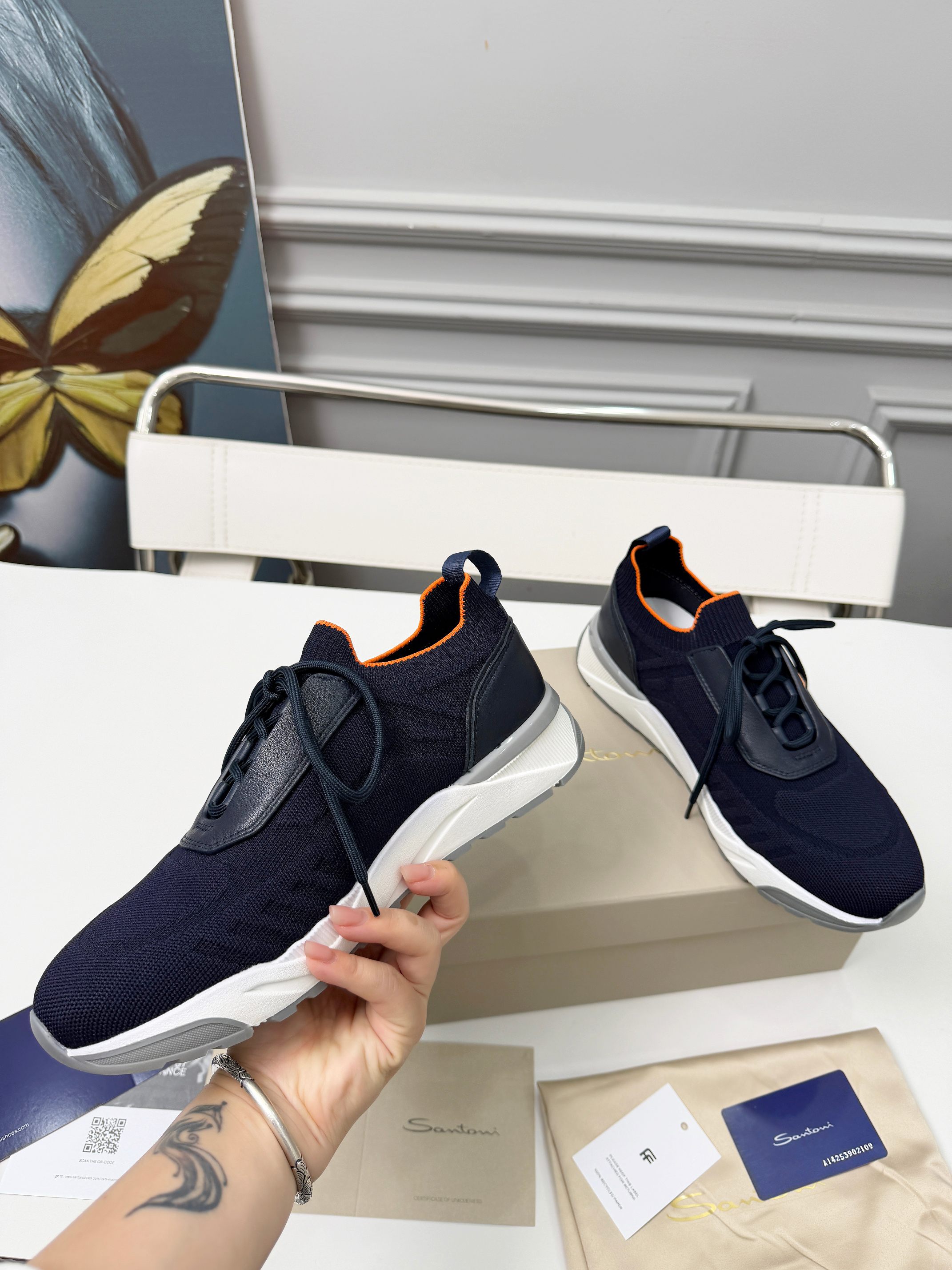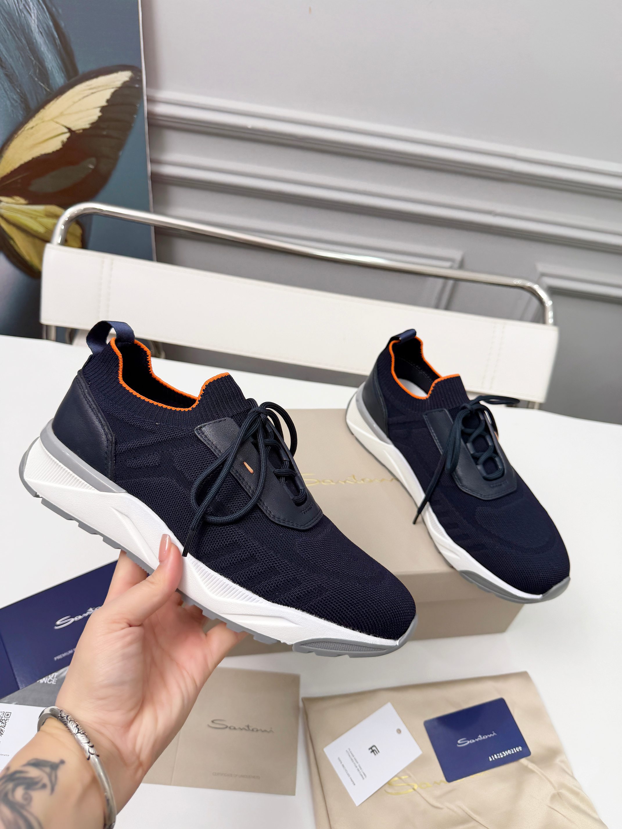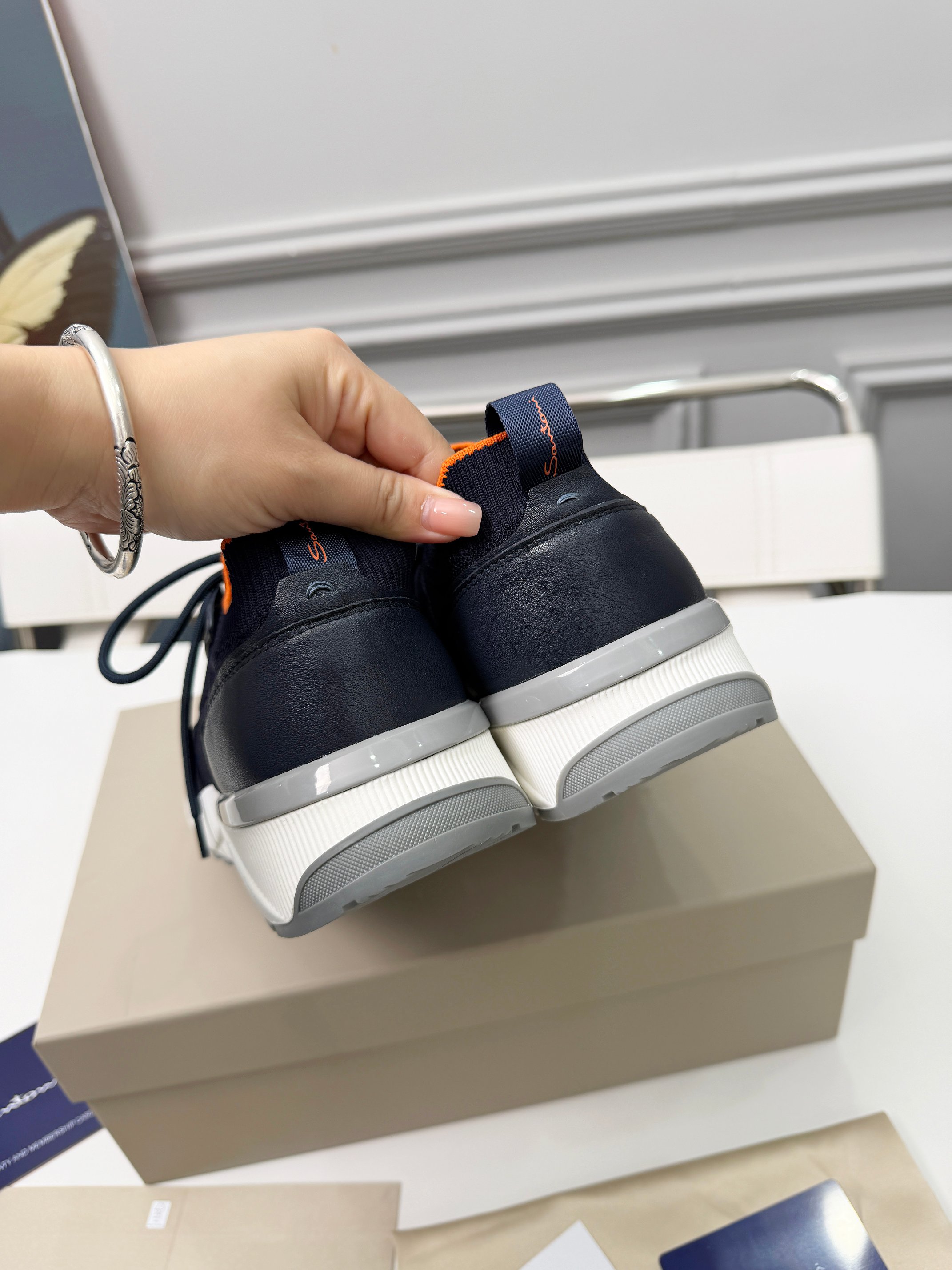 这款鞋子是AAAAA 1:1 质量 (非常棒). 使用了和原版一模一样的材料. 商标部分也保持了和Santoni一样. 图片拍摄是实物鞋子拍摄, 您所收到的实物保证和我们图片一模一样.