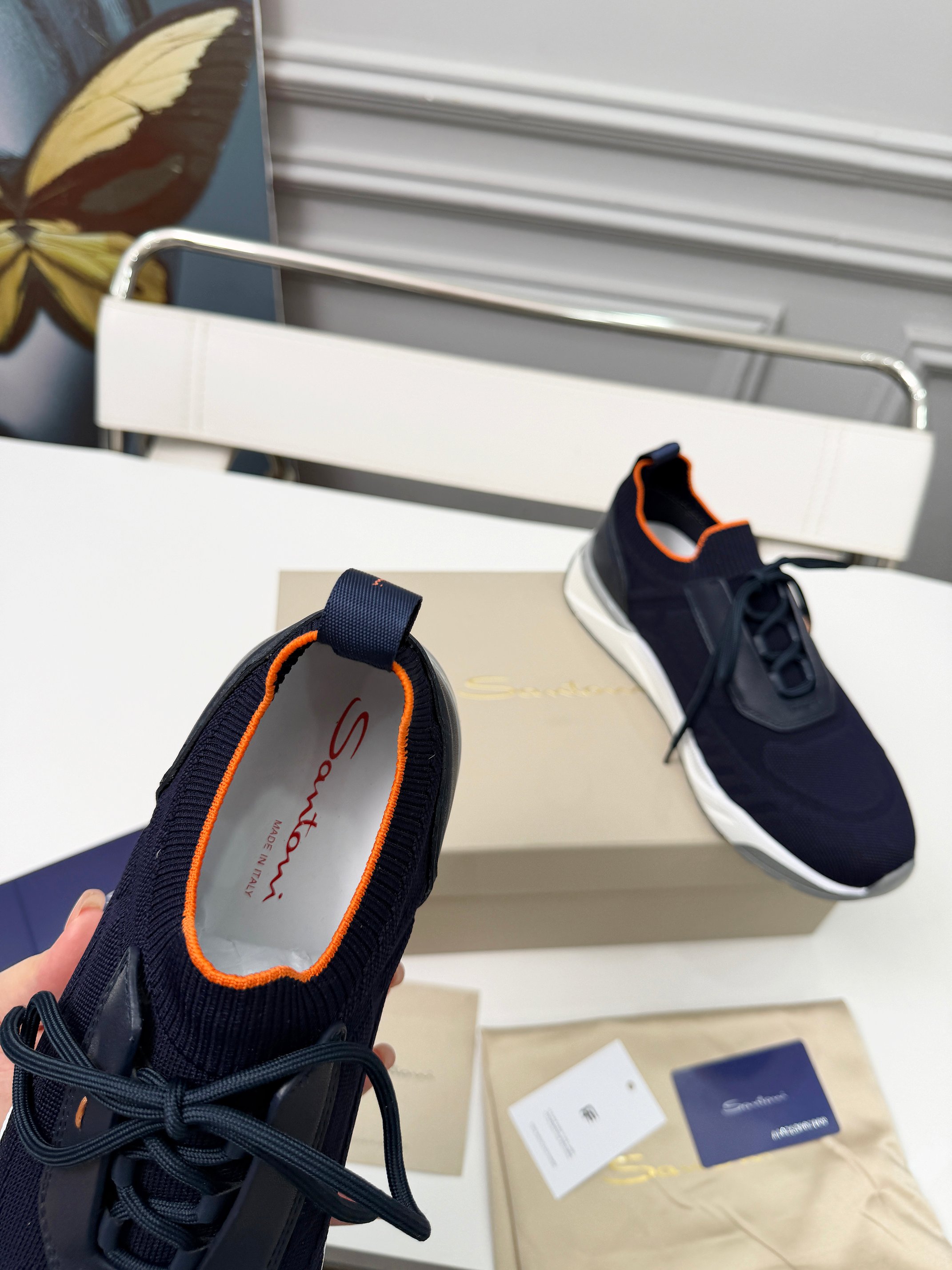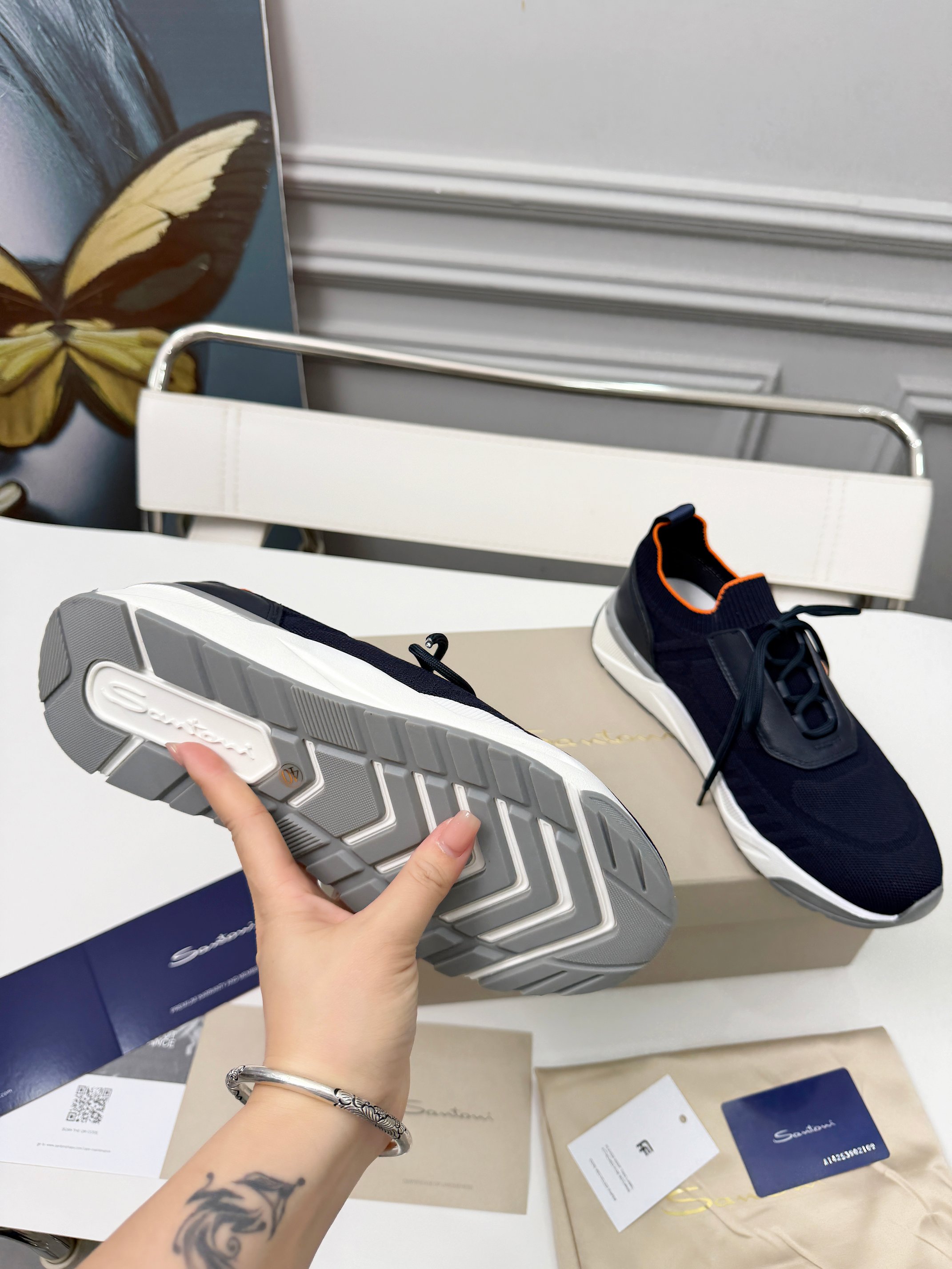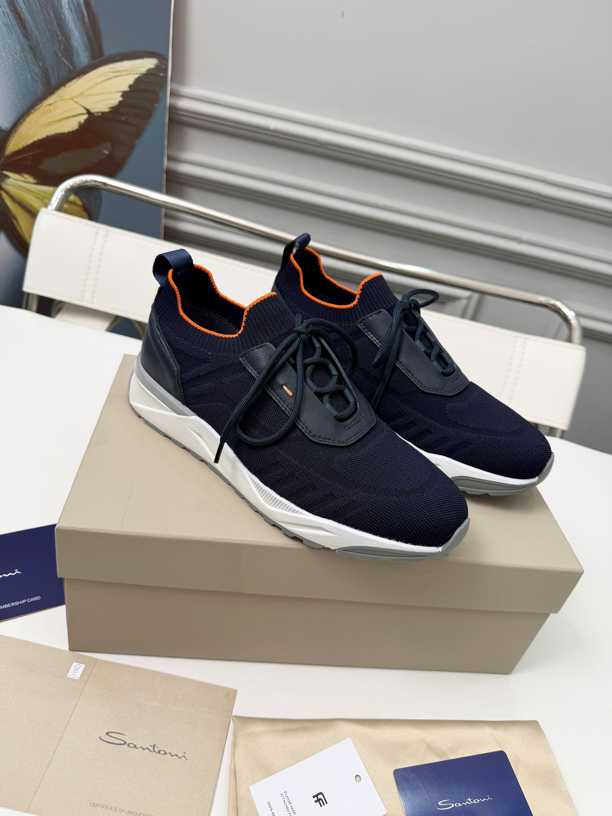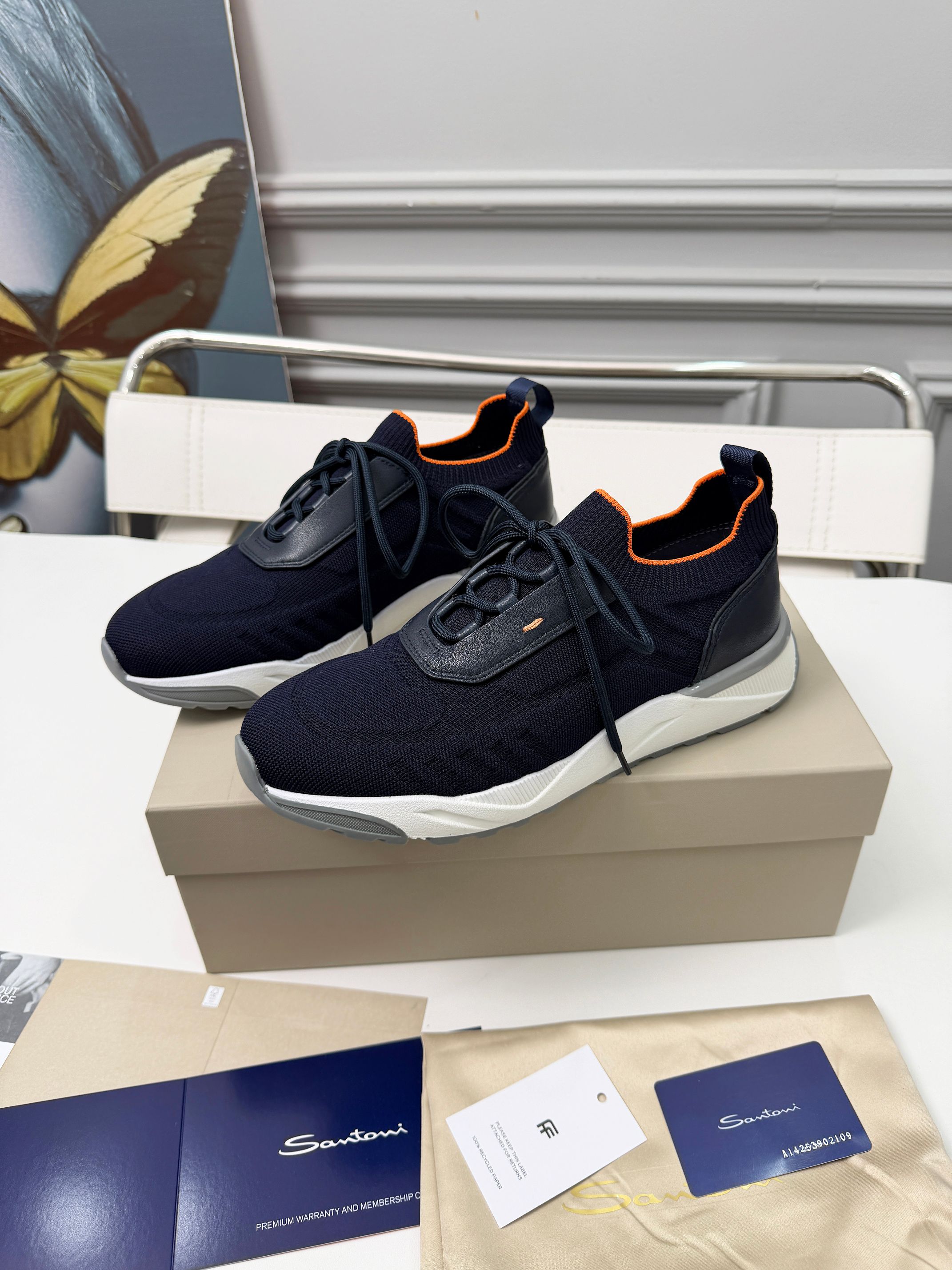 这款鞋子是AAAAA 1:1 质量 (非常棒). 使用了和原版一模一样的材料. 商标部分也保持了和Santoni一样. 图片拍摄是实物鞋子拍摄, 您所收到的实物保证和我们图片一模一样.