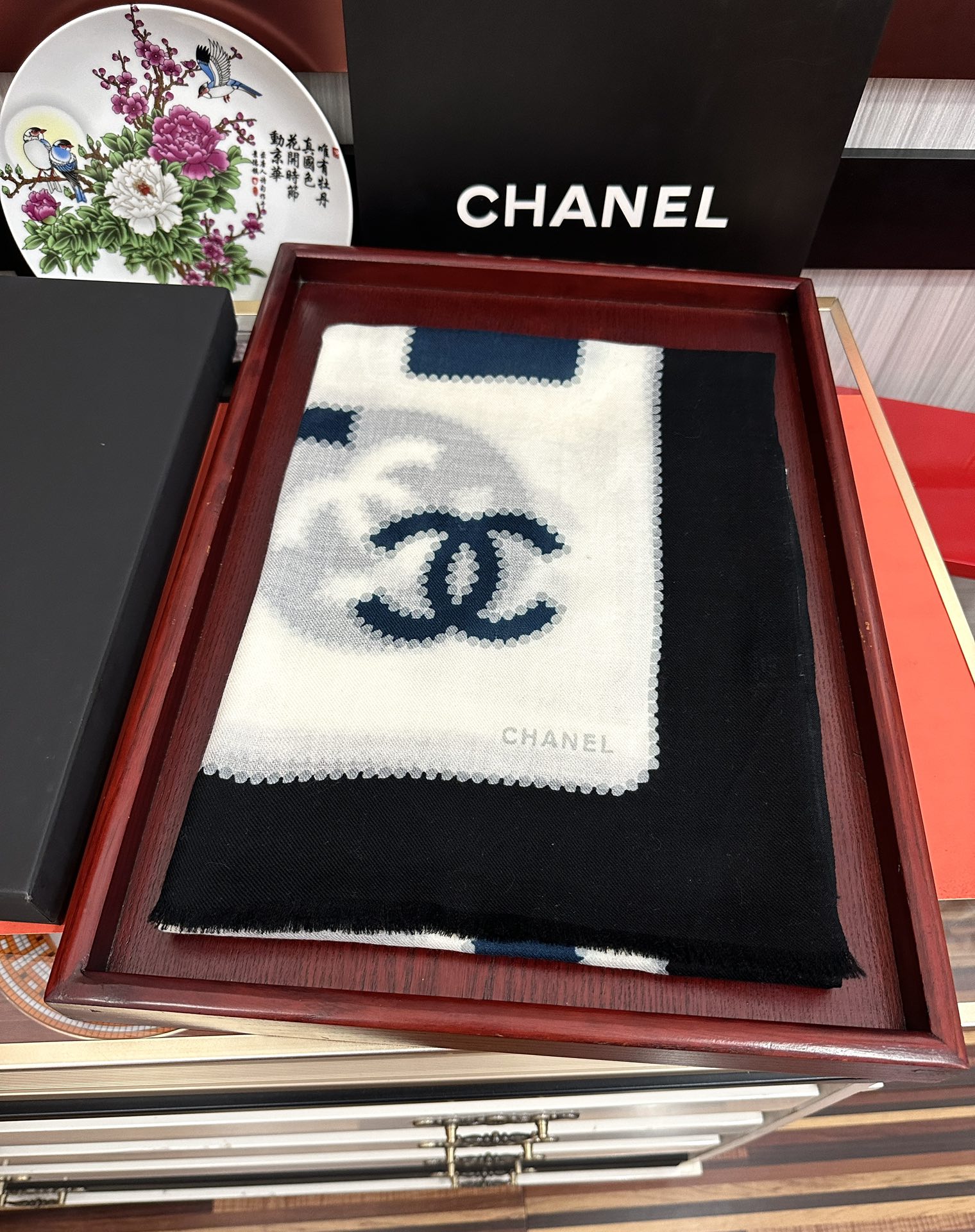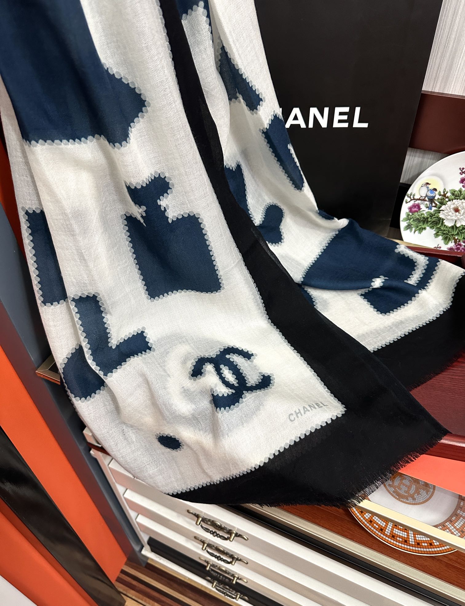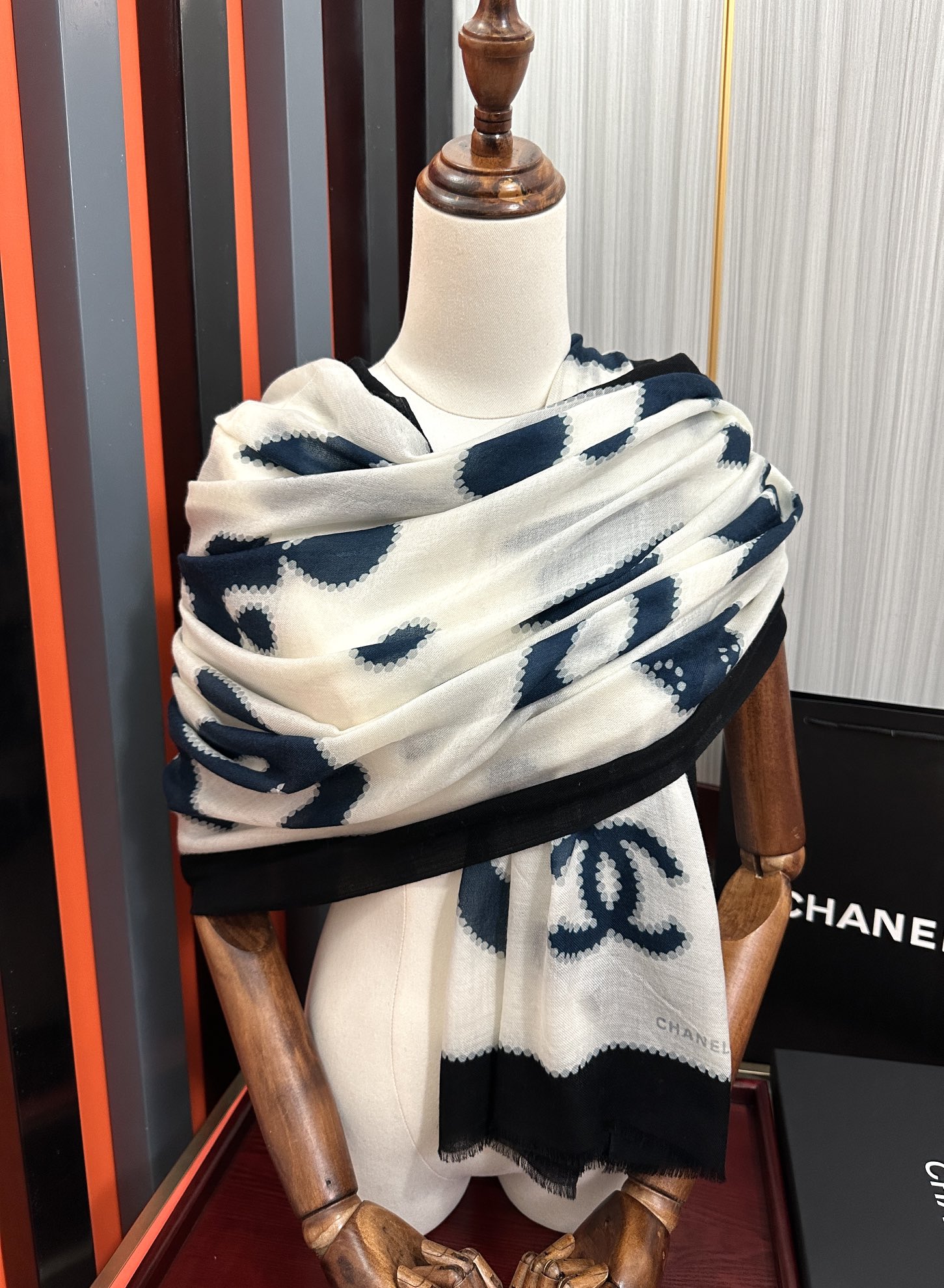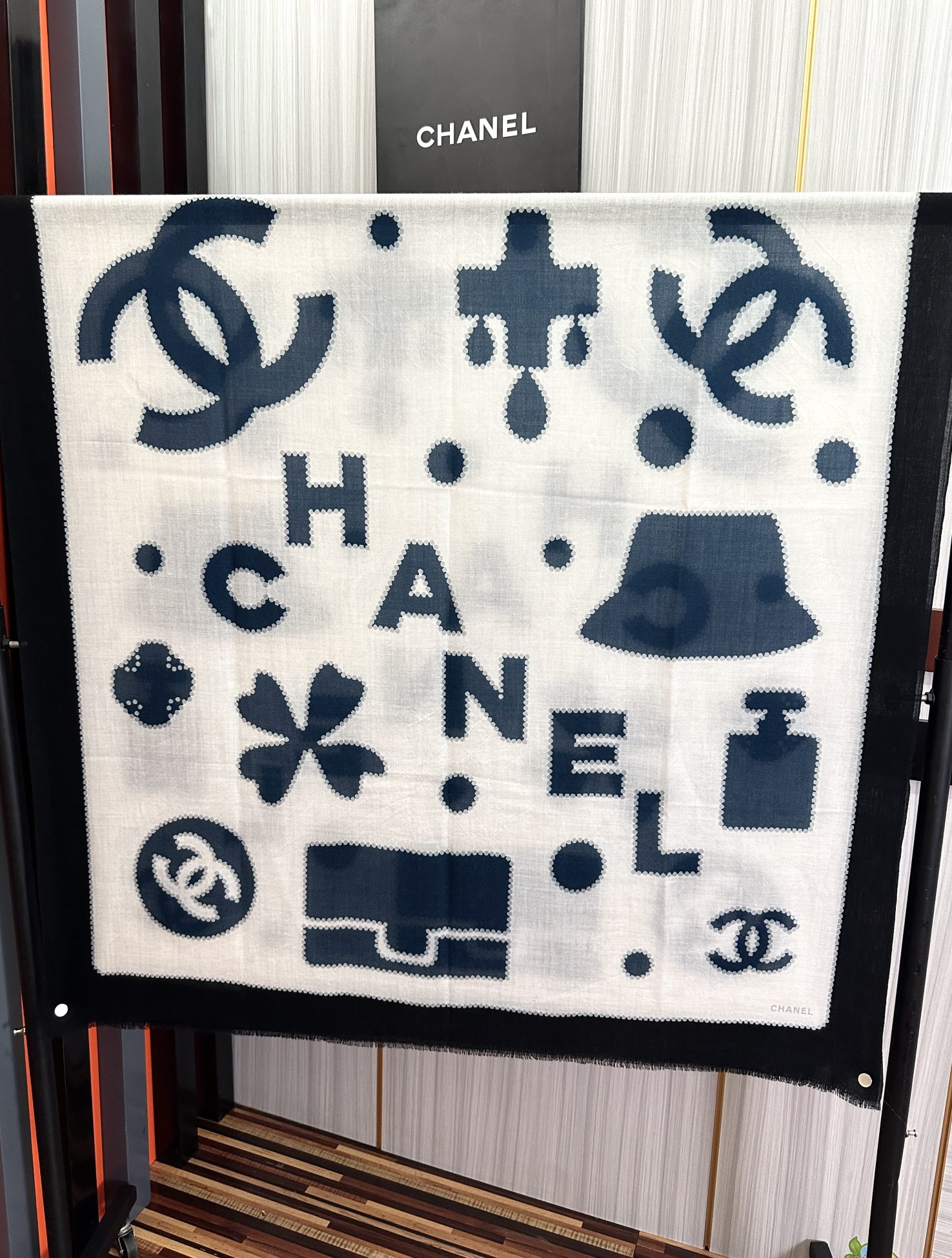这款围巾是AAAAA 1:1 质量 (非常棒). 使用了和原版一模一样的材料. 商标部分也保持了和香奈儿/Chanel一样. 图片拍摄是实物围巾拍摄, 您所收到的实物保证和我们图片一模一样.