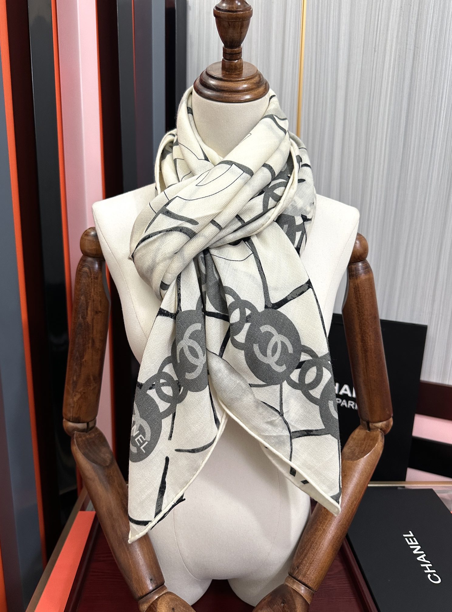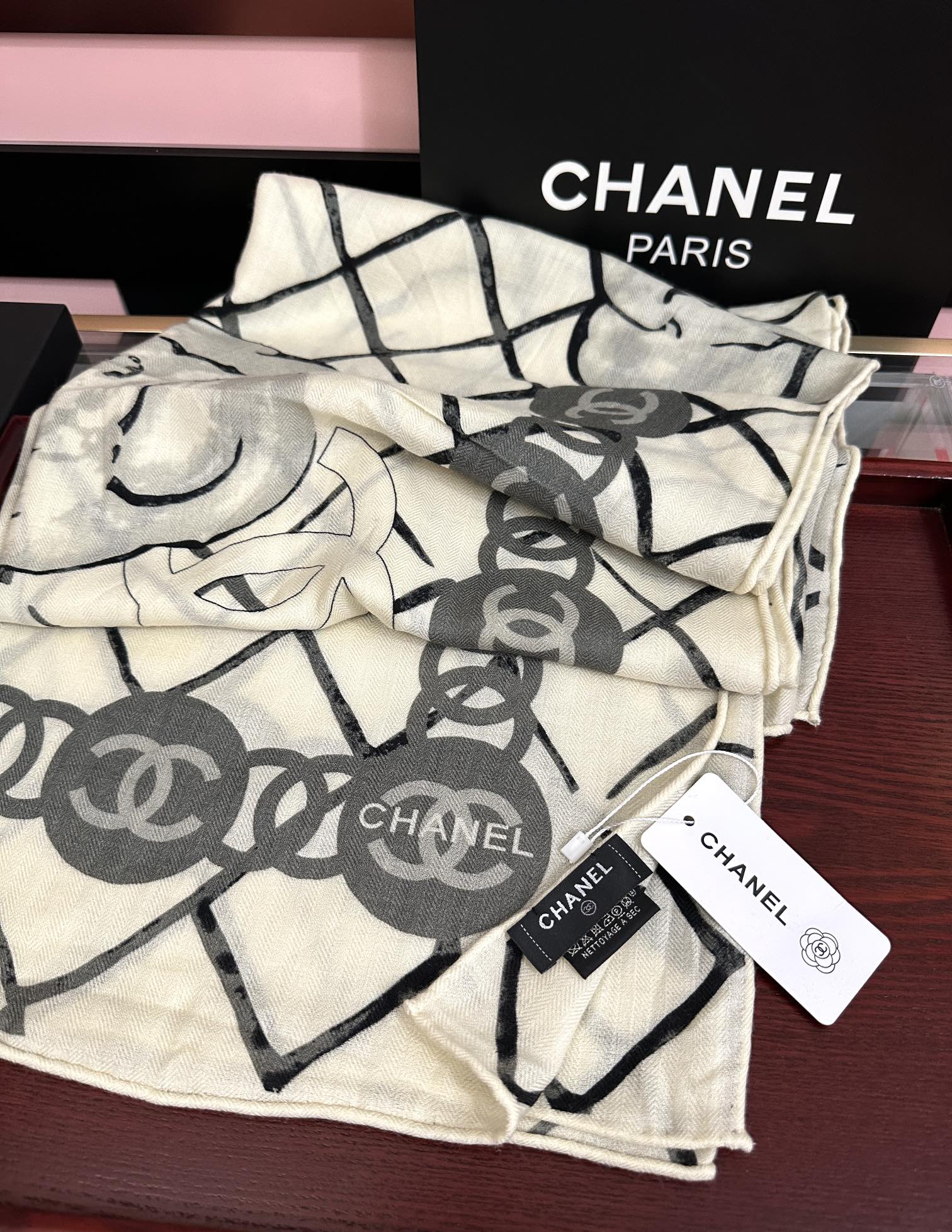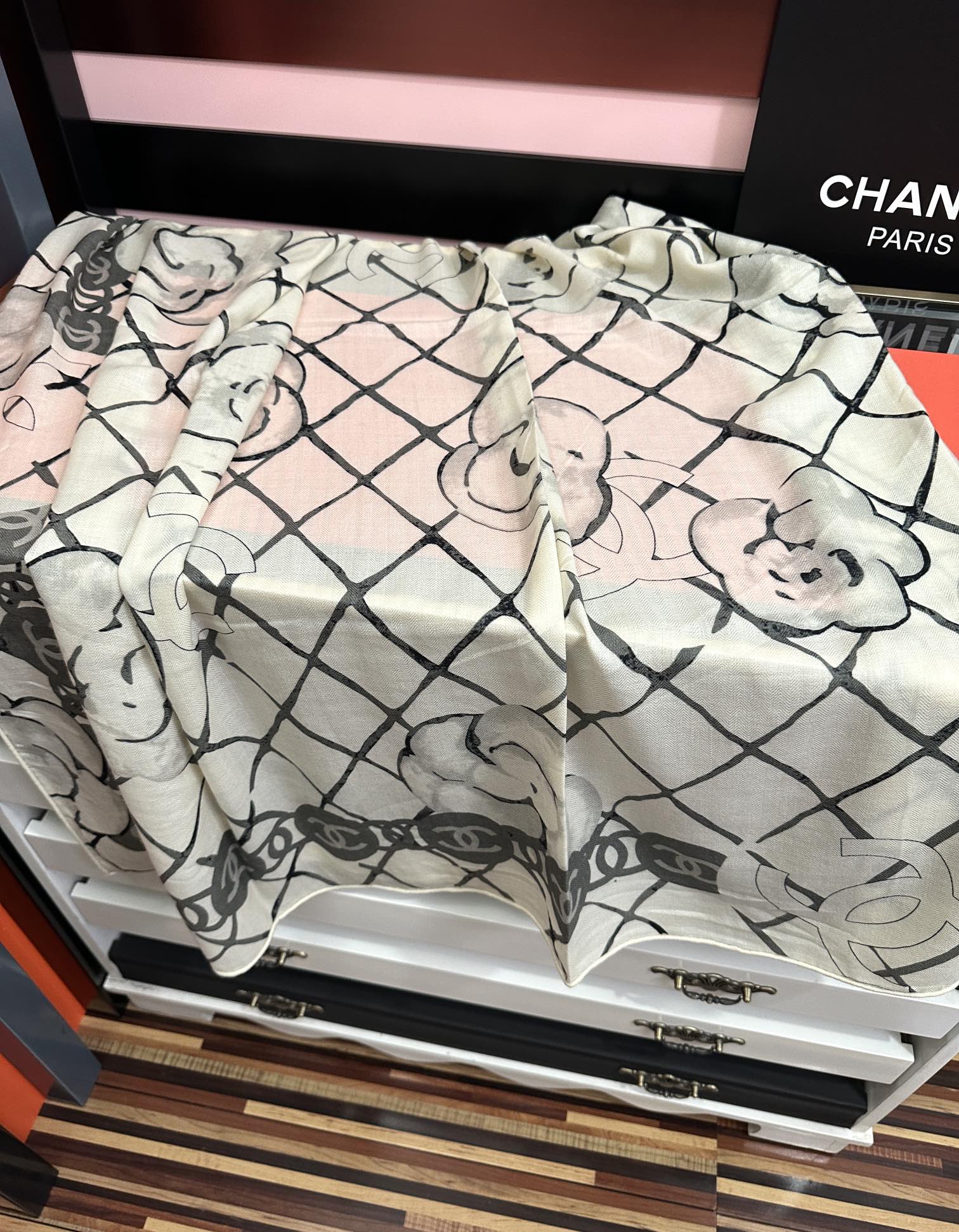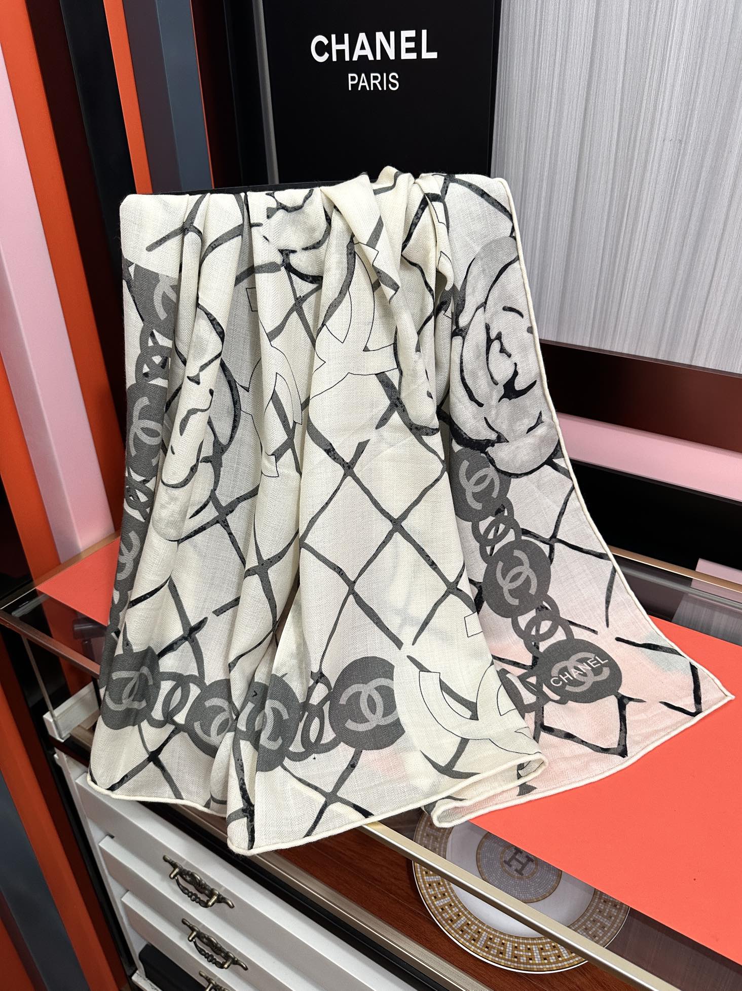 这款围巾是AAAAA 1:1 质量 (非常棒). 使用了和原版一模一样的材料. 商标部分也保持了和香奈儿/Chanel一样. 图片拍摄是实物围巾拍摄, 您所收到的实物保证和我们图片一模一样.