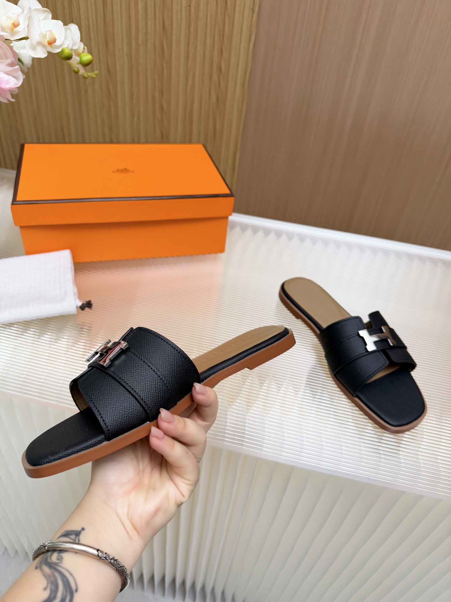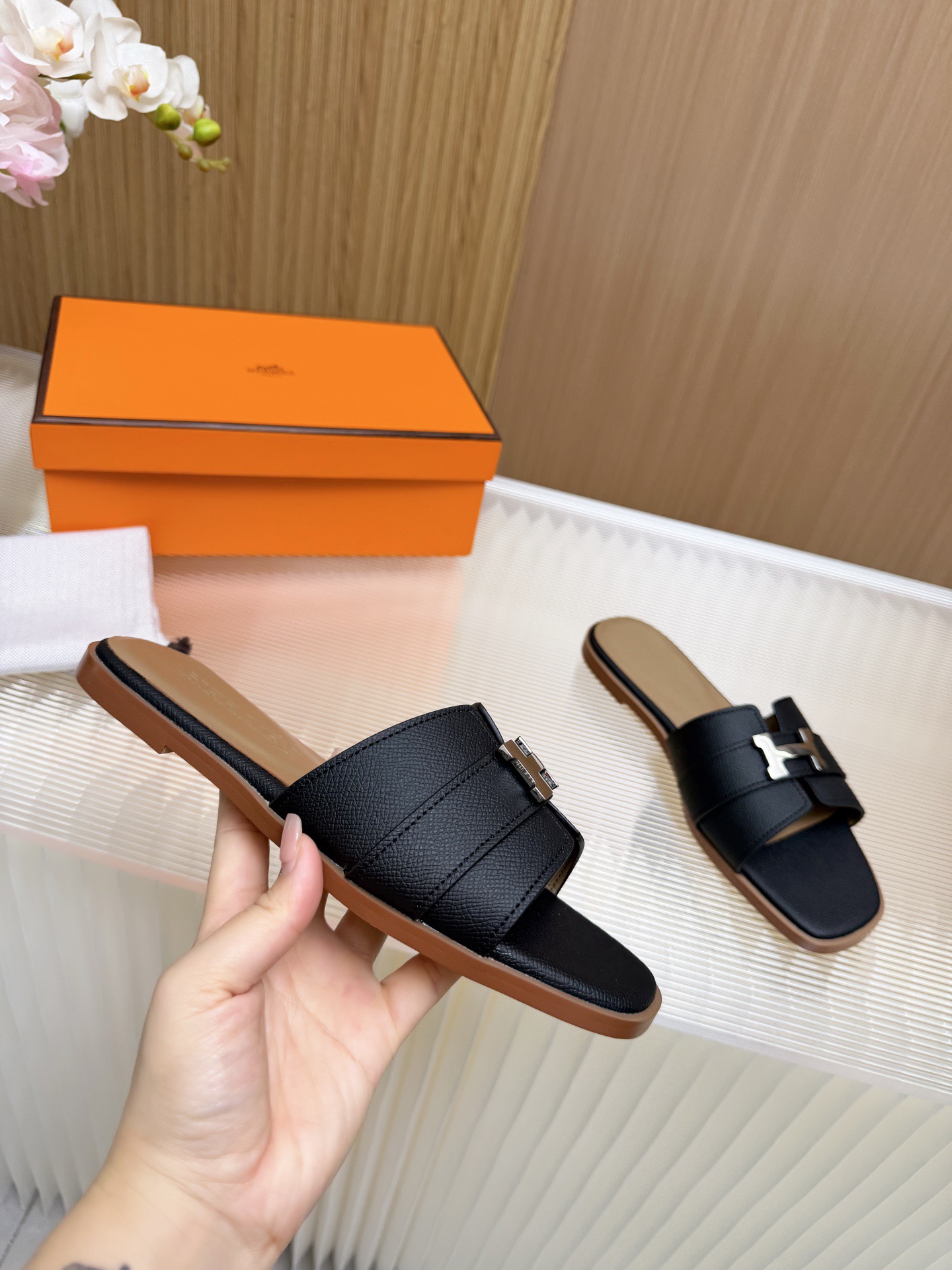 这款鞋子是AAAAA 1:1 质量 (非常棒). 使用了和原版一模一样的材料. 商标部分也保持了和爱马仕/Hermes一样. 图片拍摄是实物鞋子拍摄, 您所收到的实物保证和我们图片一模一样.