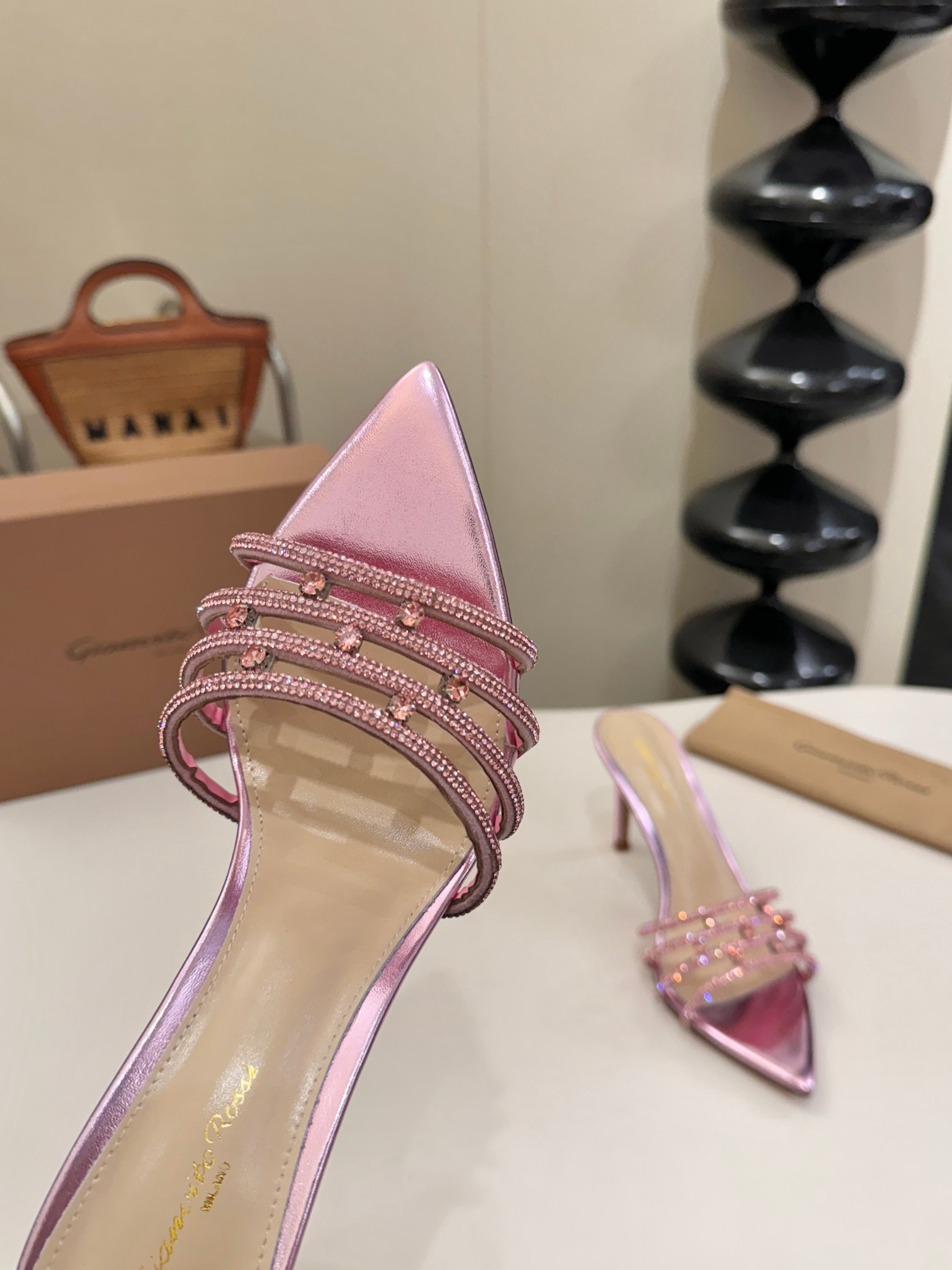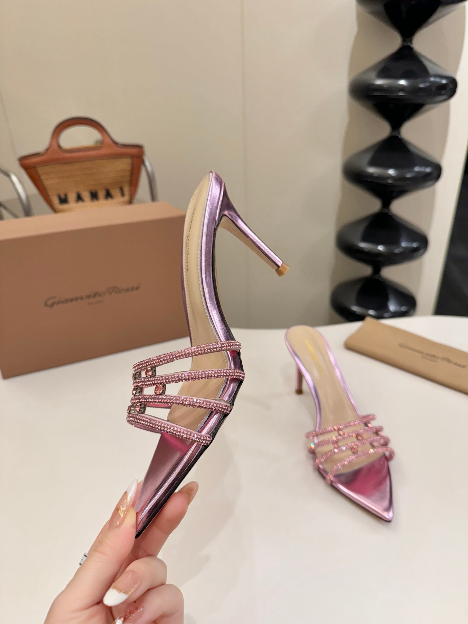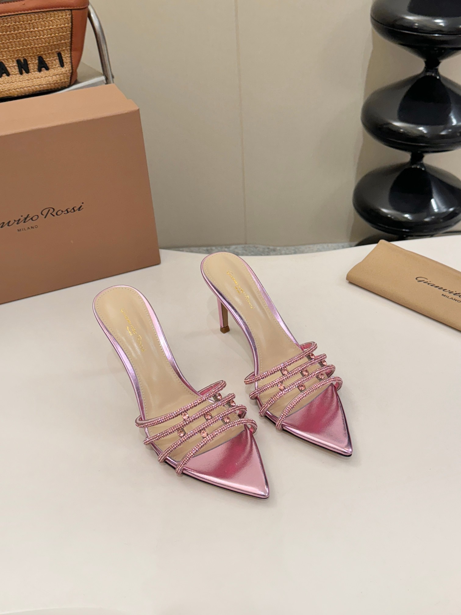 这款鞋子是AAAAA 1:1 质量 (非常棒). 使用了和原版一模一样的材料. 商标部分也保持了和Gianvito Rossi一样. 图片拍摄是实物鞋子拍摄, 您所收到的实物保证和我们图片一模一样.