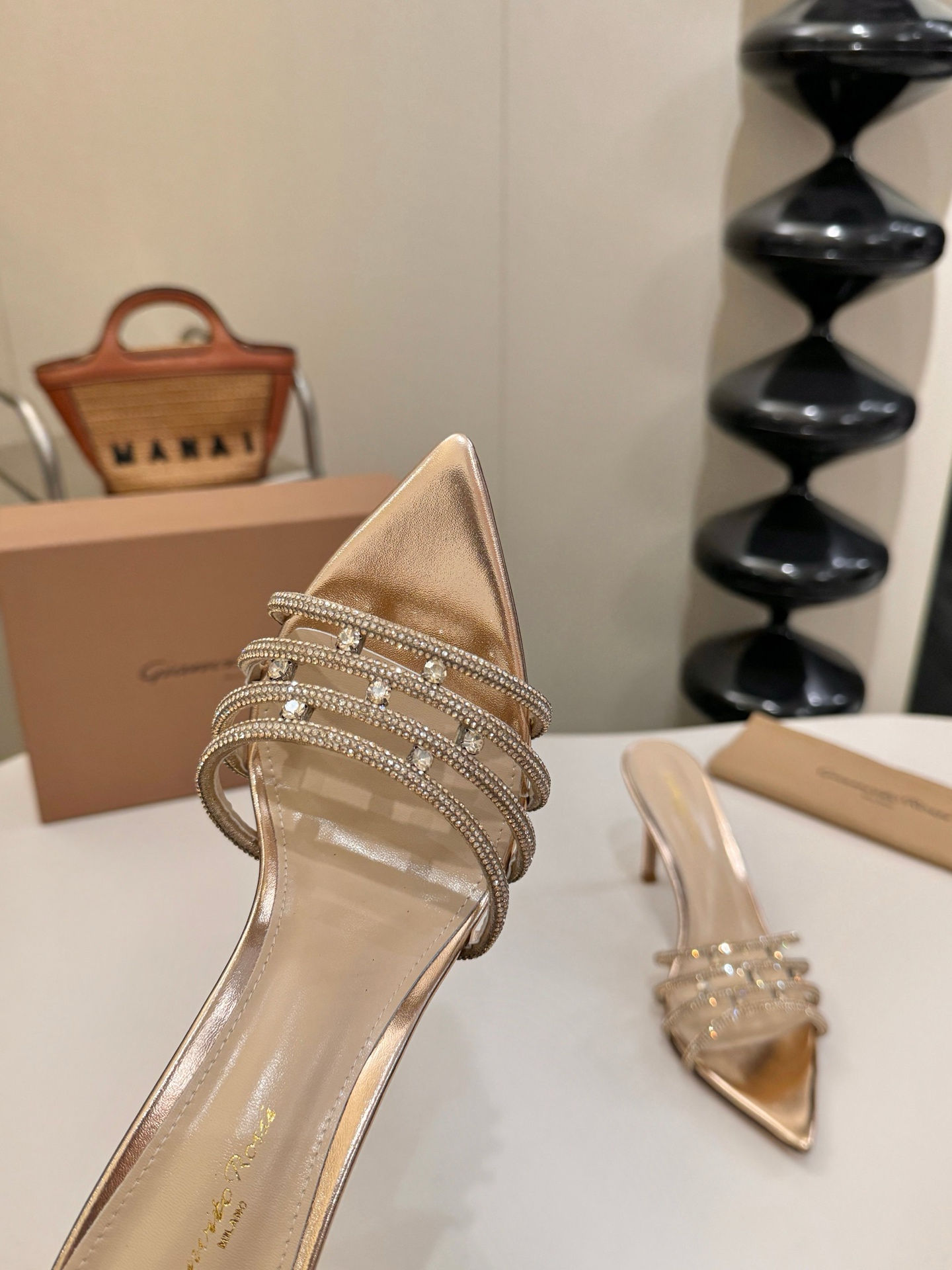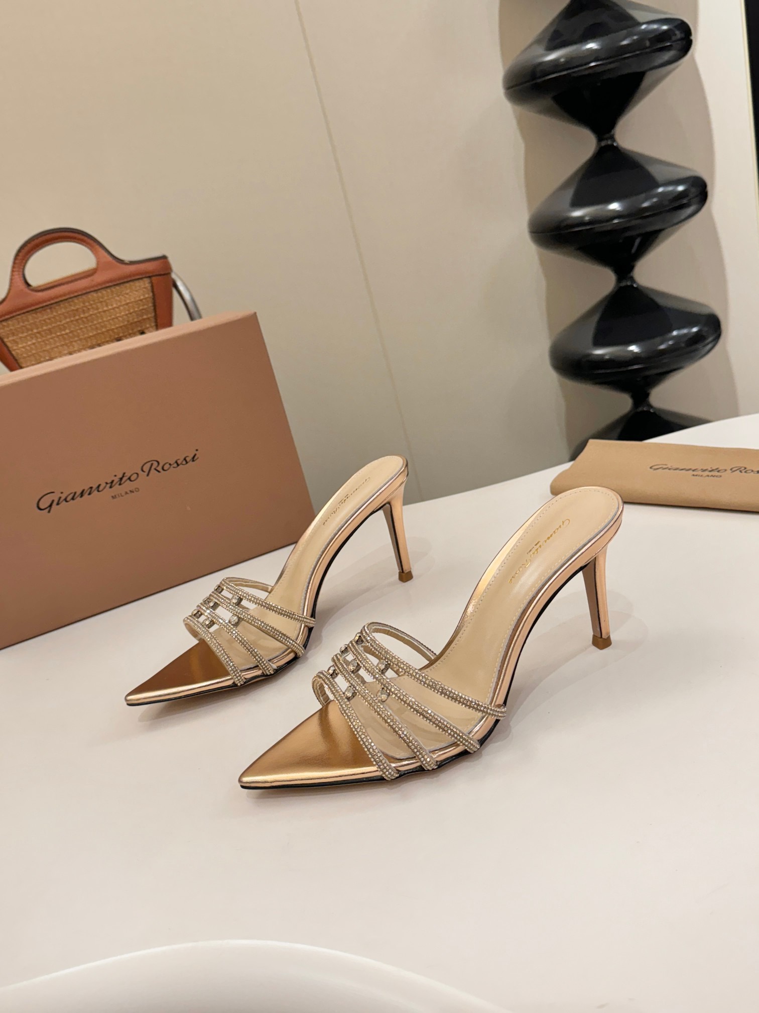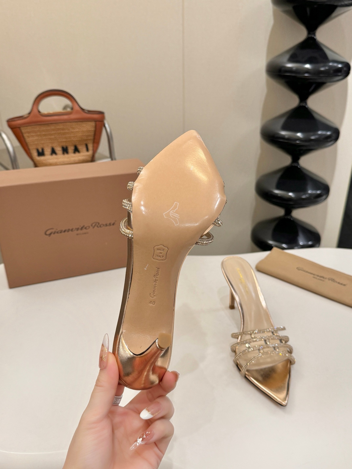这款鞋子是AAAAA 1:1 质量 (非常棒). 使用了和原版一模一样的材料. 商标部分也保持了和Gianvito Rossi一样. 图片拍摄是实物鞋子拍摄, 您所收到的实物保证和我们图片一模一样.
