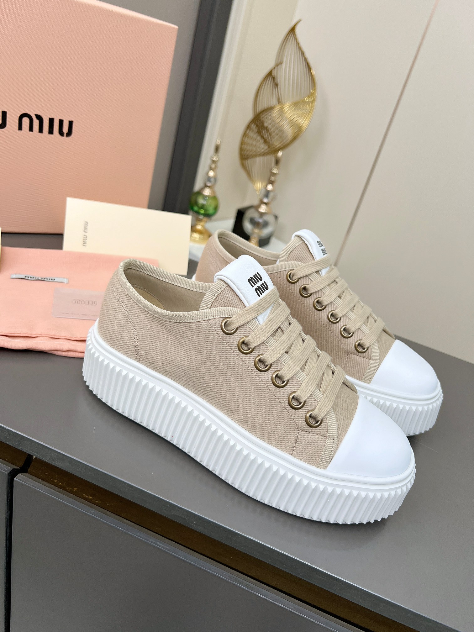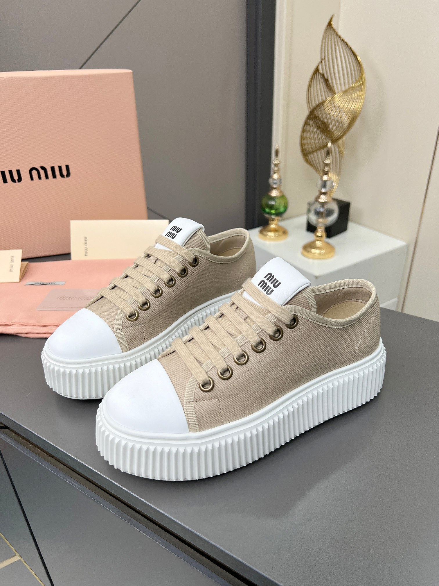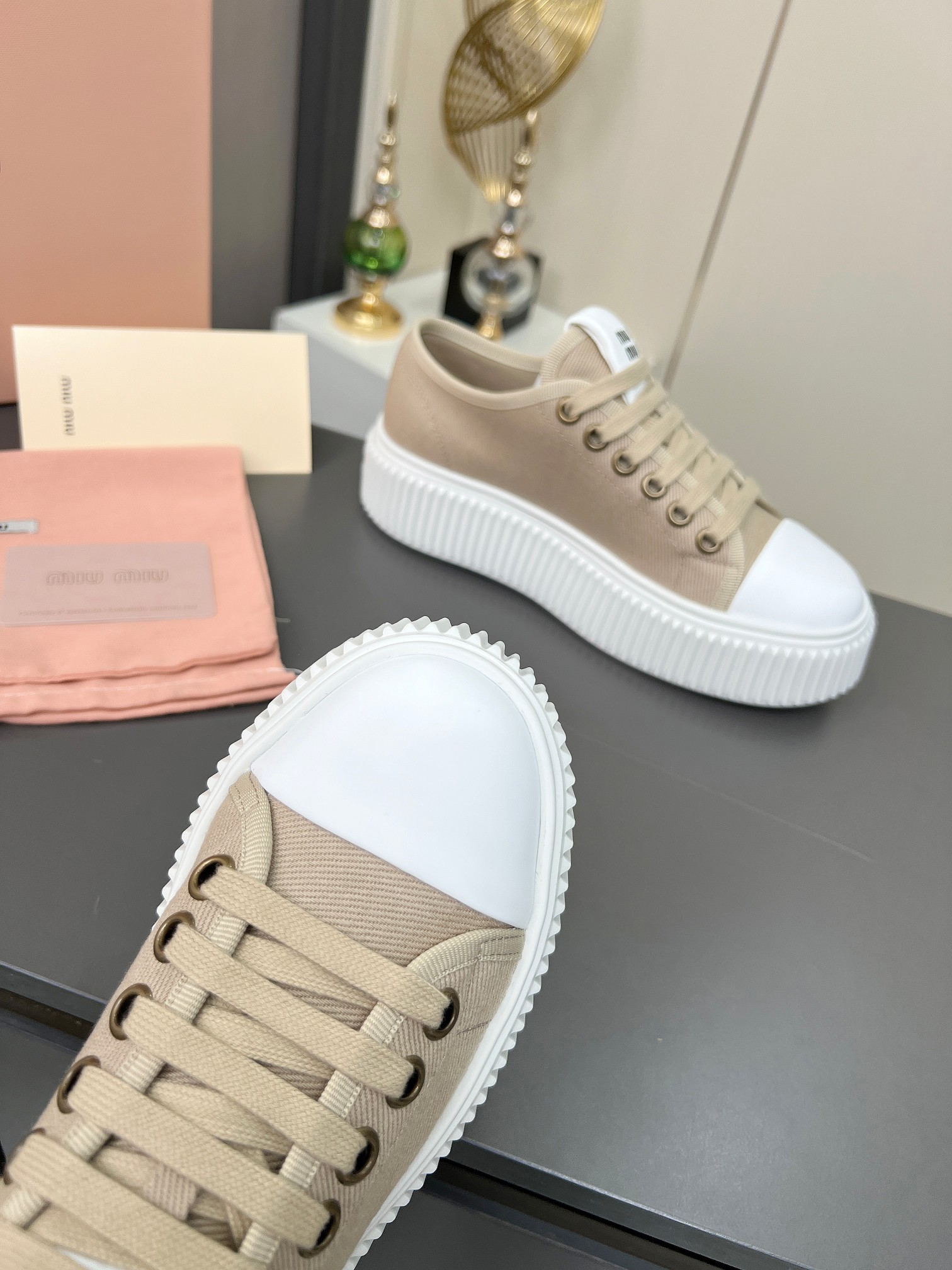 这款鞋子是AAAAA 1:1 质量 (非常棒). 使用了和原版一模一样的材料. 商标部分也保持了和缪缪/Miu Miu一样. 图片拍摄是实物鞋子拍摄, 您所收到的实物保证和我们图片一模一样.