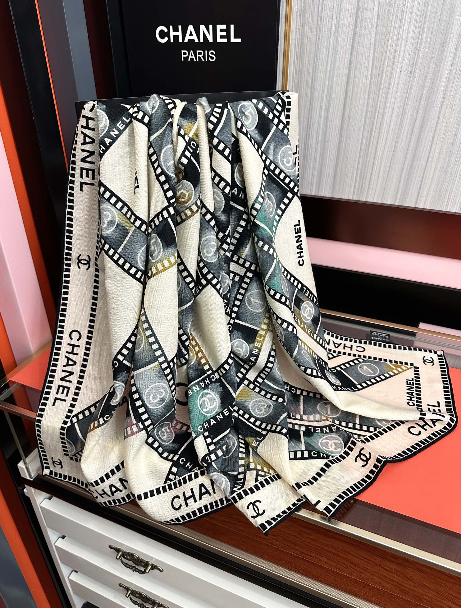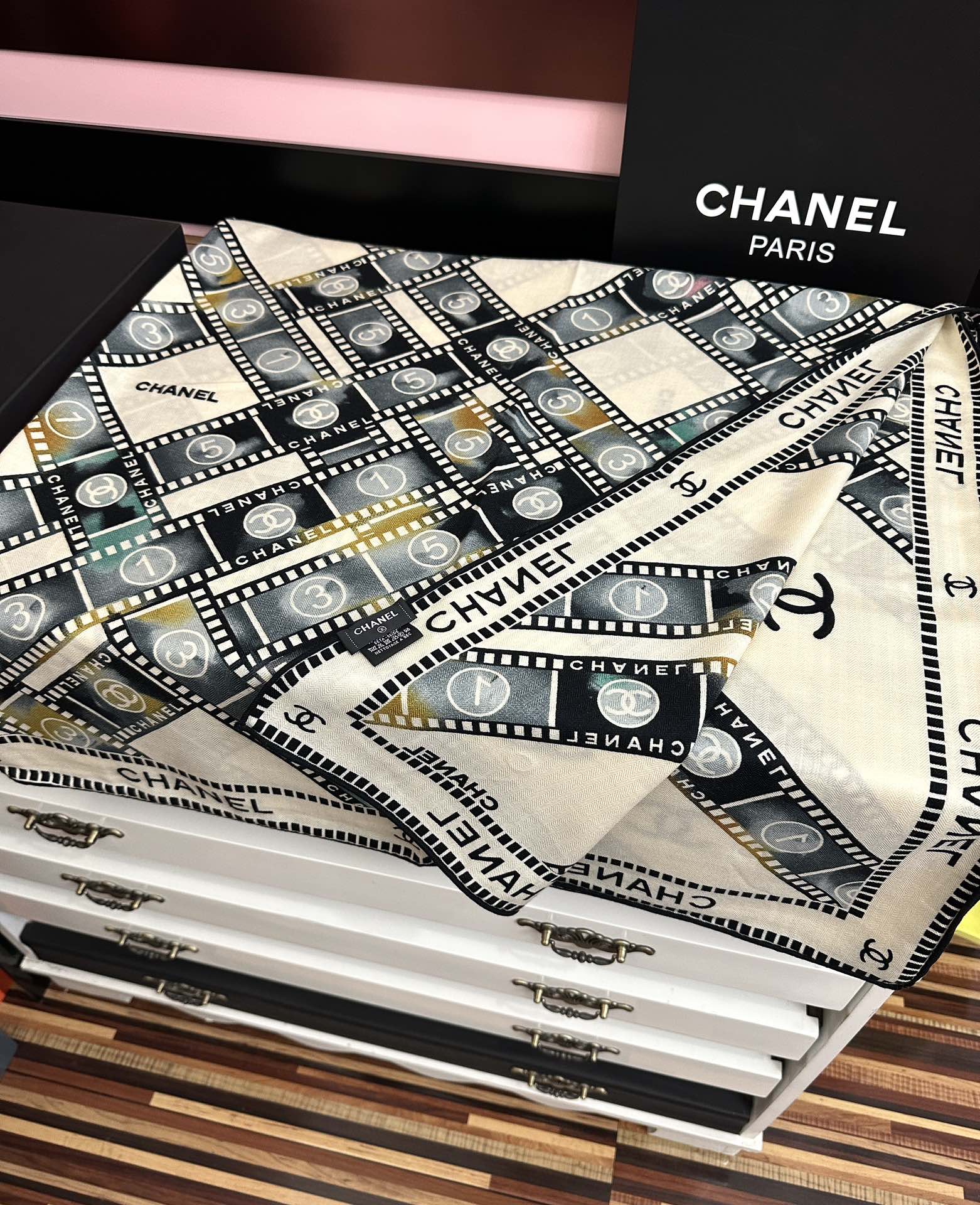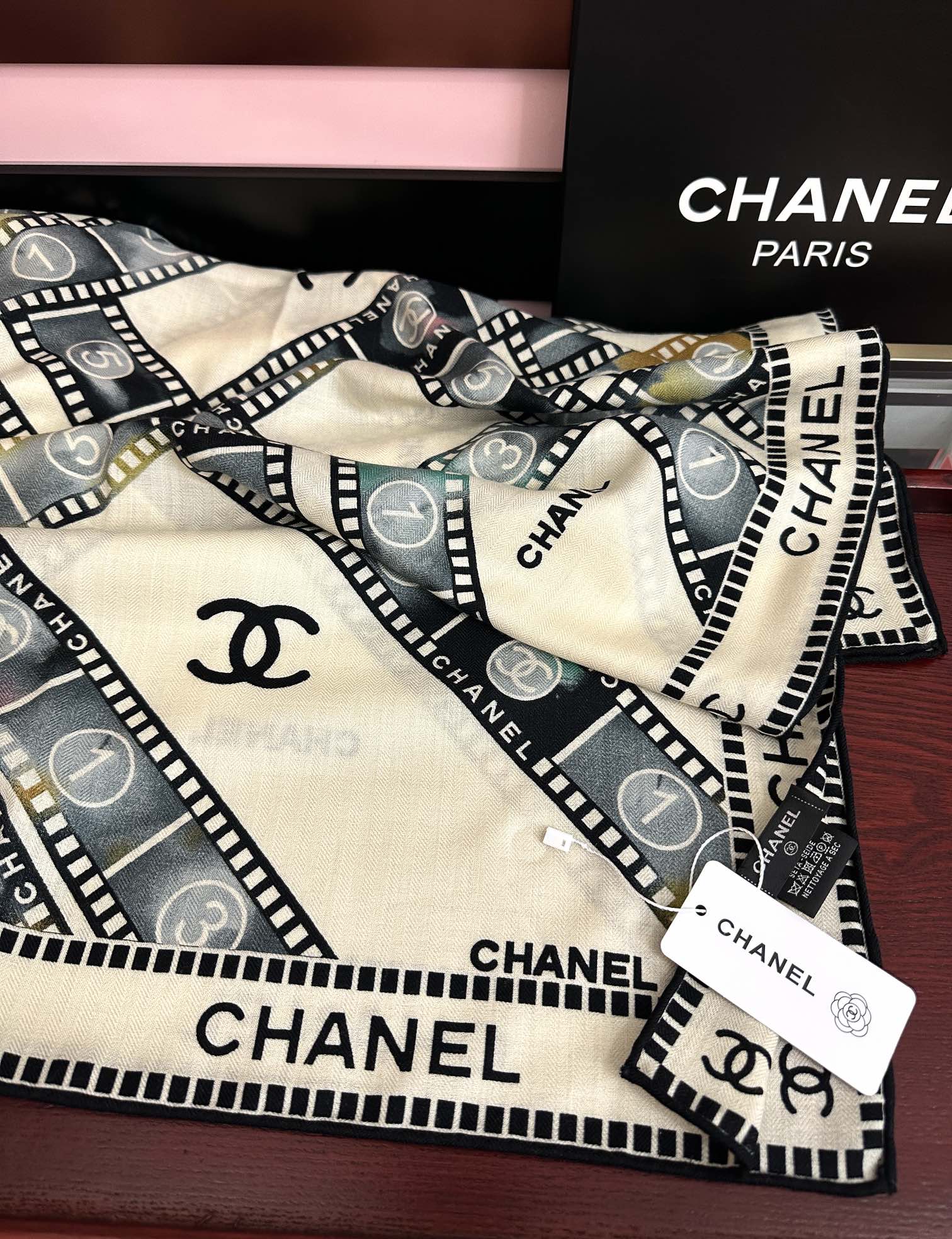 这款围巾是AAAAA 1:1 质量 (非常棒). 使用了和原版一模一样的材料. 商标部分也保持了和香奈儿/Chanel一样. 图片拍摄是实物围巾拍摄, 您所收到的实物保证和我们图片一模一样.