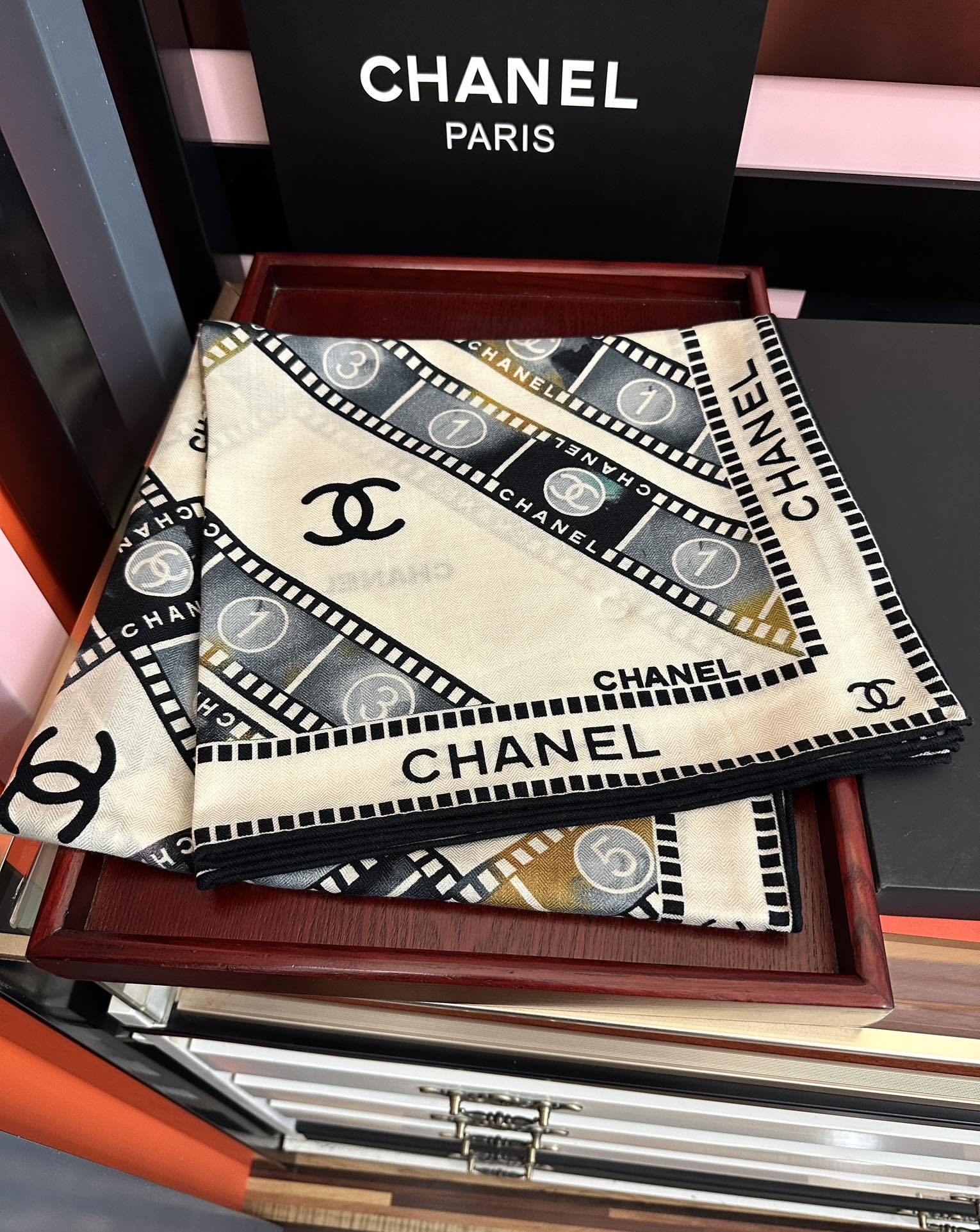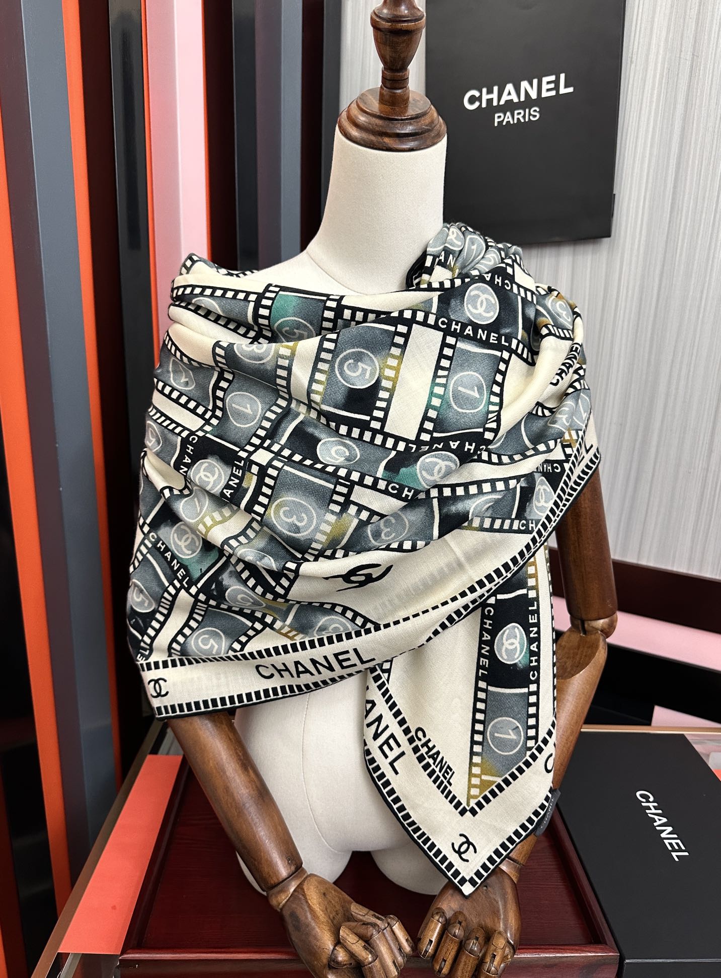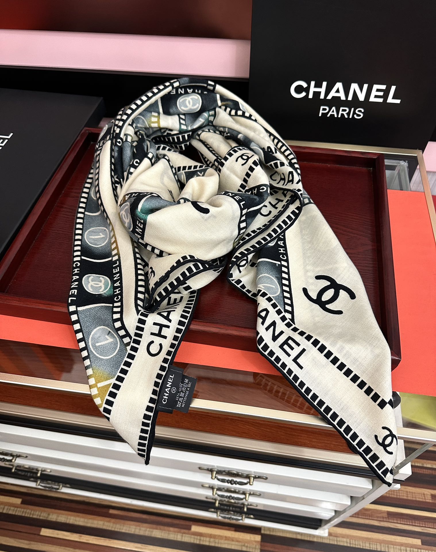 这款围巾是AAAAA 1:1 质量 (非常棒). 使用了和原版一模一样的材料. 商标部分也保持了和香奈儿/Chanel一样. 图片拍摄是实物围巾拍摄, 您所收到的实物保证和我们图片一模一样.