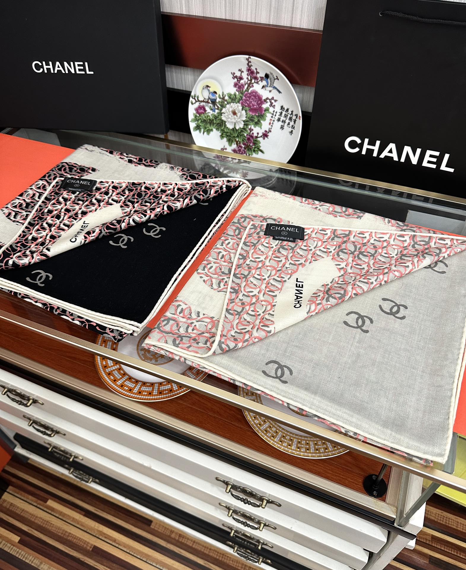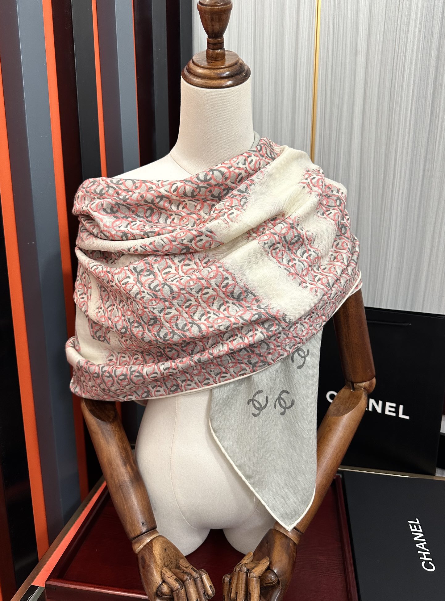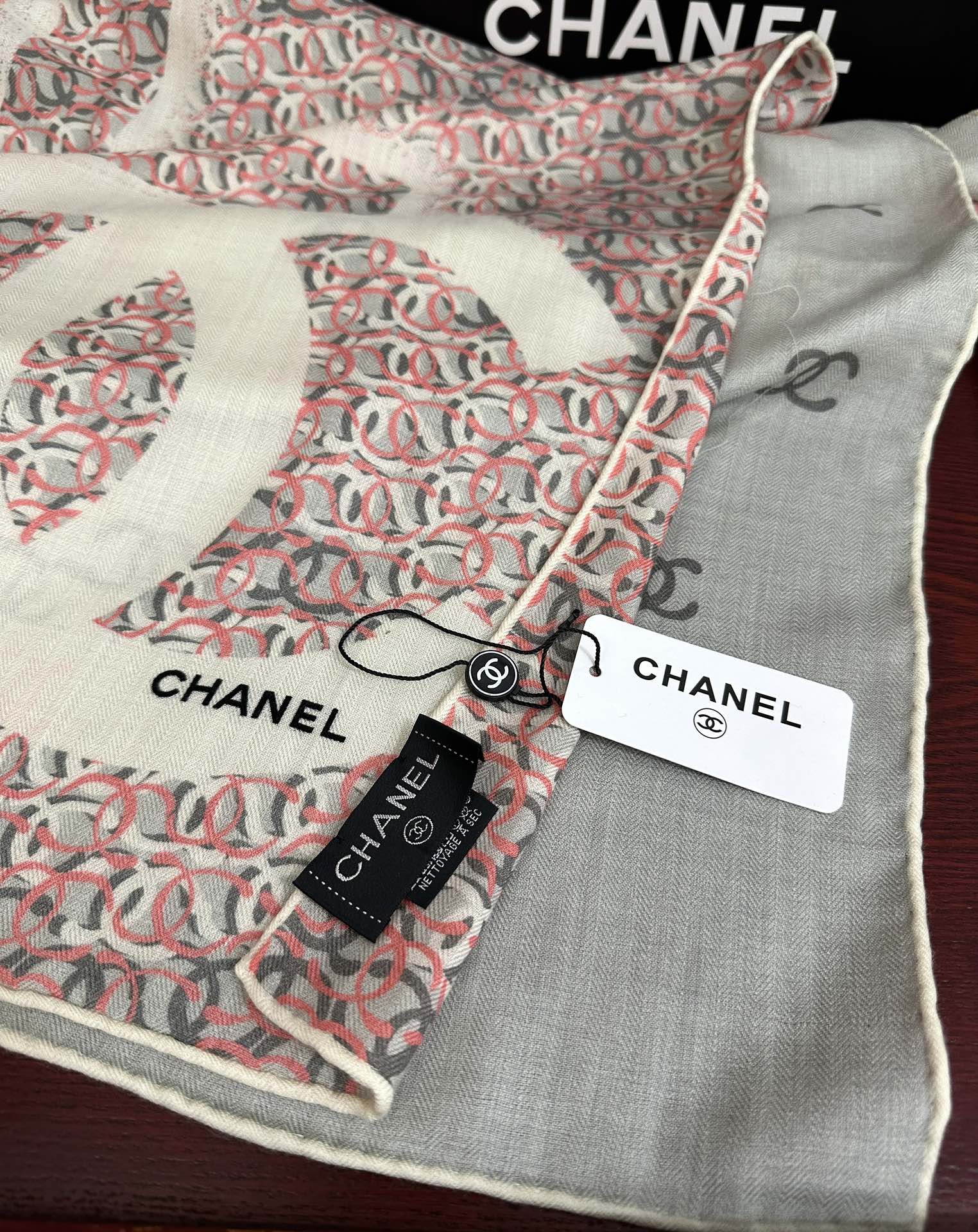 这款围巾是AAAAA 1:1 质量 (非常棒). 使用了和原版一模一样的材料. 商标部分也保持了和香奈儿/Chanel一样. 图片拍摄是实物围巾拍摄, 您所收到的实物保证和我们图片一模一样.