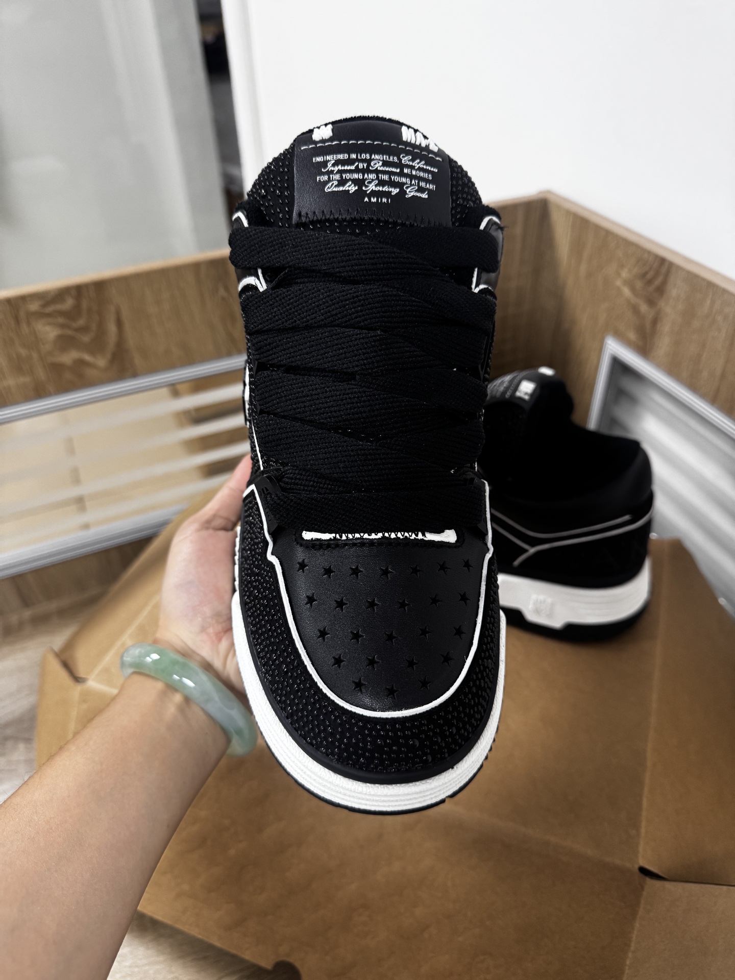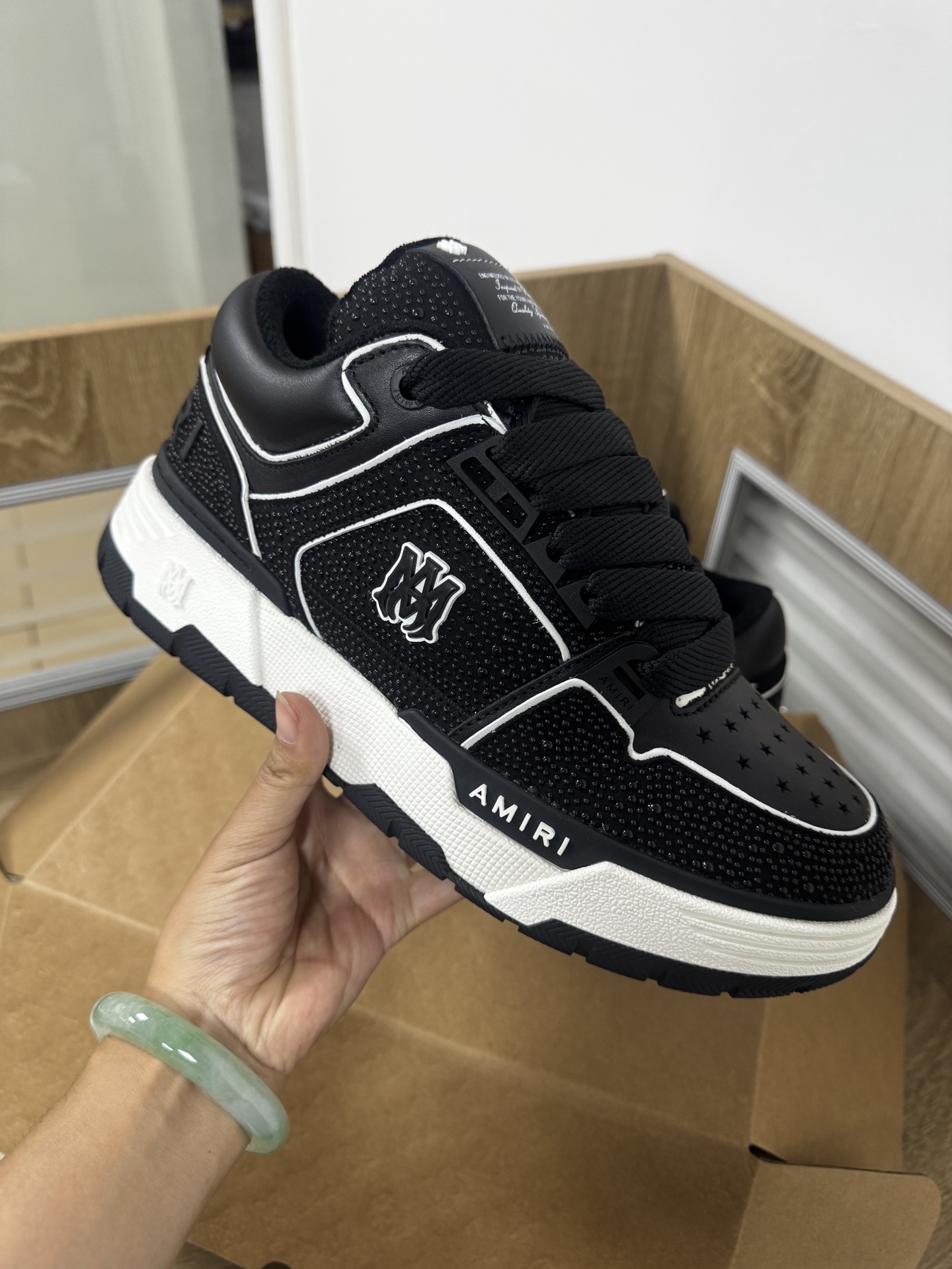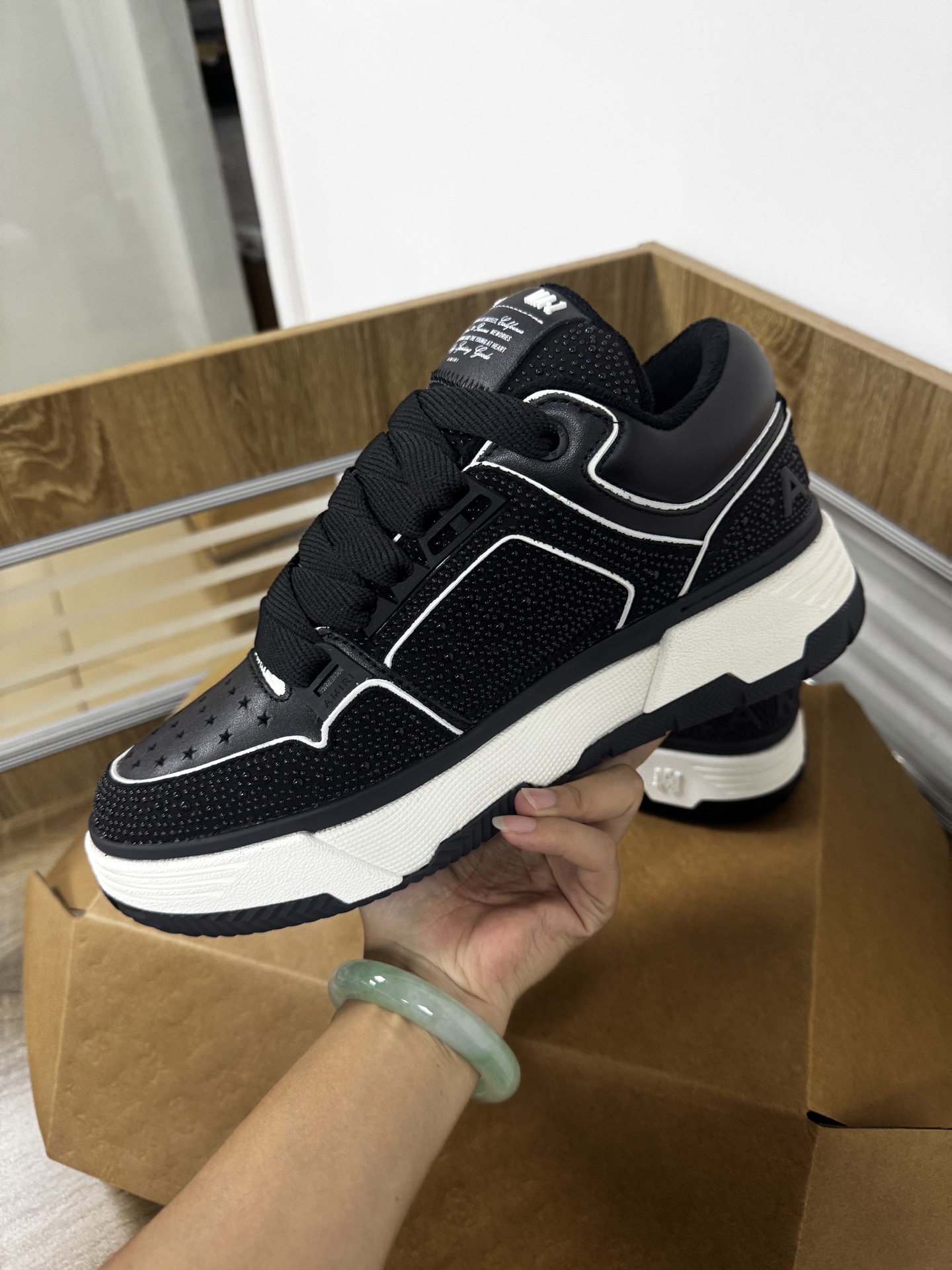 这款鞋子是AAAAA 1:1 质量 (非常棒). 使用了和原版一模一样的材料. 商标部分也保持了和Amiri一样. 图片拍摄是实物鞋子拍摄, 您所收到的实物保证和我们图片一模一样.