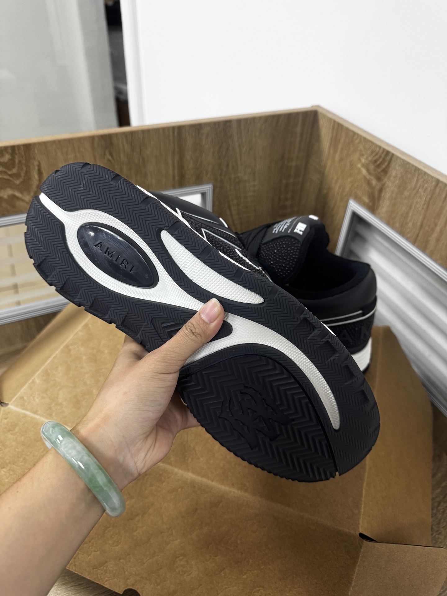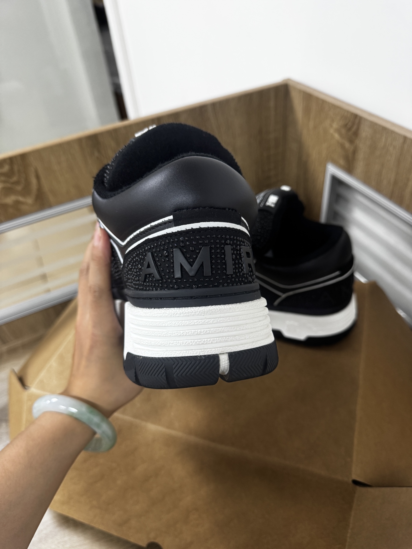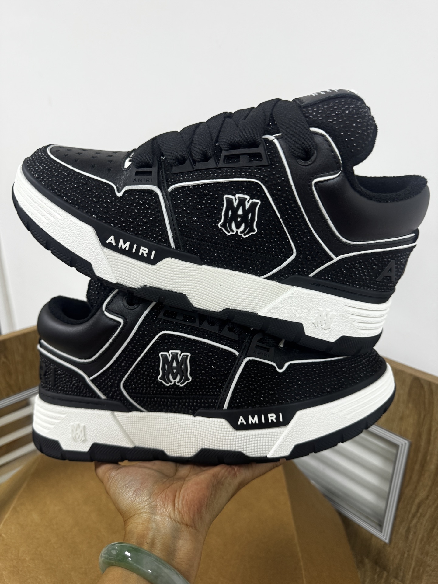 这款鞋子是AAAAA 1:1 质量 (非常棒). 使用了和原版一模一样的材料. 商标部分也保持了和Amiri一样. 图片拍摄是实物鞋子拍摄, 您所收到的实物保证和我们图片一模一样.