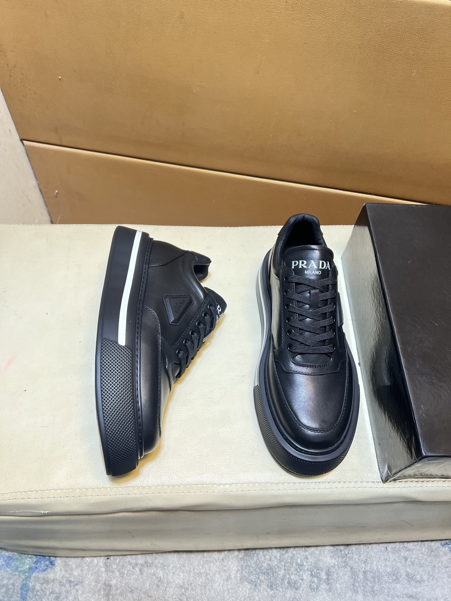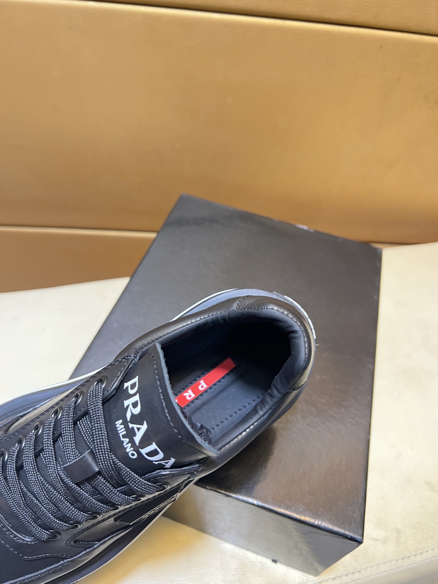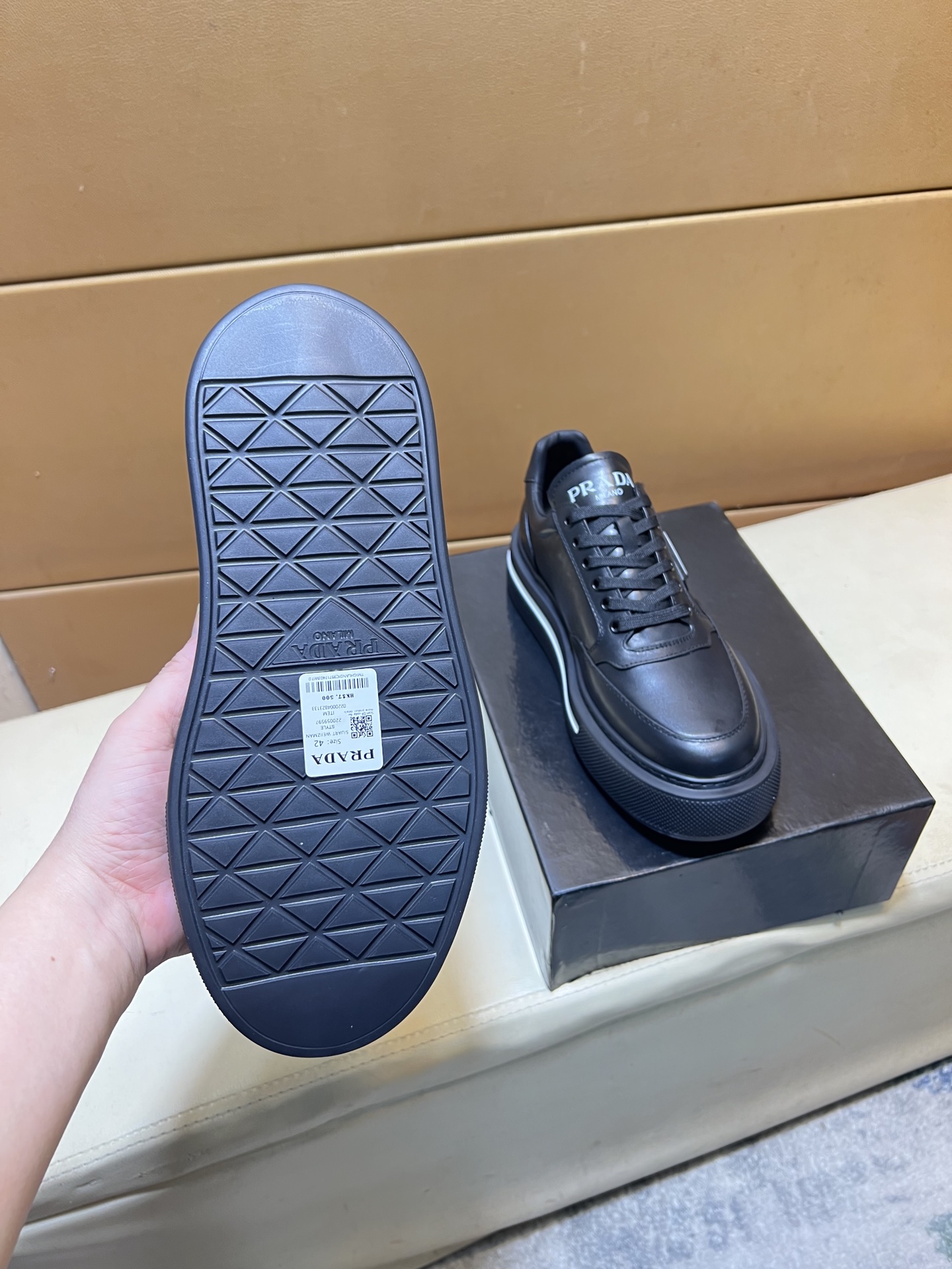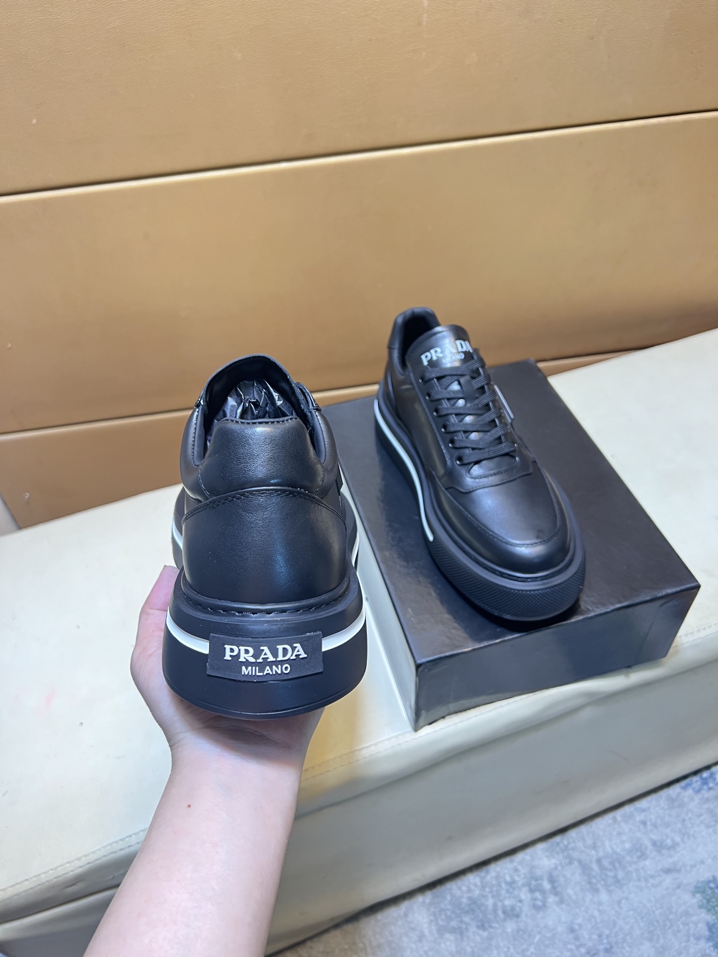 这款鞋子是AAAAA 1:1 质量 (非常棒). 使用了和原版一模一样的材料. 商标部分也保持了和普拉达/Prada一样. 图片拍摄是实物鞋子拍摄, 您所收到的实物保证和我们图片一模一样.