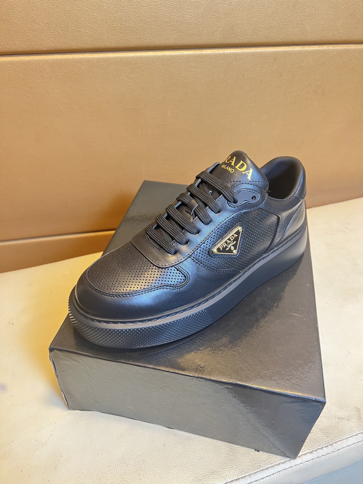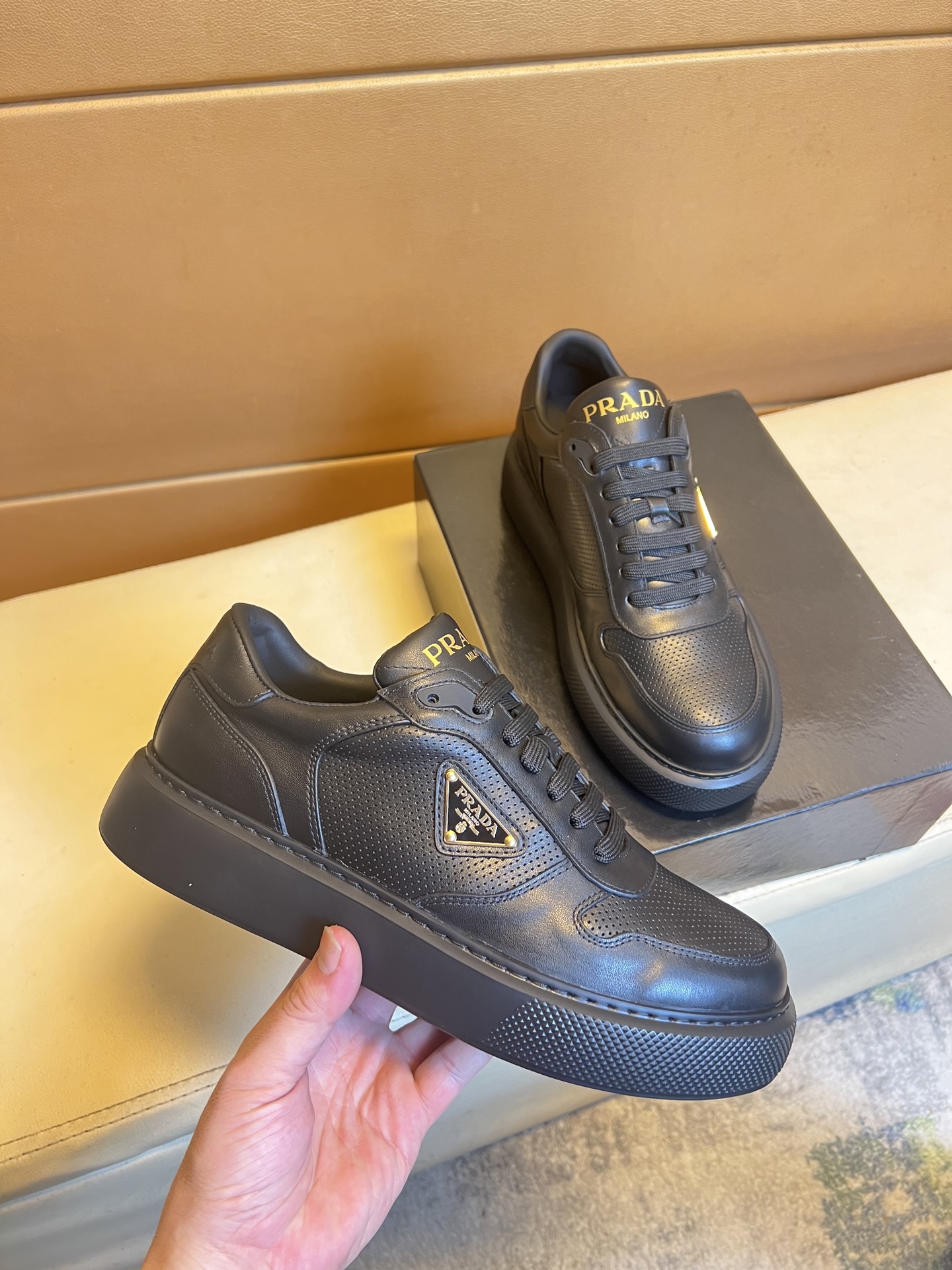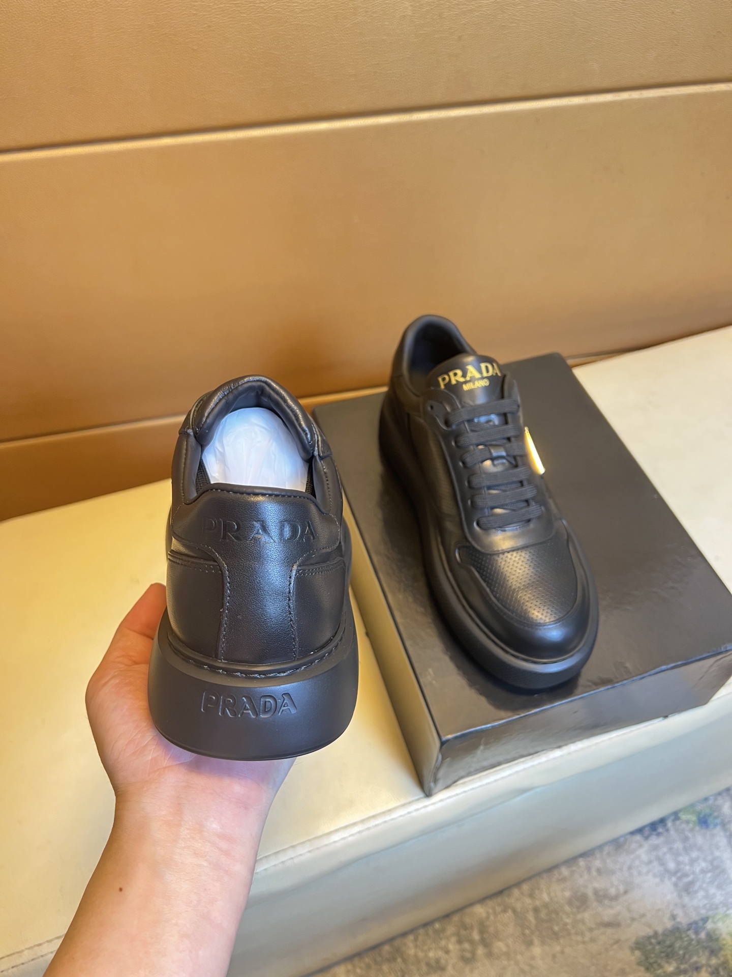 这款鞋子是AAAAA 1:1 质量 (非常棒). 使用了和原版一模一样的材料. 商标部分也保持了和普拉达/Prada一样. 图片拍摄是实物鞋子拍摄, 您所收到的实物保证和我们图片一模一样.