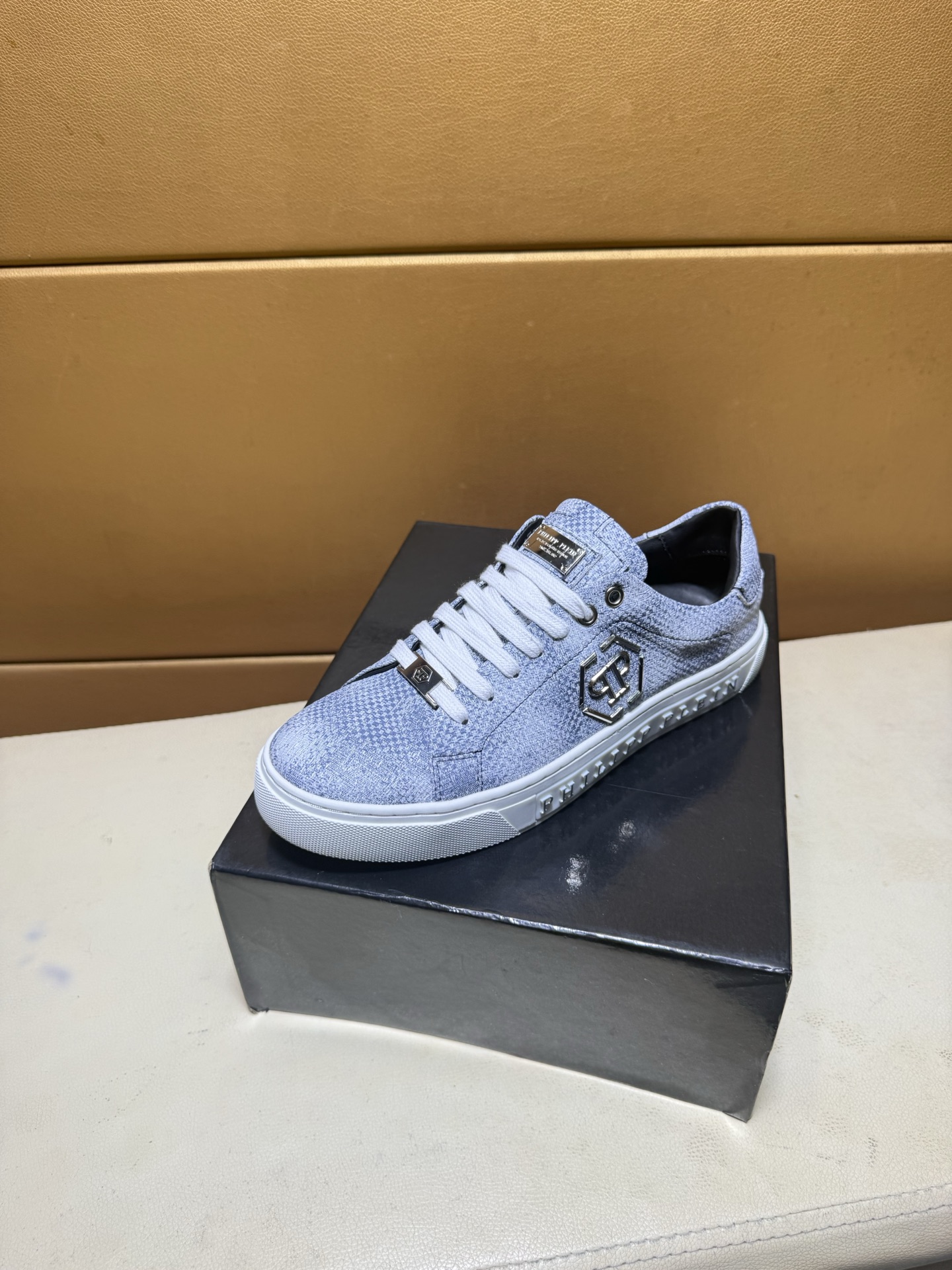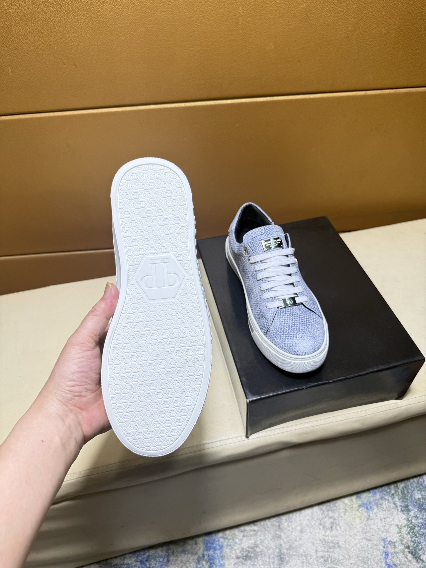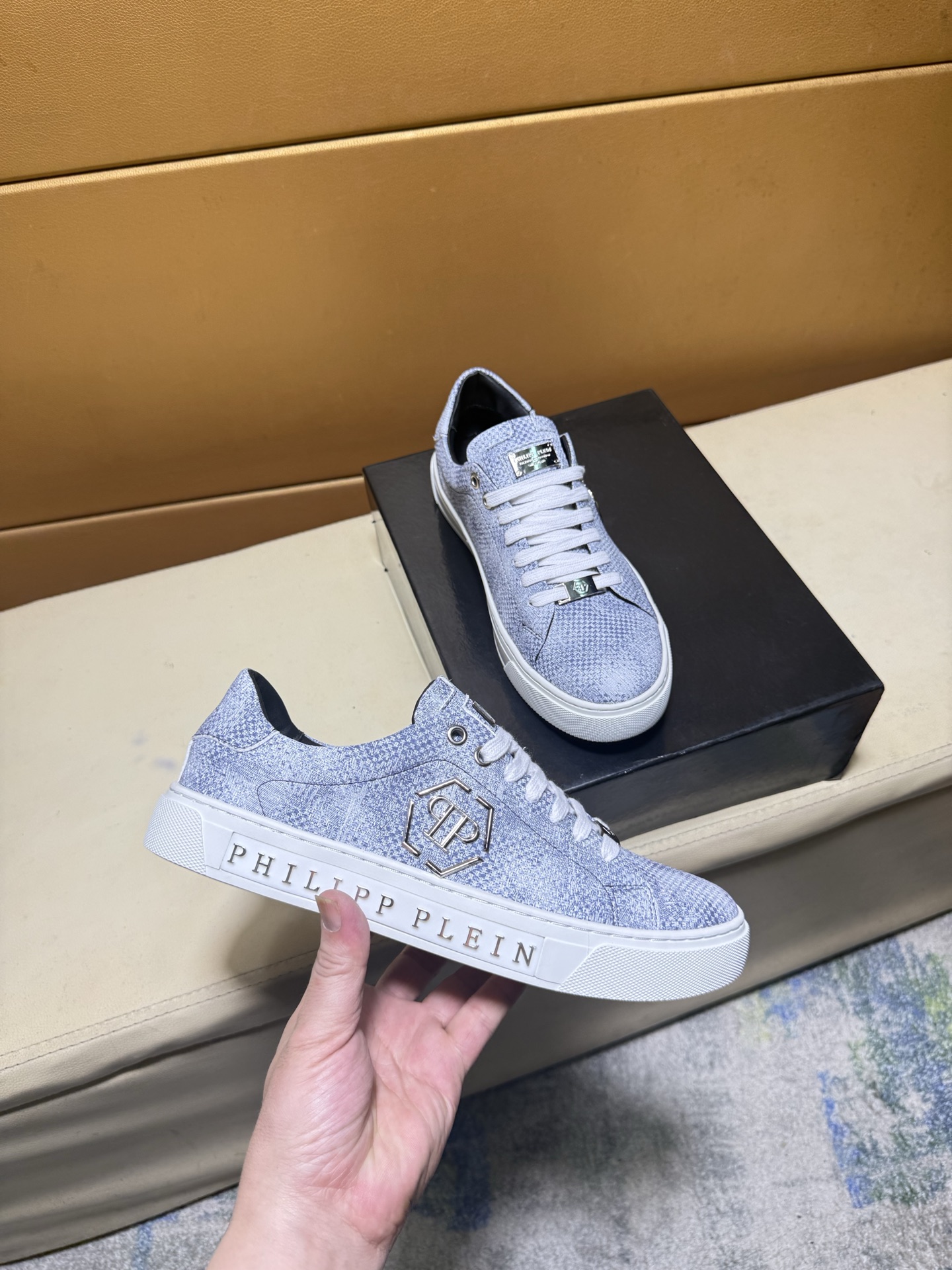 这款鞋子是AAAAA 1:1 质量 (非常棒). 使用了和原版一模一样的材料. 商标部分也保持了和菲利普·普林/Philipp Plein一样. 图片拍摄是实物鞋子拍摄, 您所收到的实物保证和我们图片一模一样.