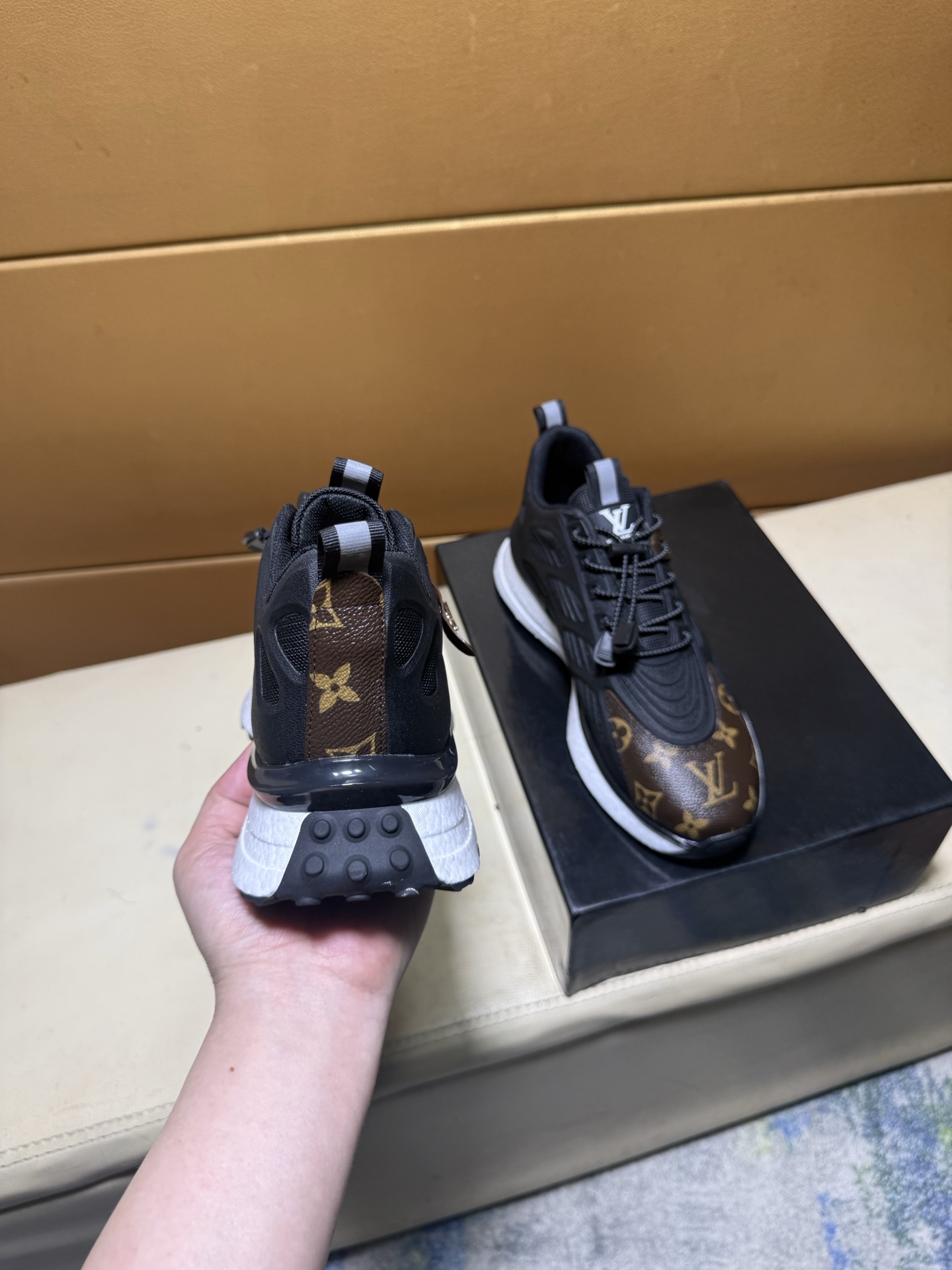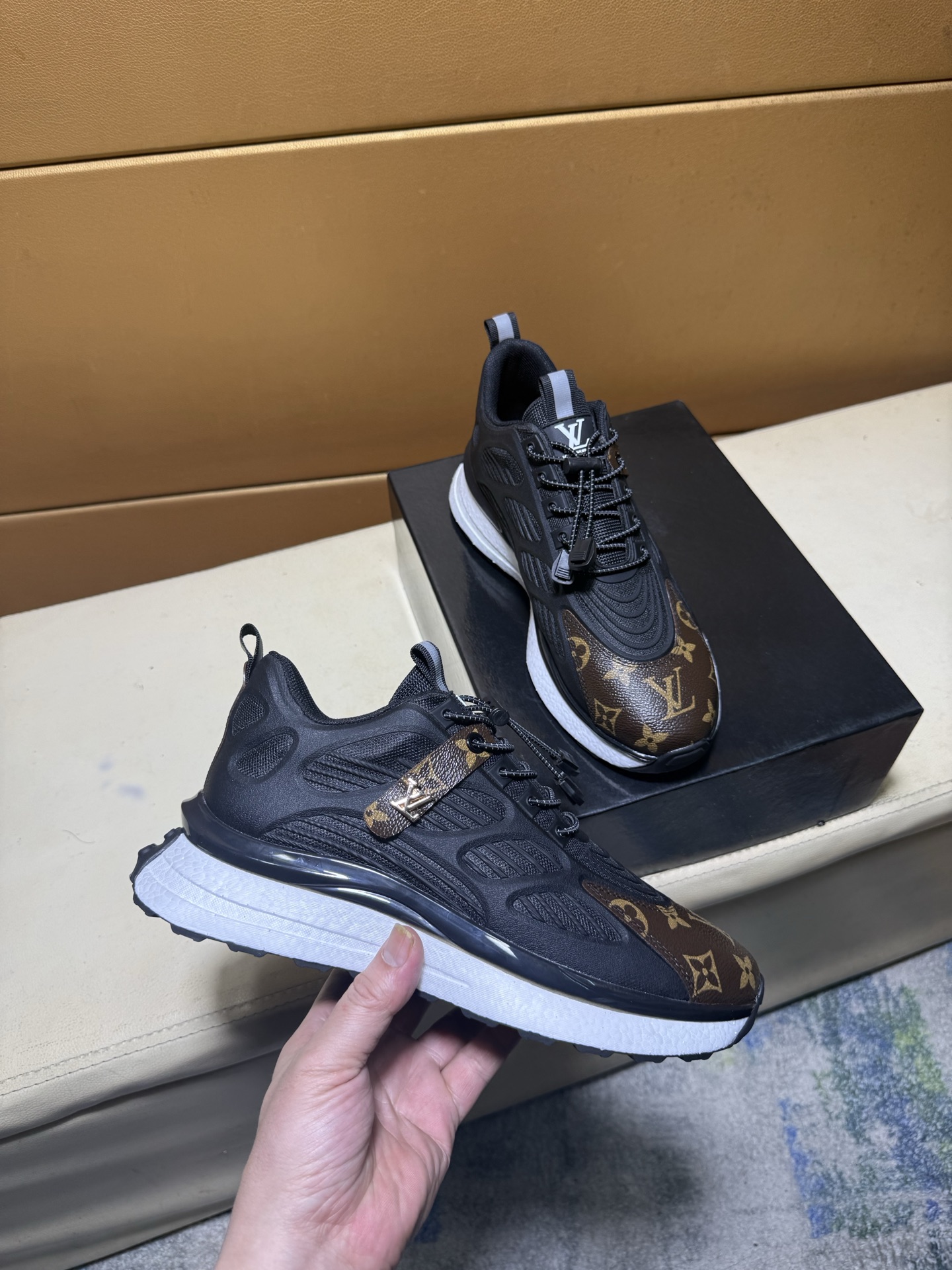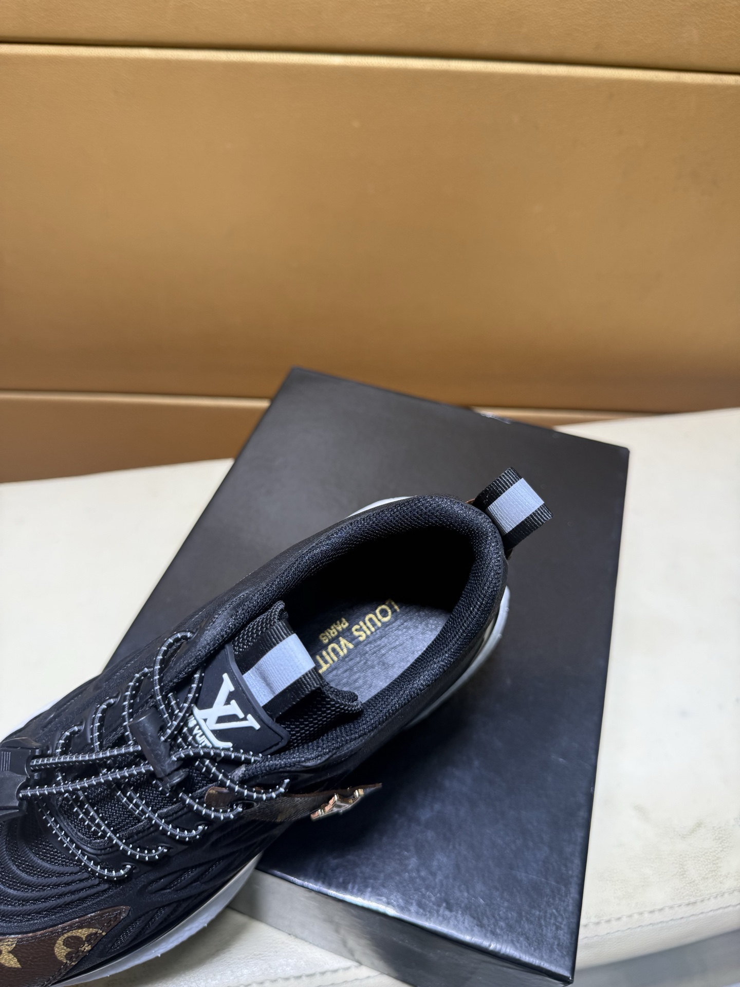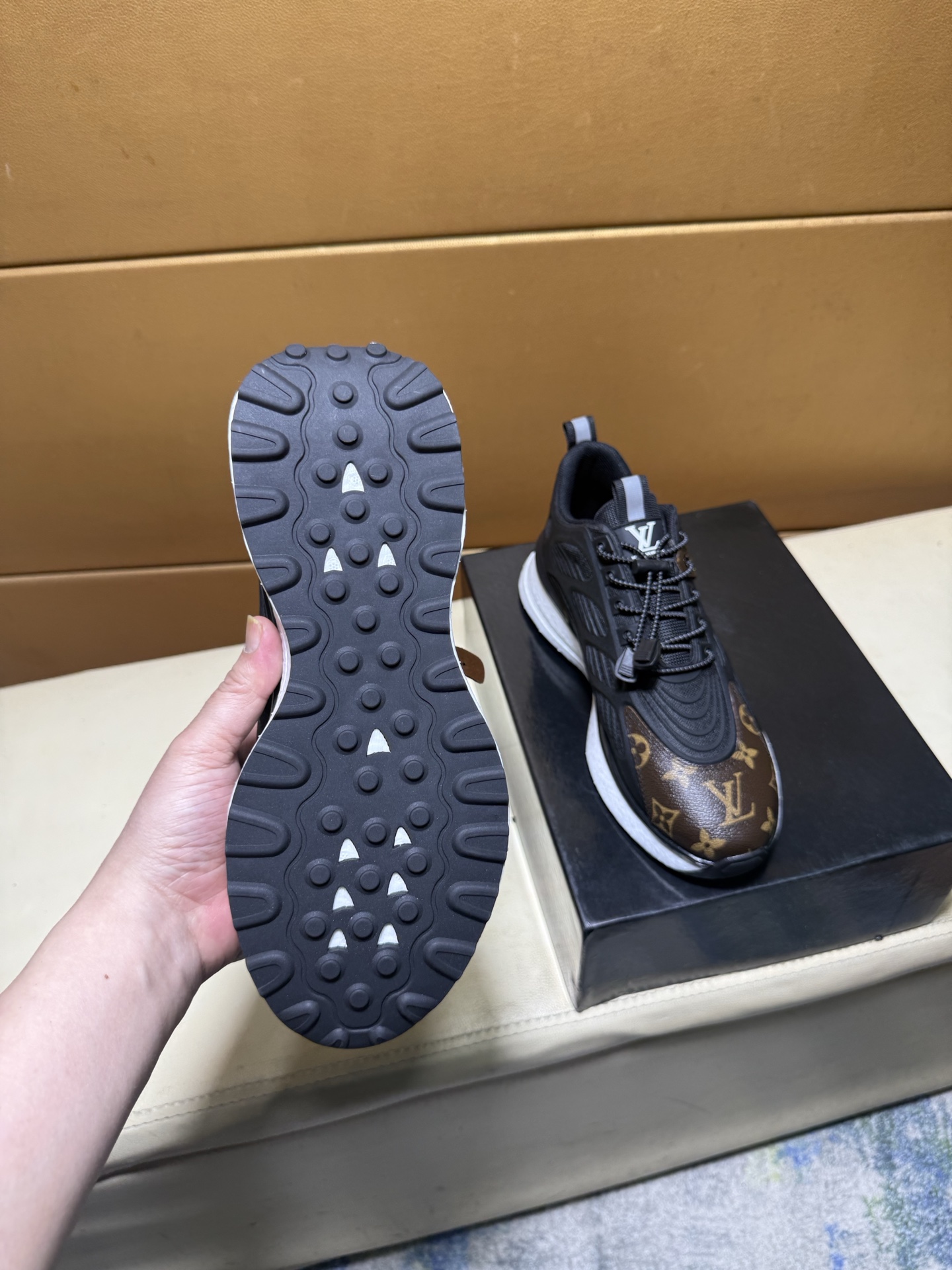 这款鞋子是AAAAA 1:1 质量 (非常棒). 使用了和原版一模一样的材料. 商标部分也保持了和路易威登/Louis Vuitton一样. 图片拍摄是实物鞋子拍摄, 您所收到的实物保证和我们图片一模一样.