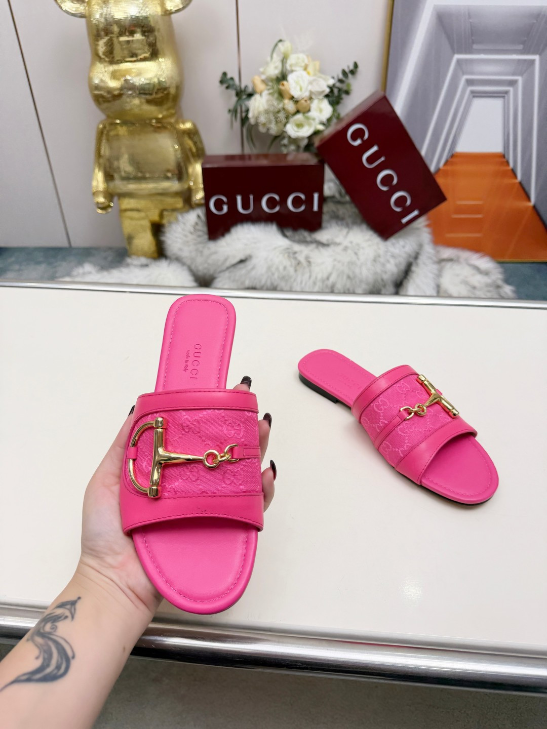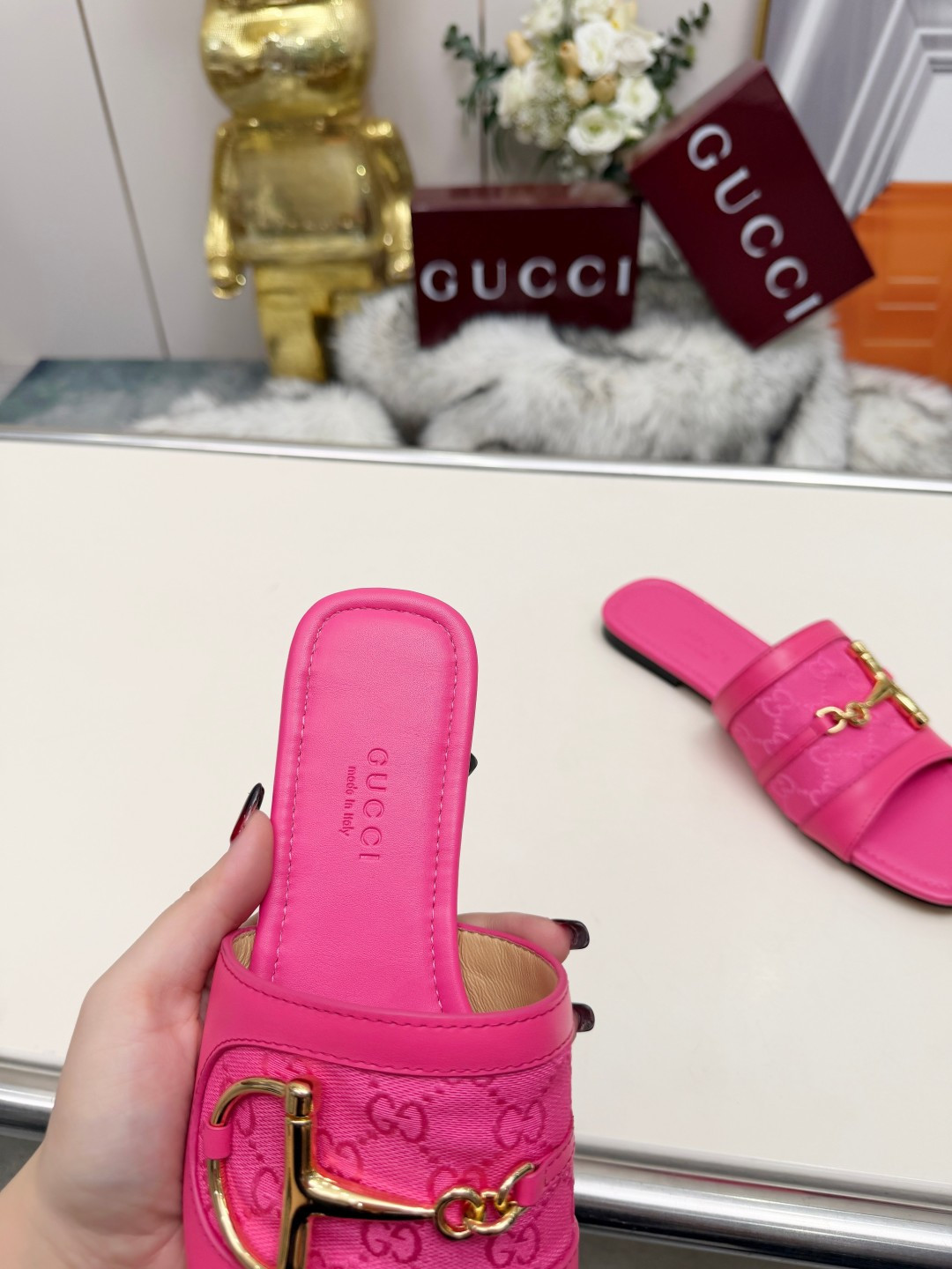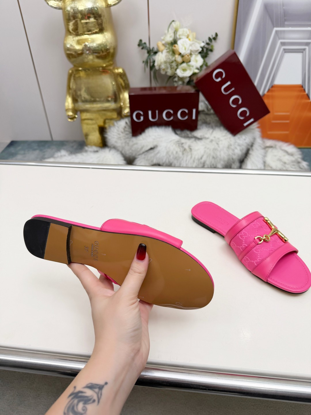 这款鞋子是AAAAA 1:1 质量 (非常棒). 使用了和原版一模一样的材料. 商标部分也保持了和古奇/Gucci一样. 图片拍摄是实物鞋子拍摄, 您所收到的实物保证和我们图片一模一样.