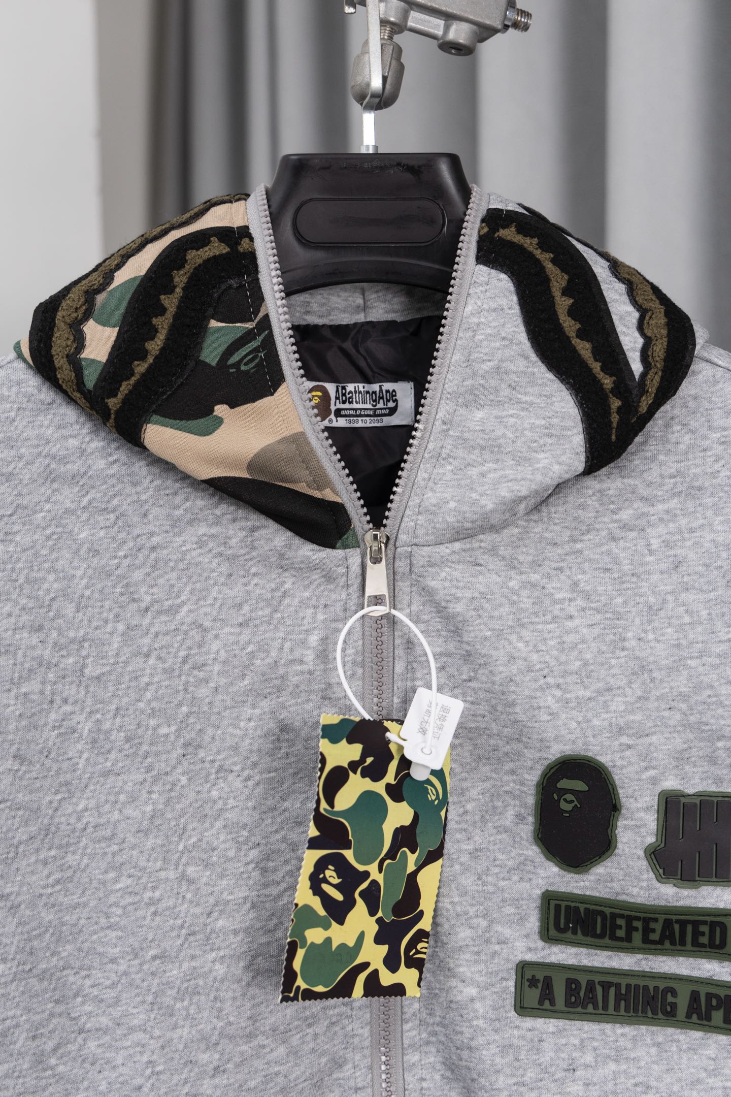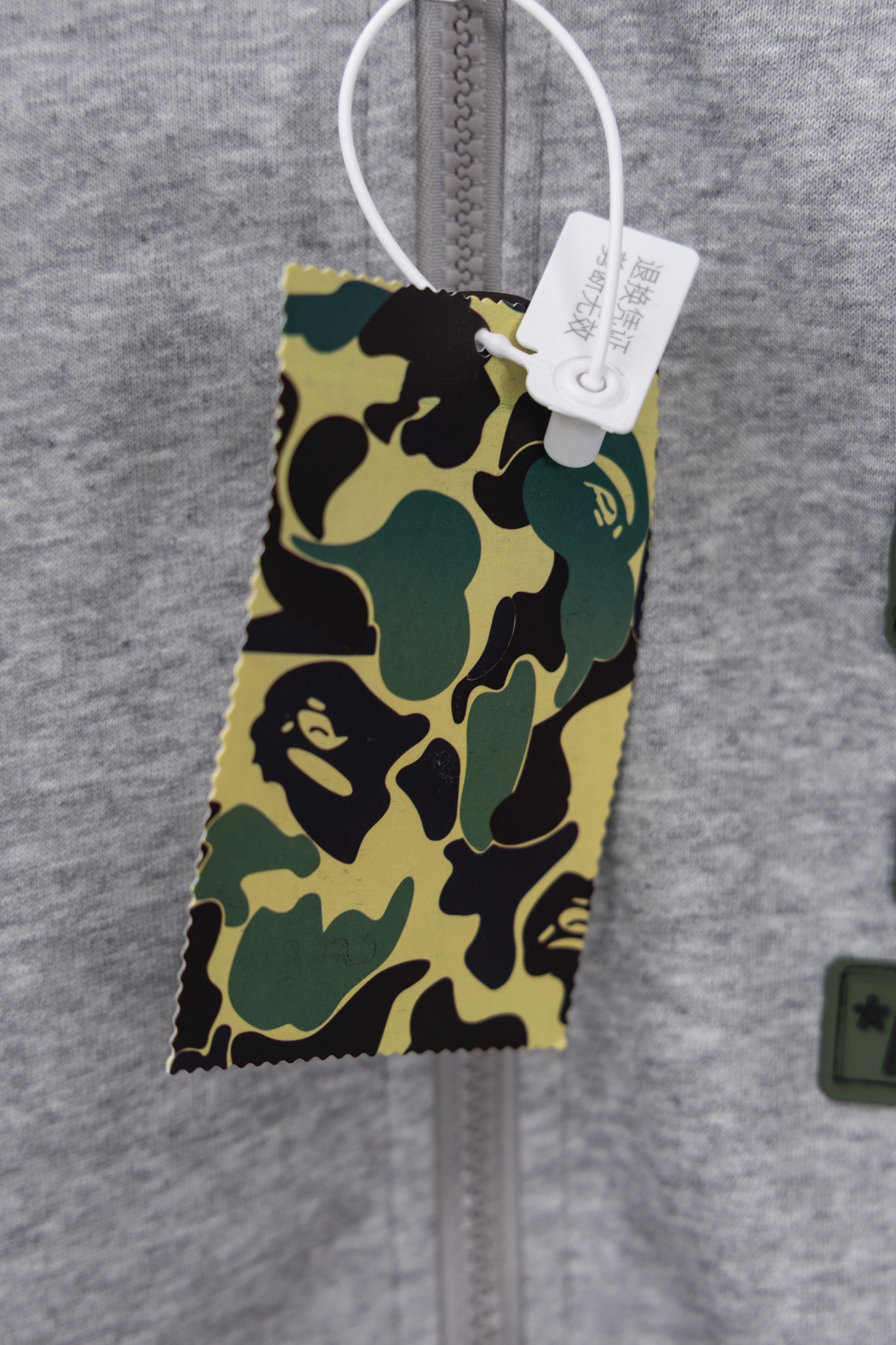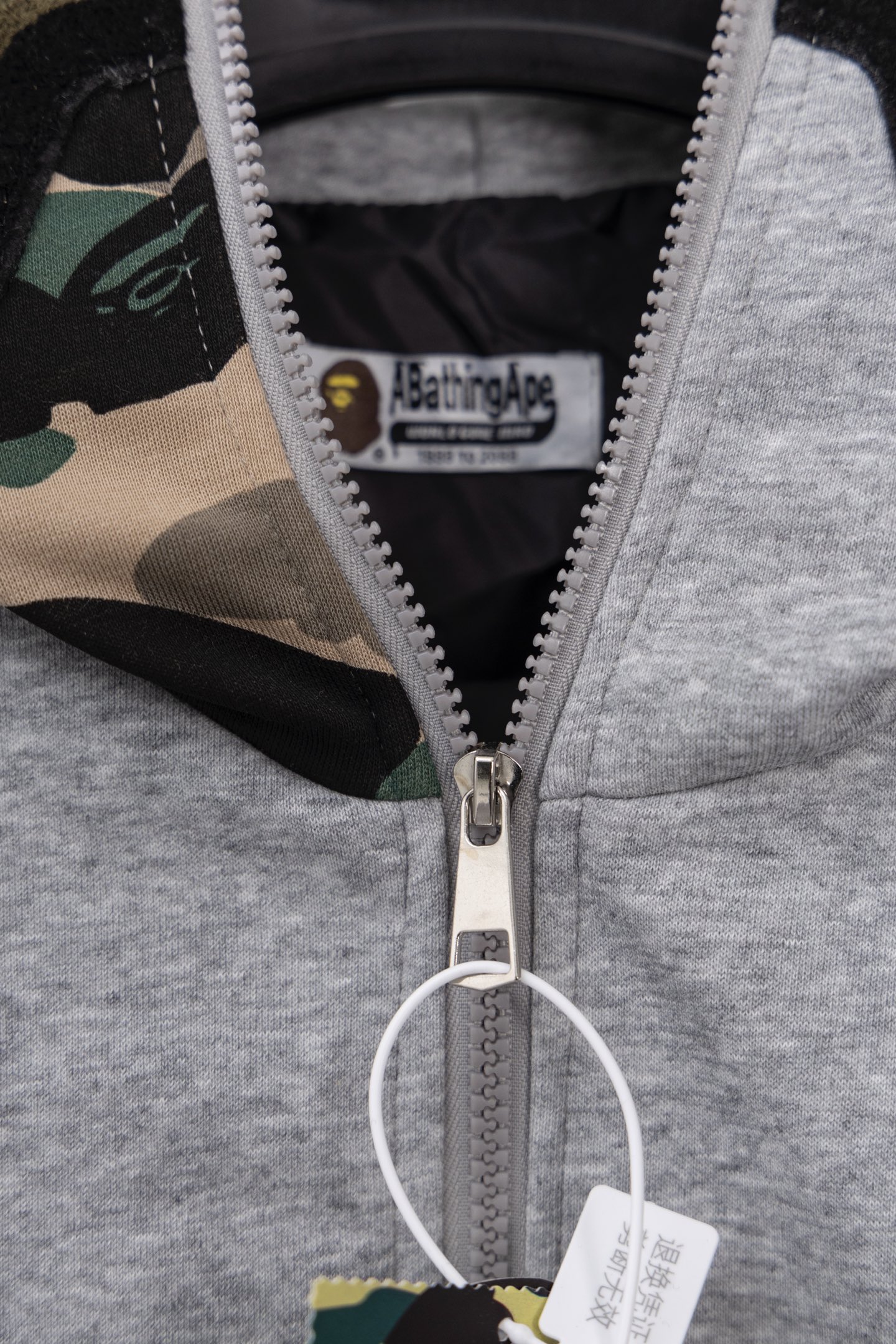 这款衣服是AAAAA 1:1 质量 (非常棒). 使用了和原版一模一样的材料. 商标部分也保持了和Bape一样. 图片拍摄是实物衣服拍摄, 您所收到的实物保证和我们图片一模一样.