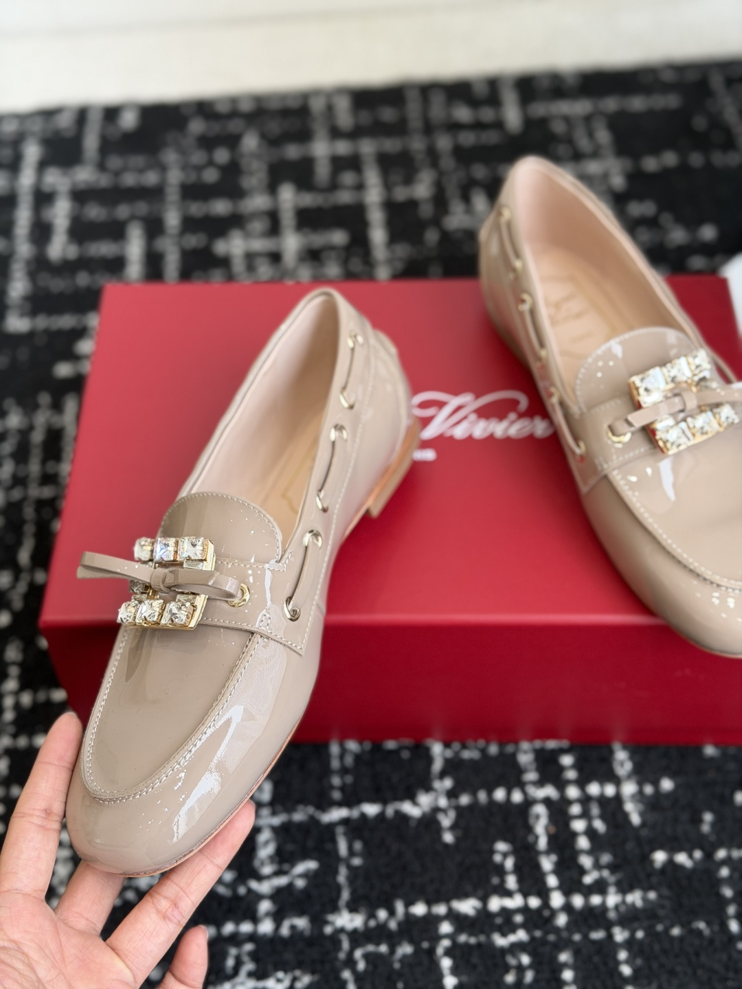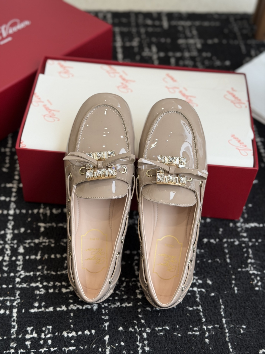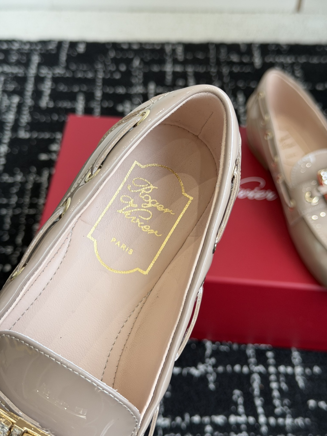这款鞋子是AAAAA 1:1 质量 (非常棒). 使用了和原版一模一样的材料. 商标部分也保持了和罗杰维维耶/Roger Vivier一样. 图片拍摄是实物鞋子拍摄, 您所收到的实物保证和我们图片一模一样.