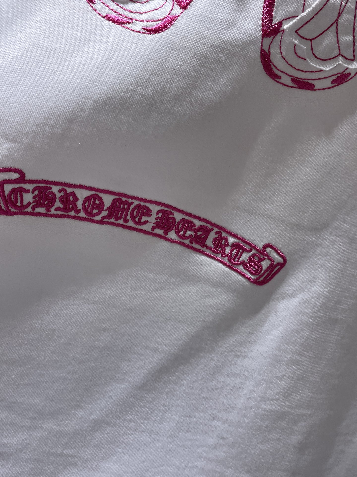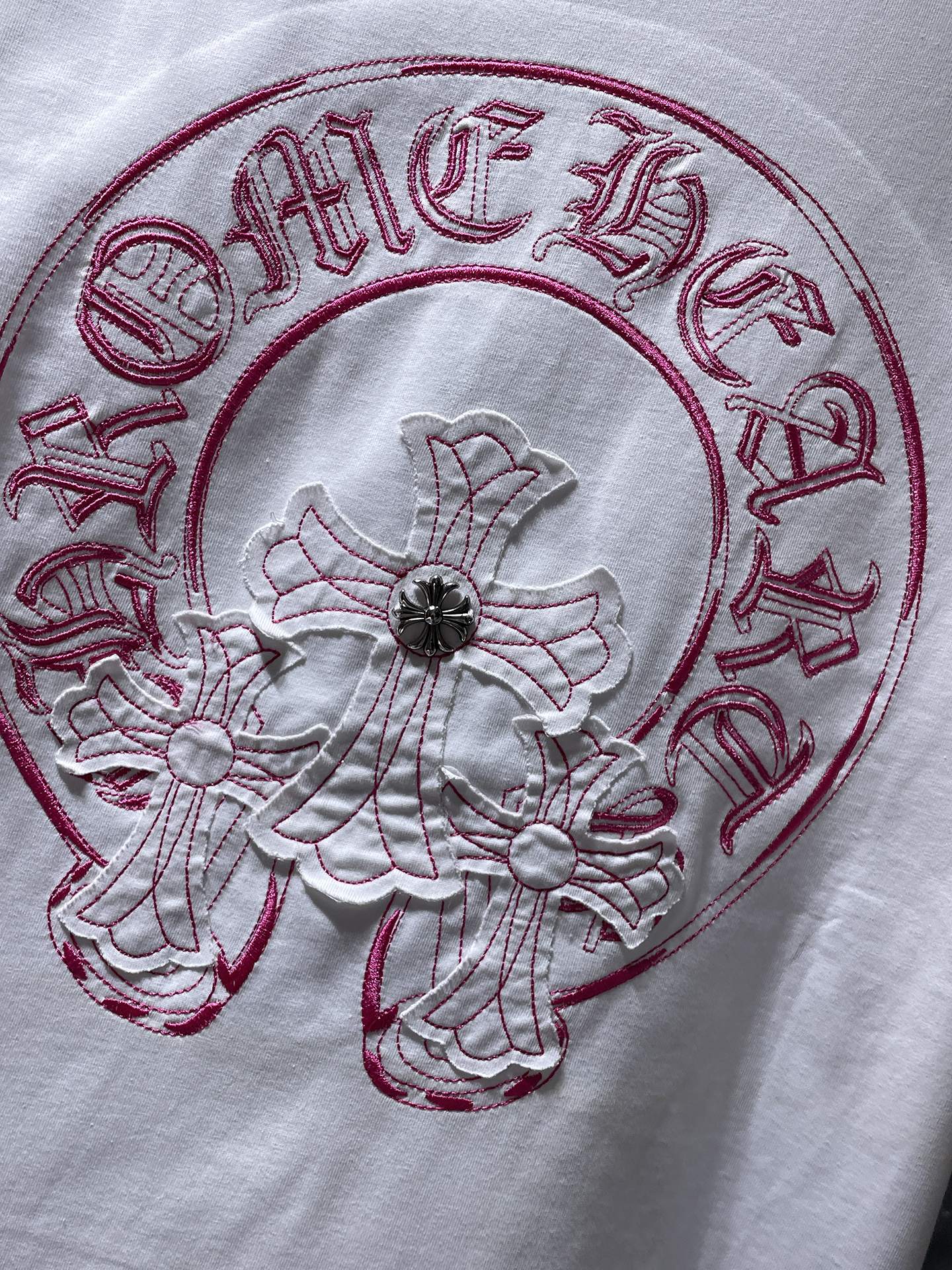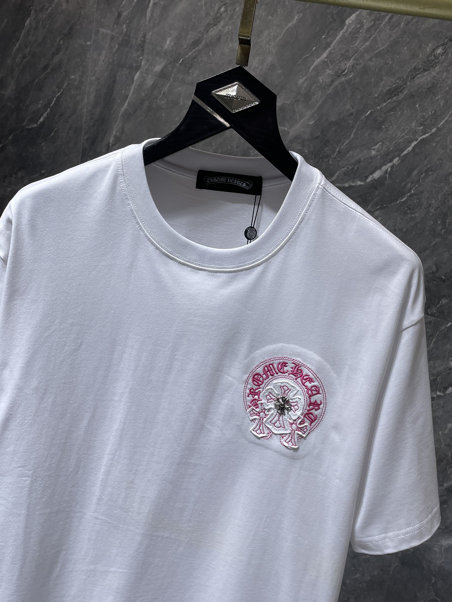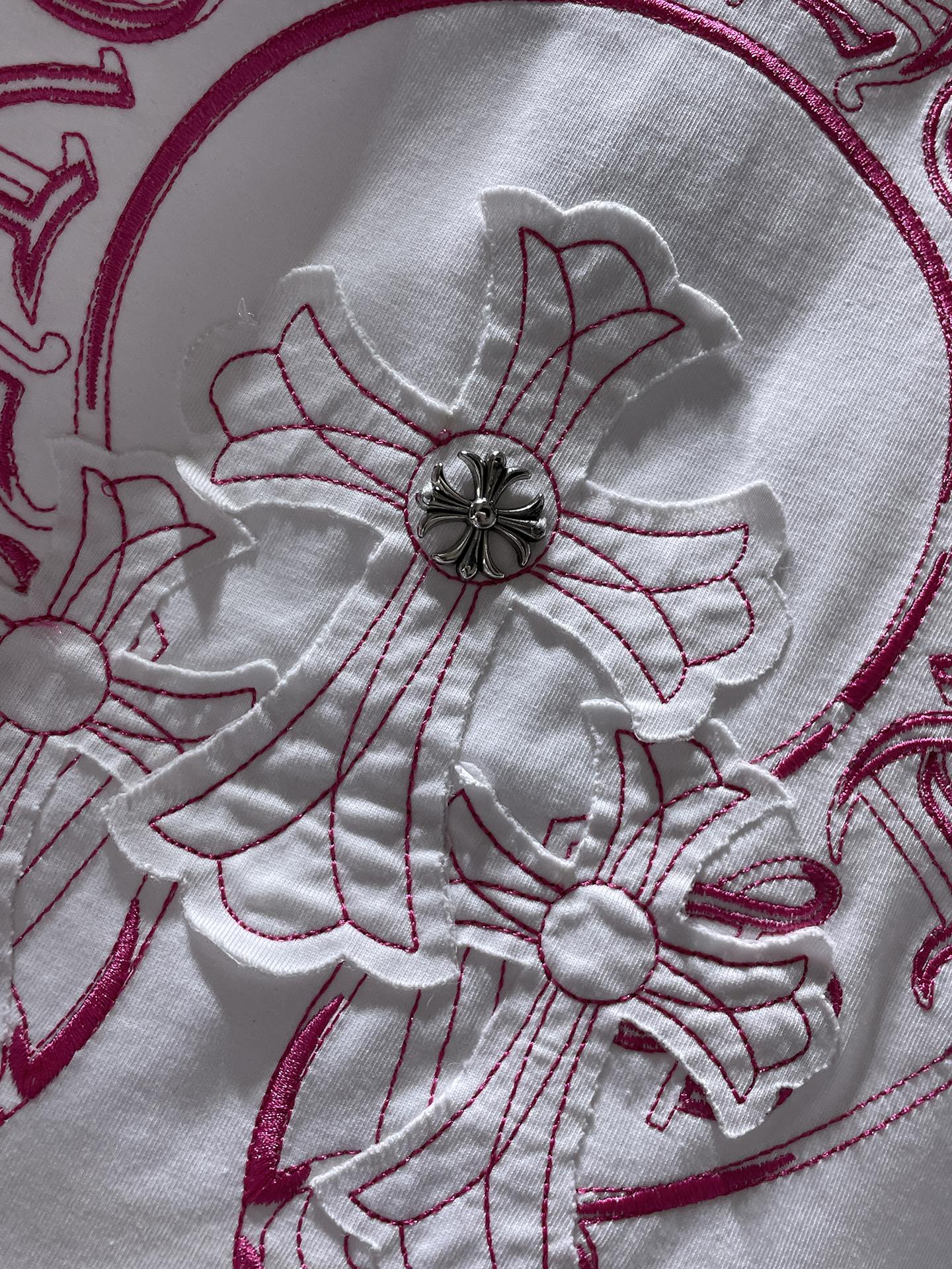 这款衣服是AAAAA 1:1 质量 (非常棒). 使用了和原版一模一样的材料. 商标部分也保持了和克罗心/Chrome Hearts一样. 图片拍摄是实物衣服拍摄, 您所收到的实物保证和我们图片一模一样.