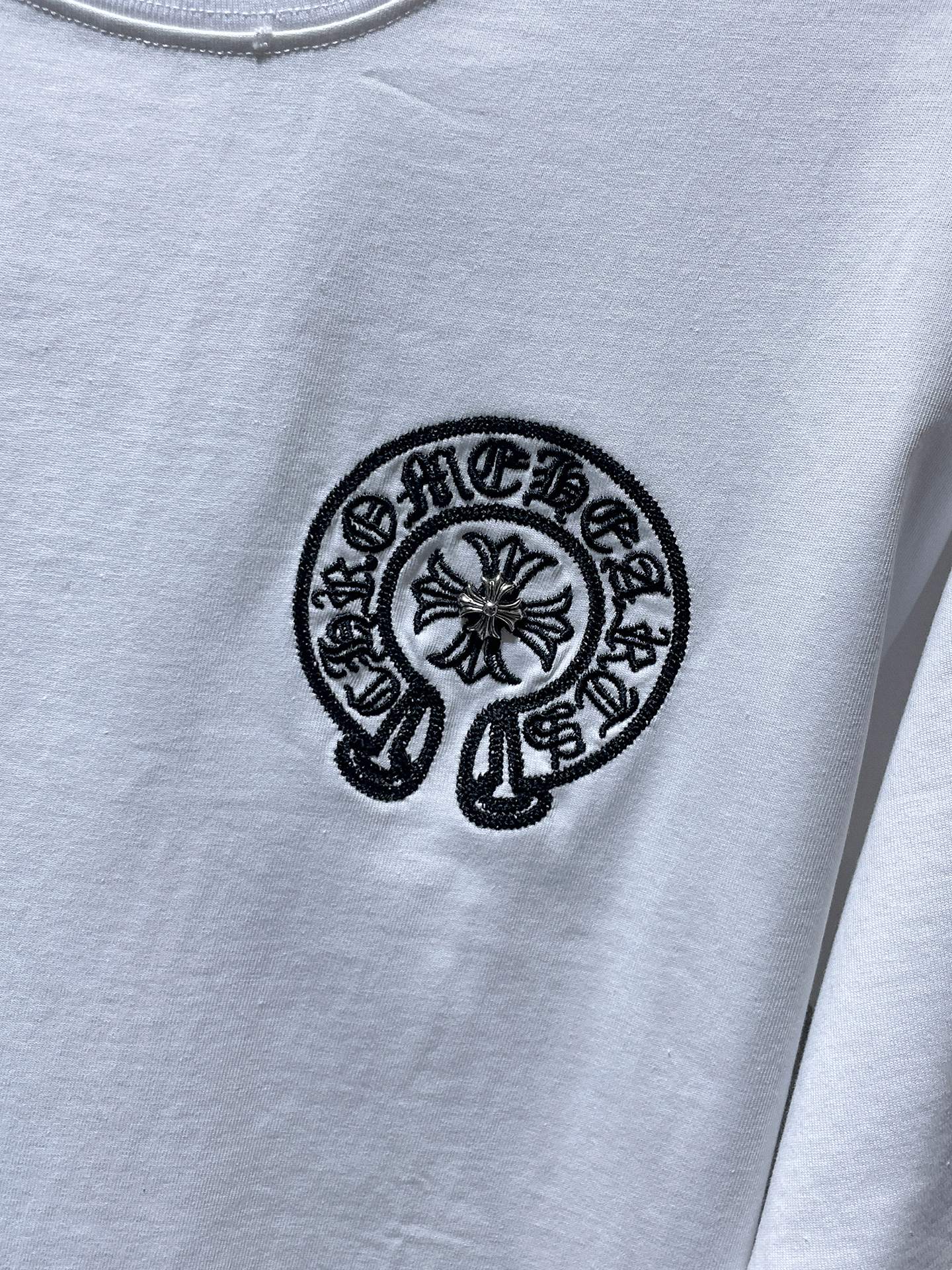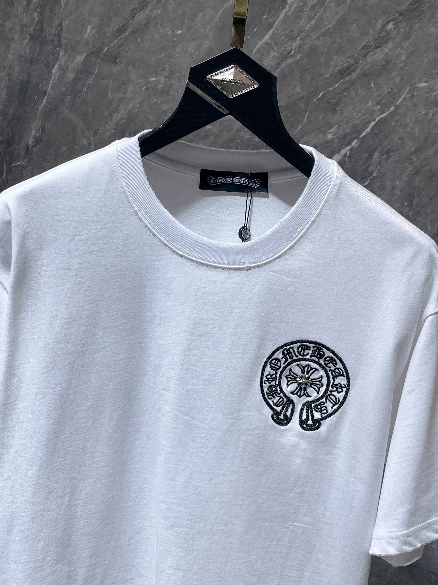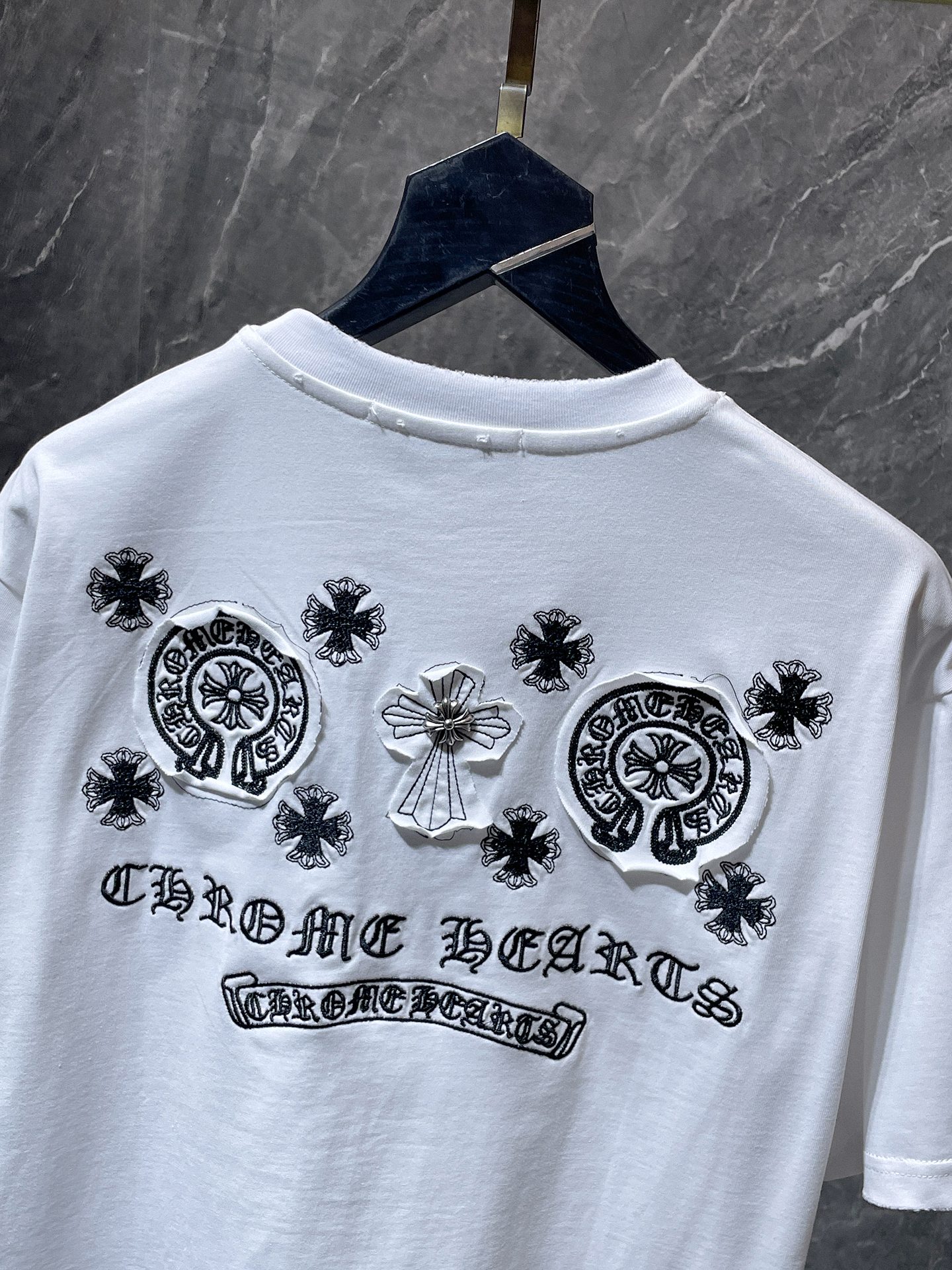 这款衣服是AAAAA 1:1 质量 (非常棒). 使用了和原版一模一样的材料. 商标部分也保持了和克罗心/Chrome Hearts一样. 图片拍摄是实物衣服拍摄, 您所收到的实物保证和我们图片一模一样.