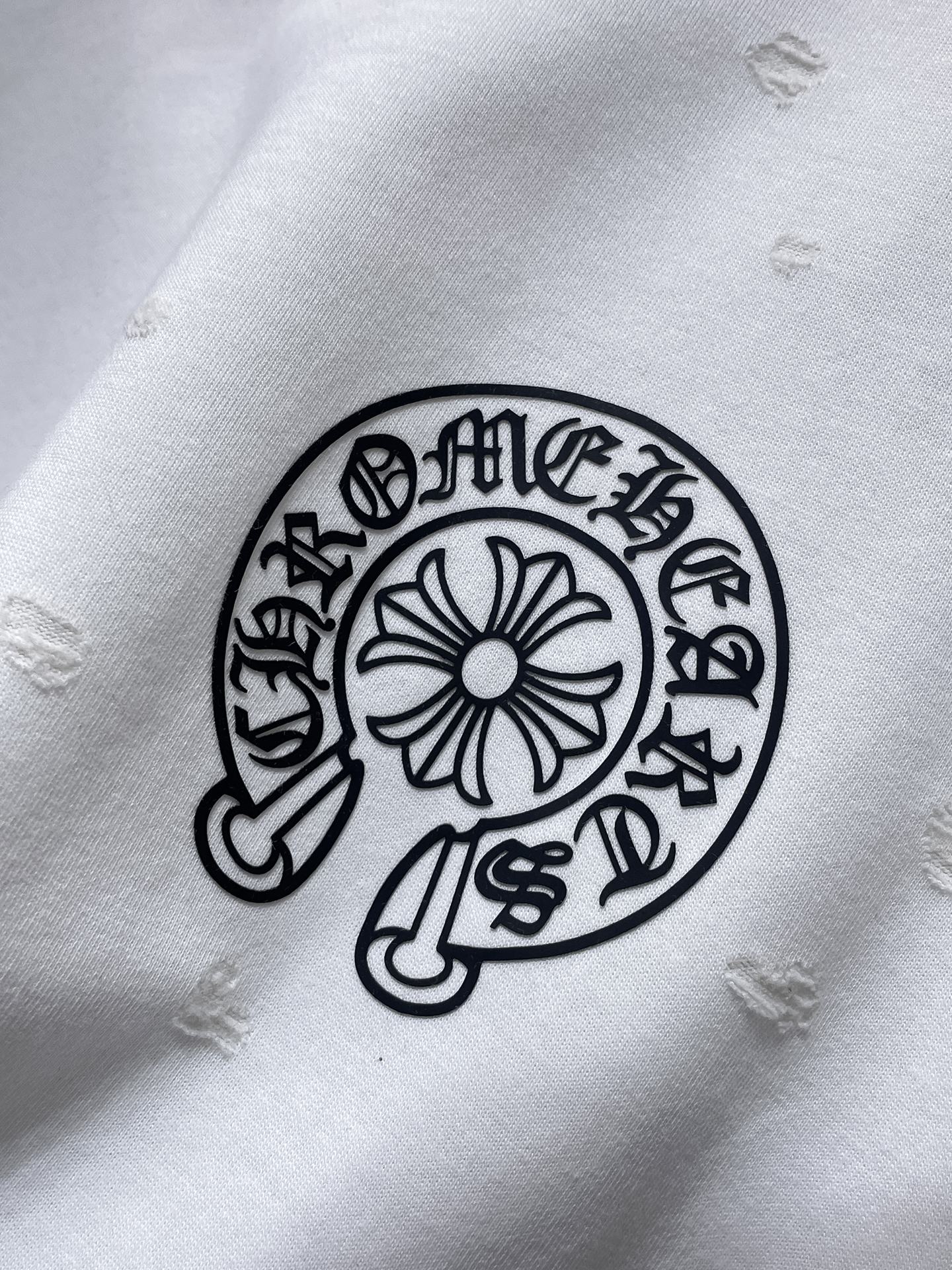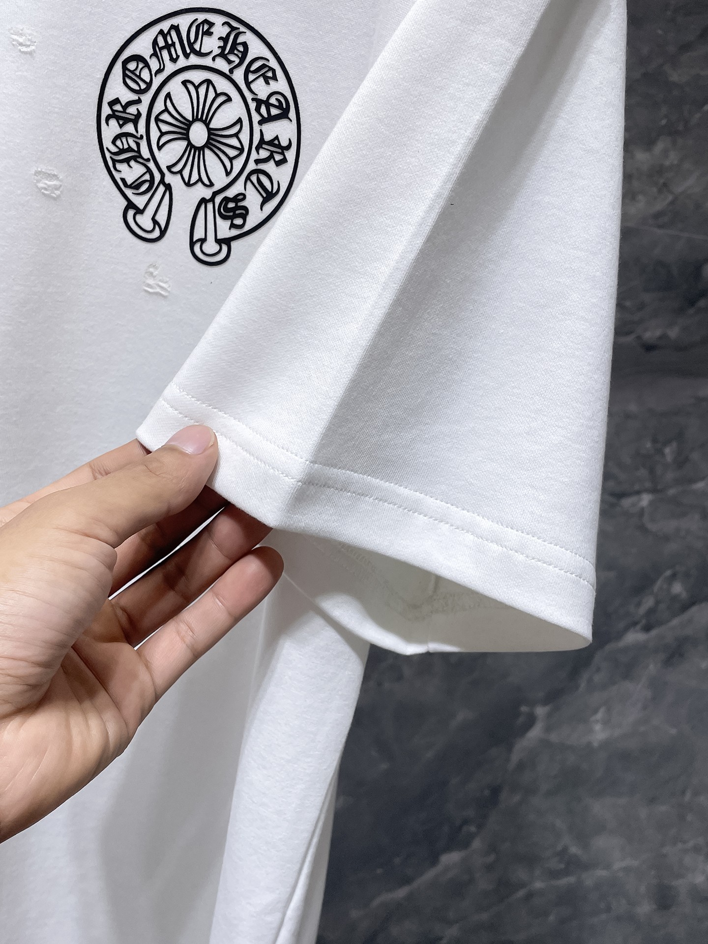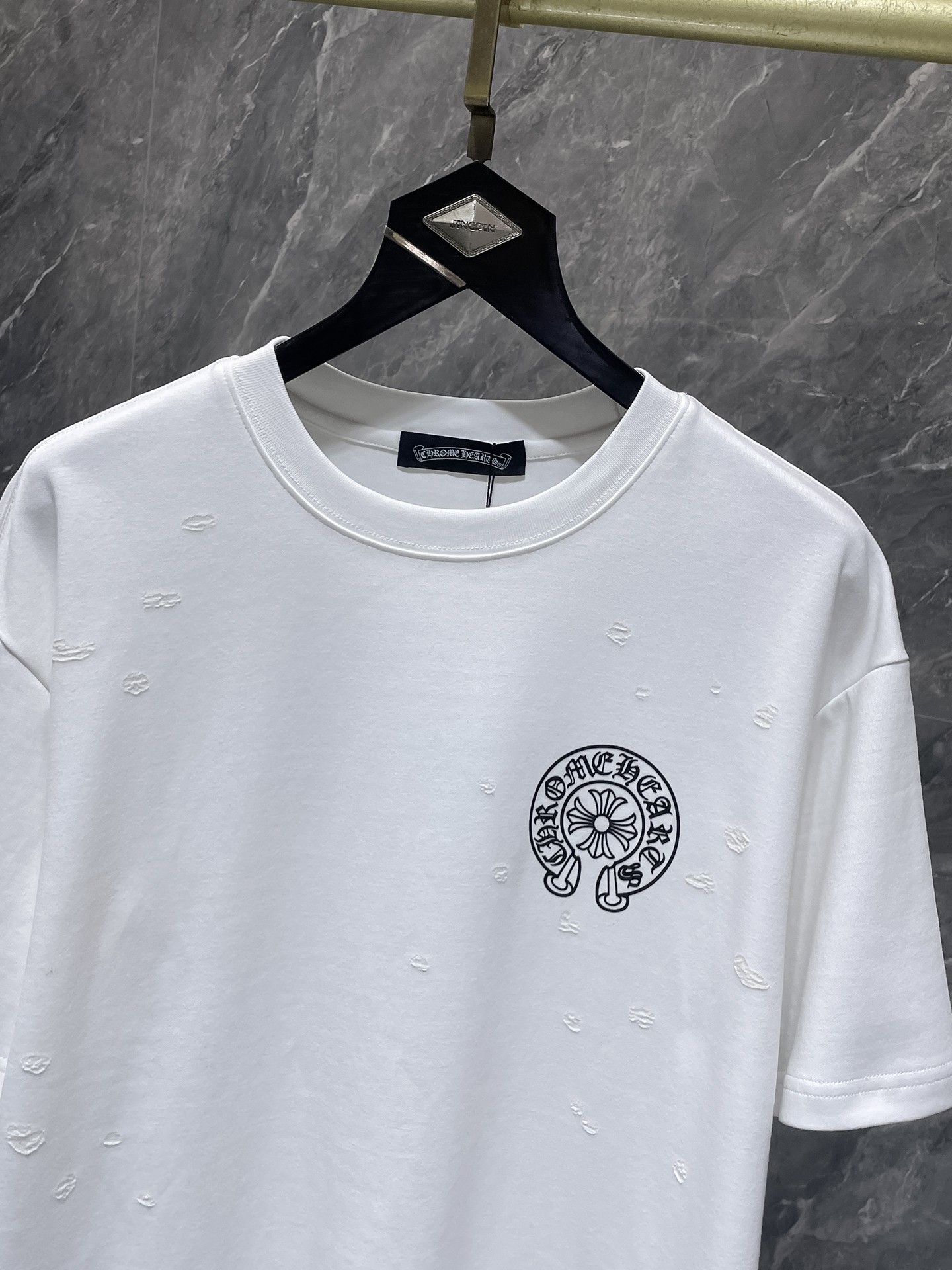 这款衣服是AAAAA 1:1 质量 (非常棒). 使用了和原版一模一样的材料. 商标部分也保持了和克罗心/Chrome Hearts一样. 图片拍摄是实物衣服拍摄, 您所收到的实物保证和我们图片一模一样.