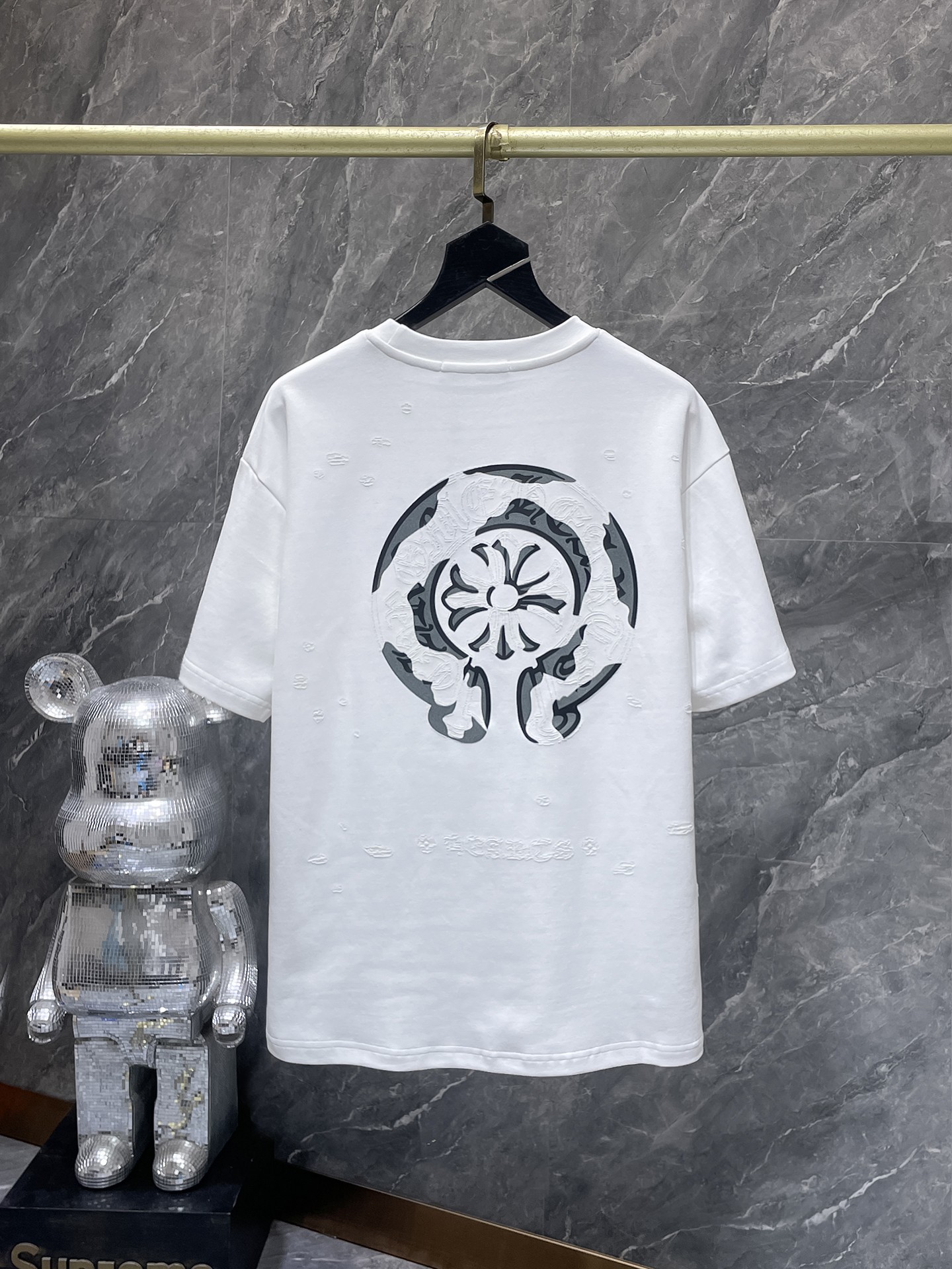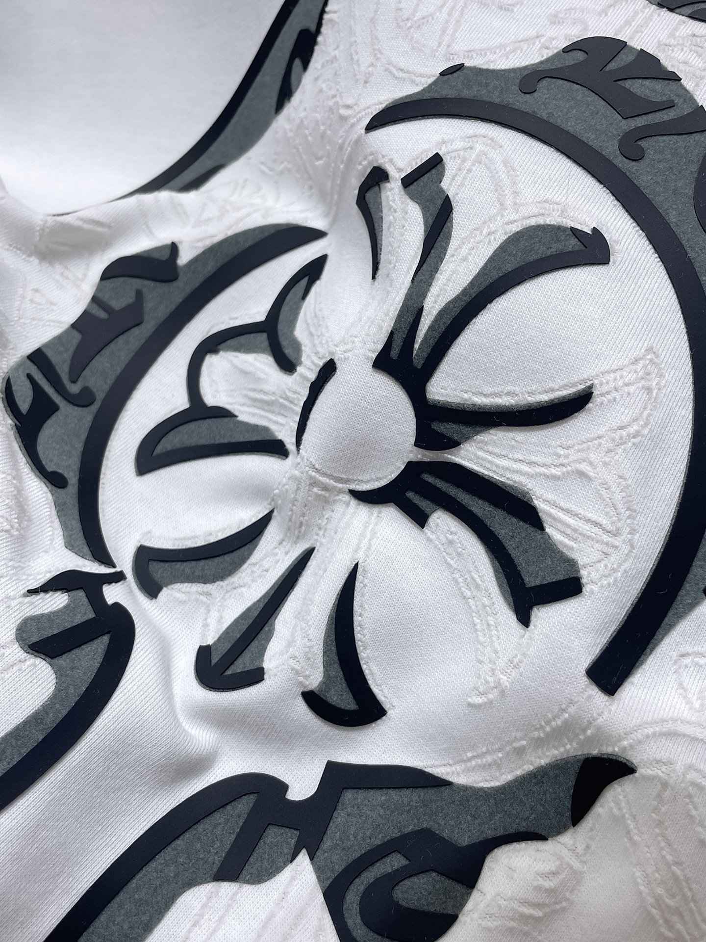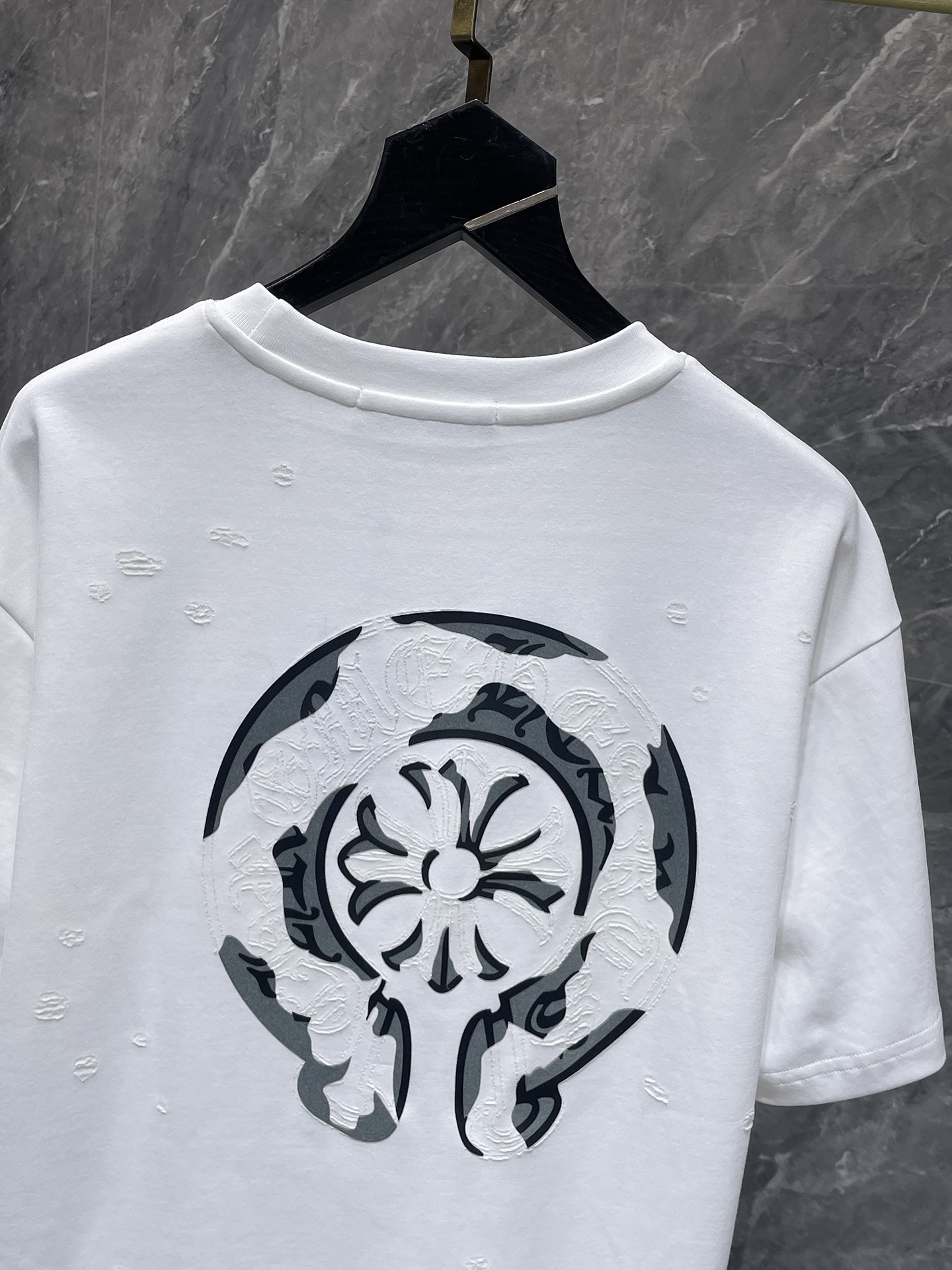这款衣服是AAAAA 1:1 质量 (非常棒). 使用了和原版一模一样的材料. 商标部分也保持了和克罗心/Chrome Hearts一样. 图片拍摄是实物衣服拍摄, 您所收到的实物保证和我们图片一模一样.