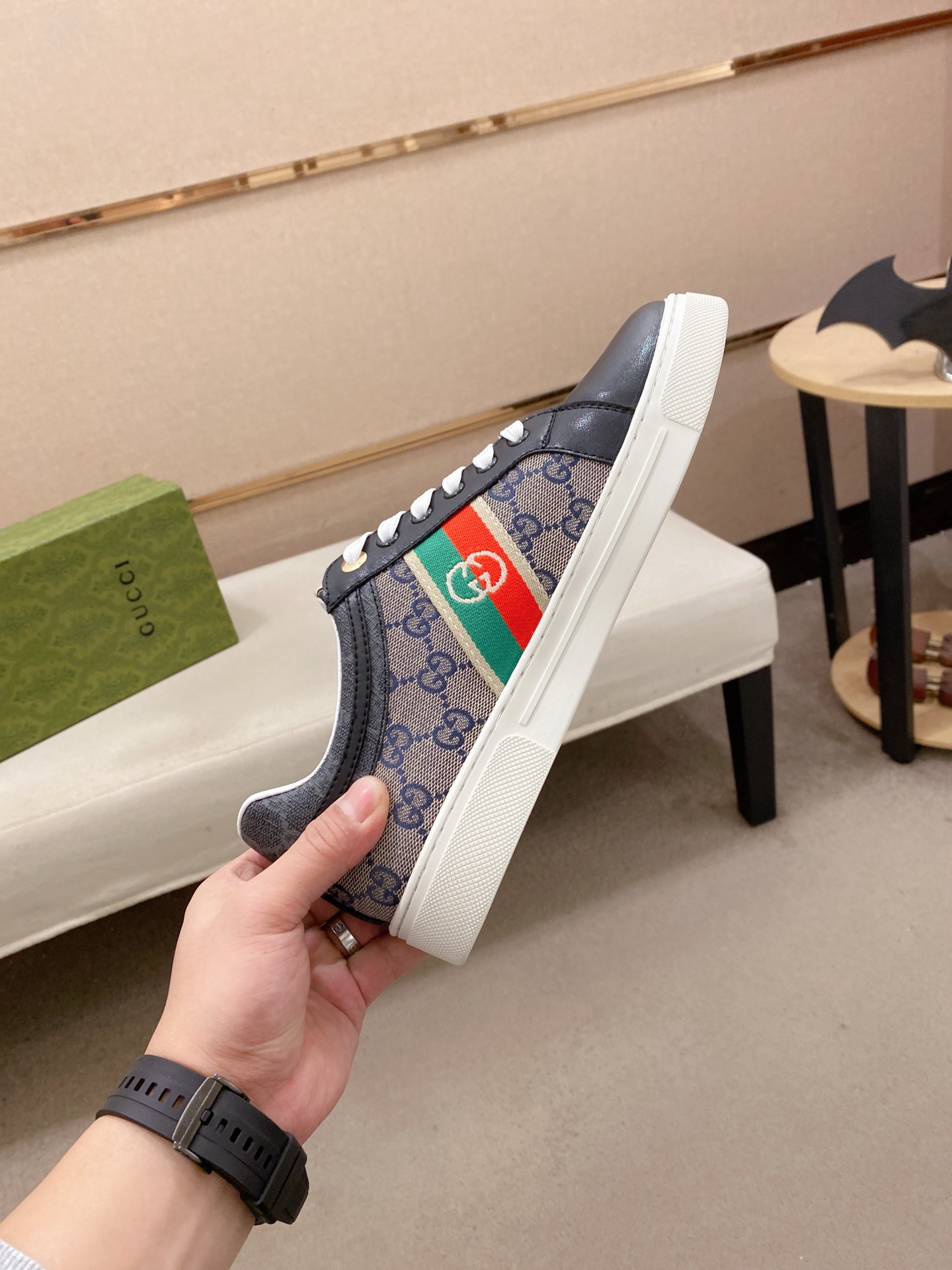 这款鞋子是AAAAA 1:1 质量 (非常棒). 使用了和原版一模一样的材料. 商标部分也保持了和古奇/Gucci一样. 图片拍摄是实物鞋子拍摄, 您所收到的实物保证和我们图片一模一样.