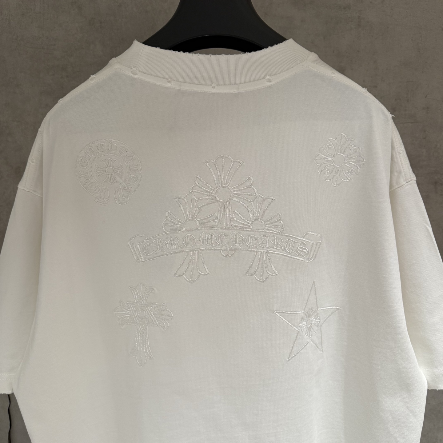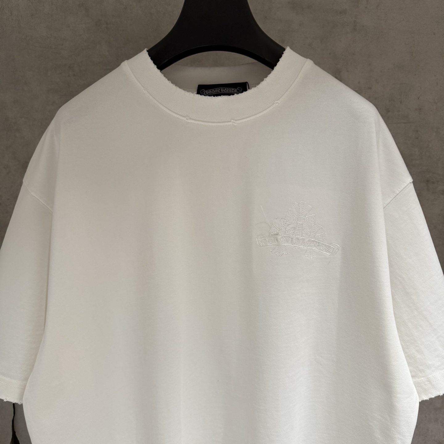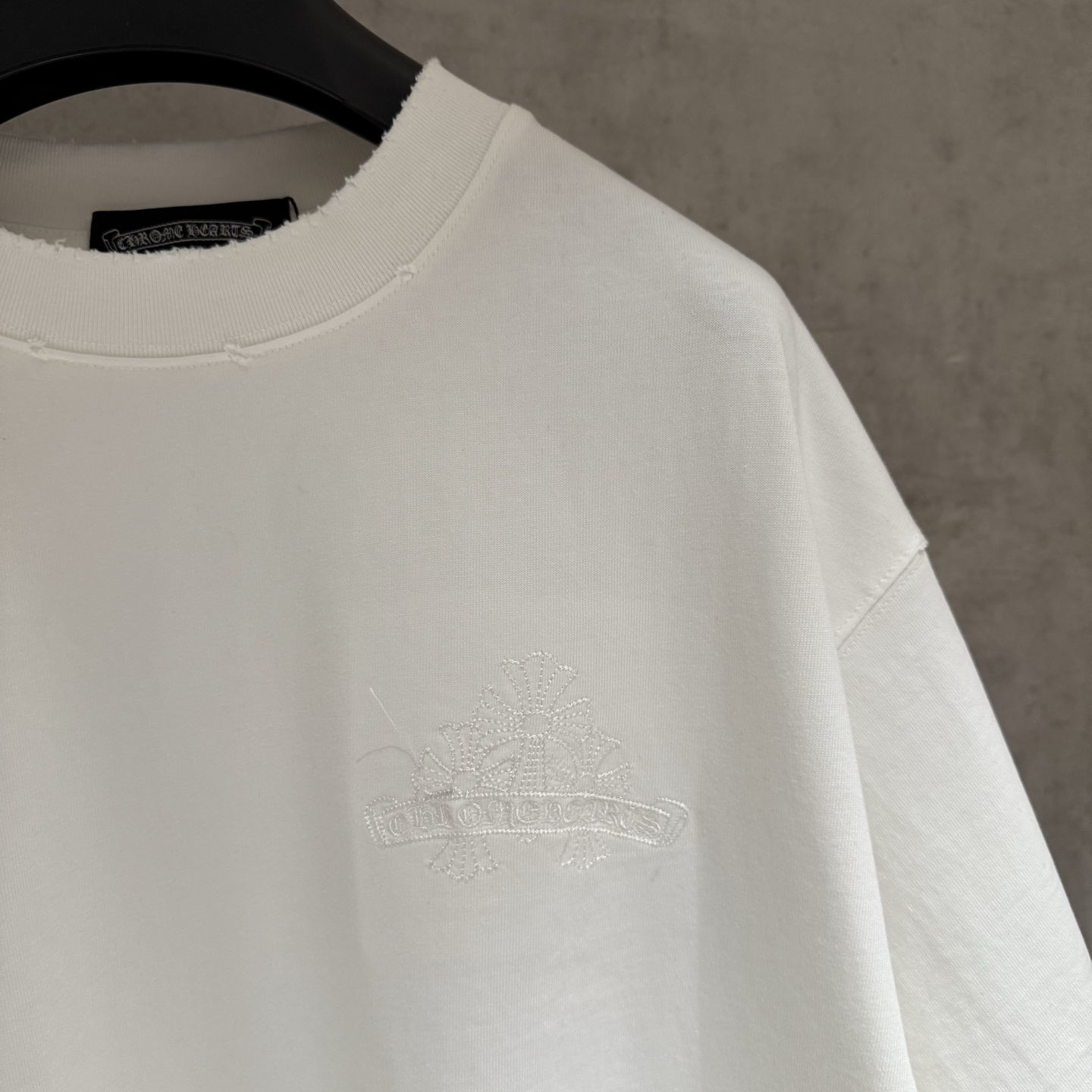 这款衣服是AAAAA 1:1 质量 (非常棒). 使用了和原版一模一样的材料. 商标部分也保持了和克罗心/Chrome Hearts一样. 图片拍摄是实物衣服拍摄, 您所收到的实物保证和我们图片一模一样.