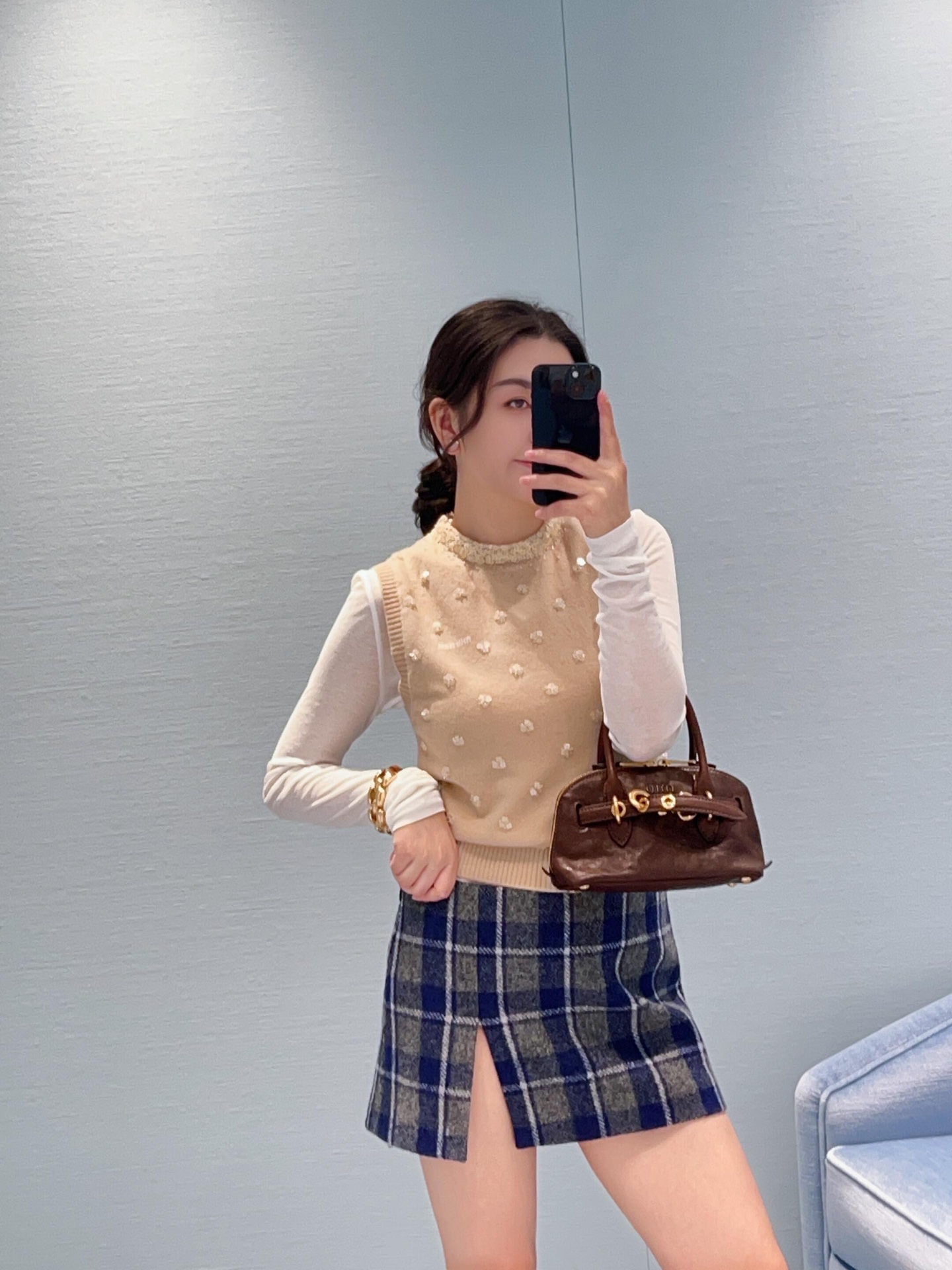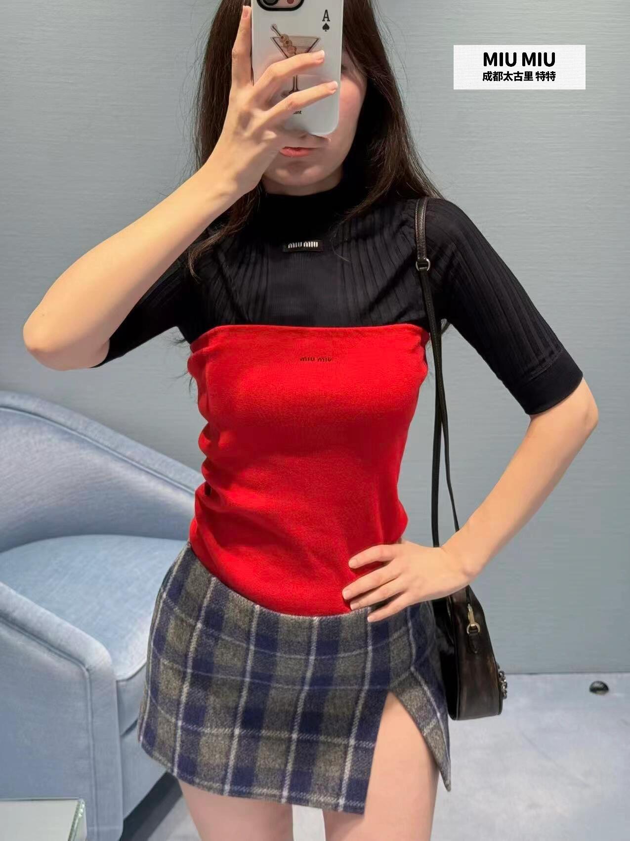 这款衣服是AAAAA 1:1 质量 (非常棒). 使用了和原版一模一样的材料. 商标部分也保持了和缪缪/Miu Miu一样. 图片拍摄是实物衣服拍摄, 您所收到的实物保证和我们图片一模一样.