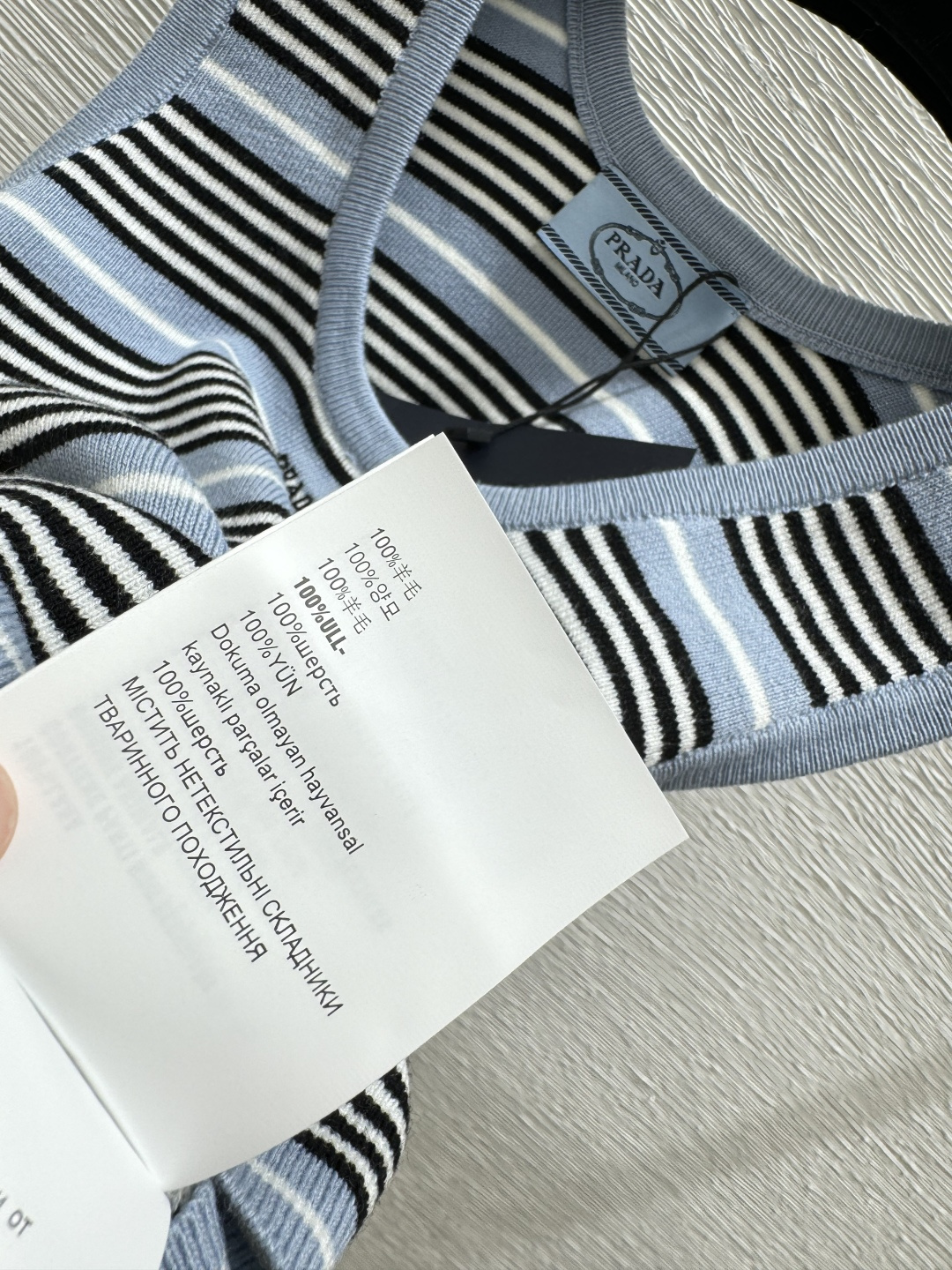 这款衣服是AAAAA 1:1 质量 (非常棒). 使用了和原版一模一样的材料. 商标部分也保持了和普拉达/Prada一样. 图片拍摄是实物衣服拍摄, 您所收到的实物保证和我们图片一模一样.