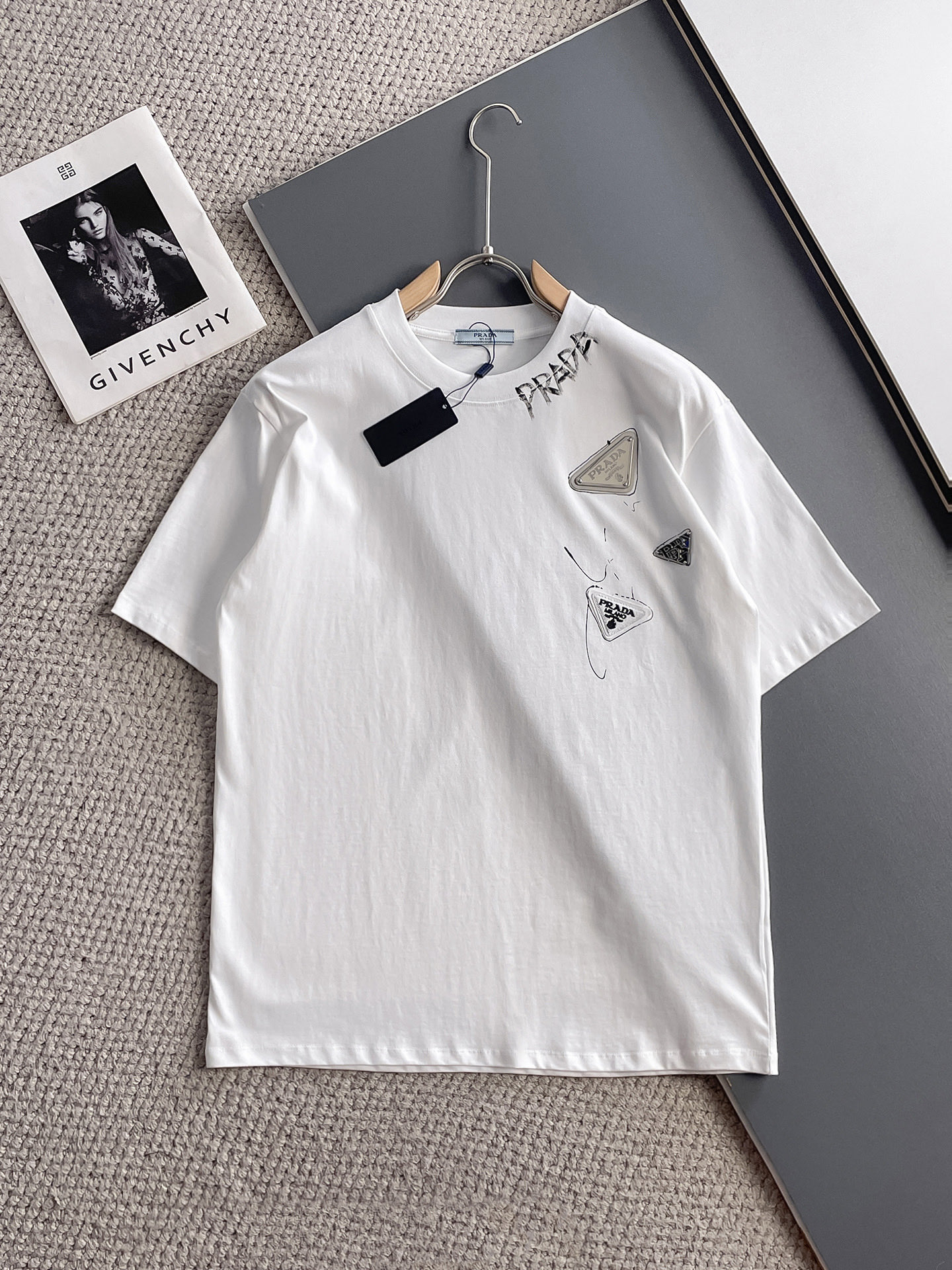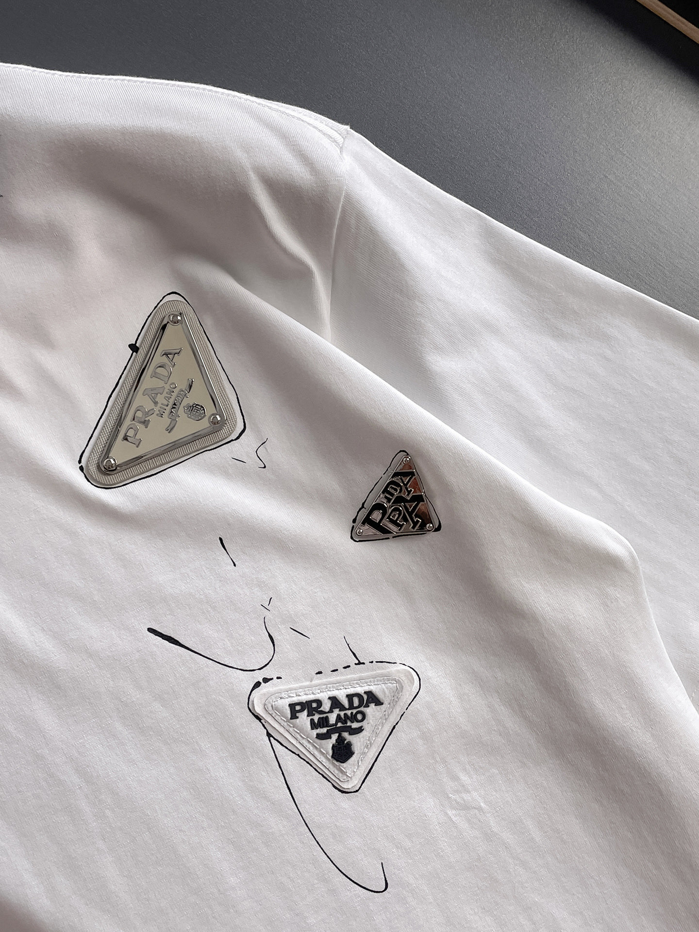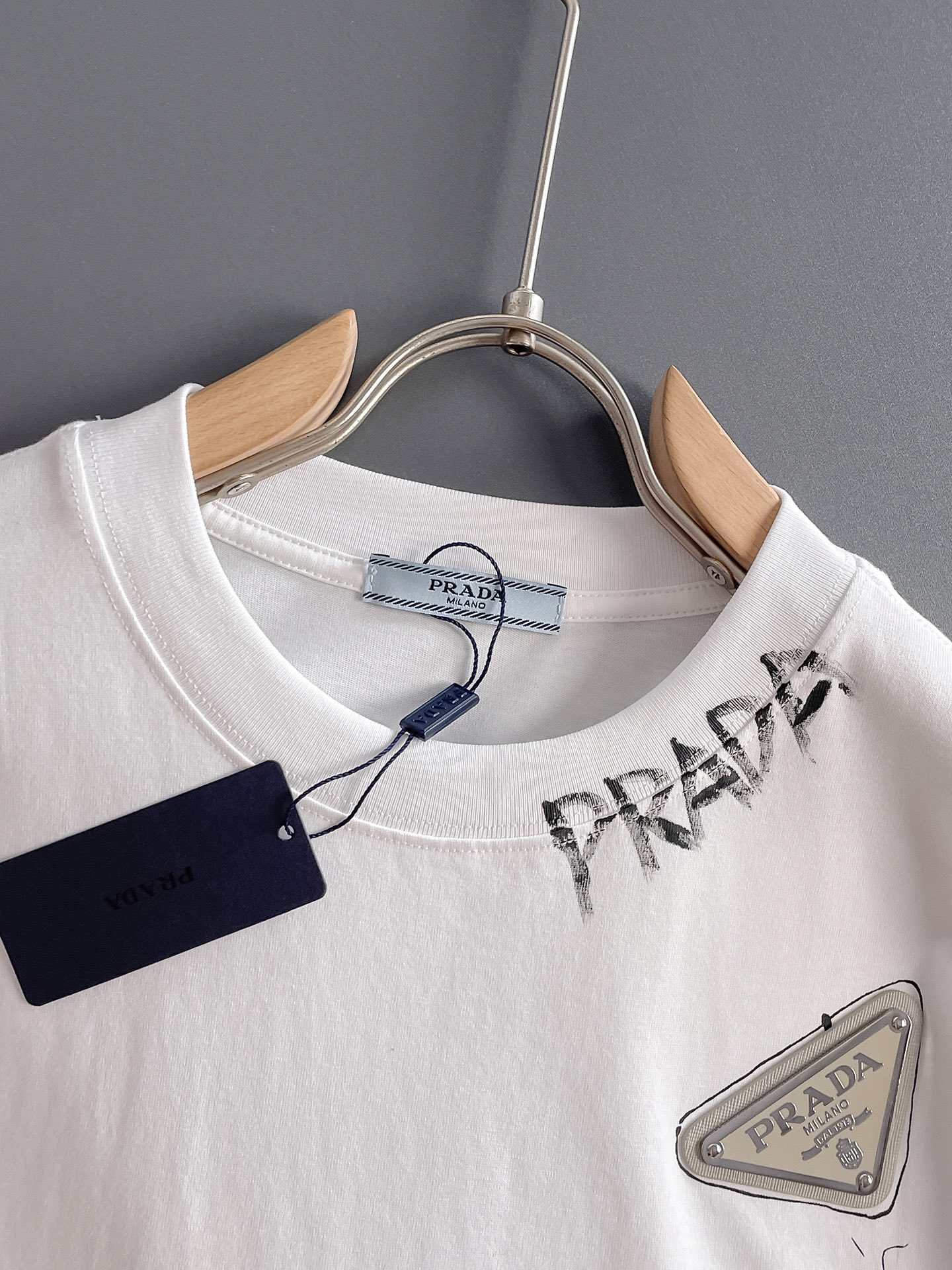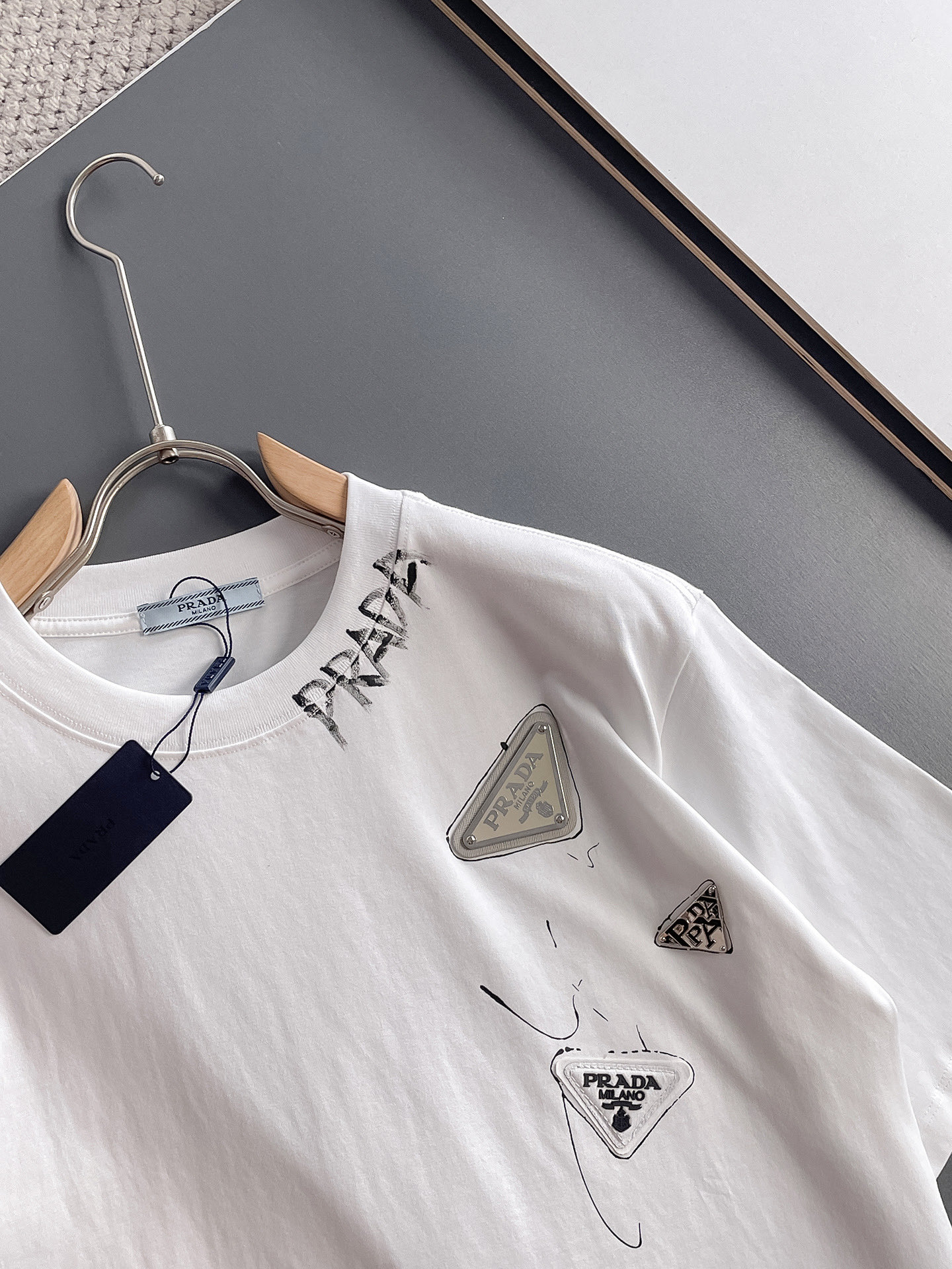 这款衣服是AAAAA 1:1 质量 (非常棒). 使用了和原版一模一样的材料. 商标部分也保持了和普拉达/Prada一样. 图片拍摄是实物衣服拍摄, 您所收到的实物保证和我们图片一模一样.
