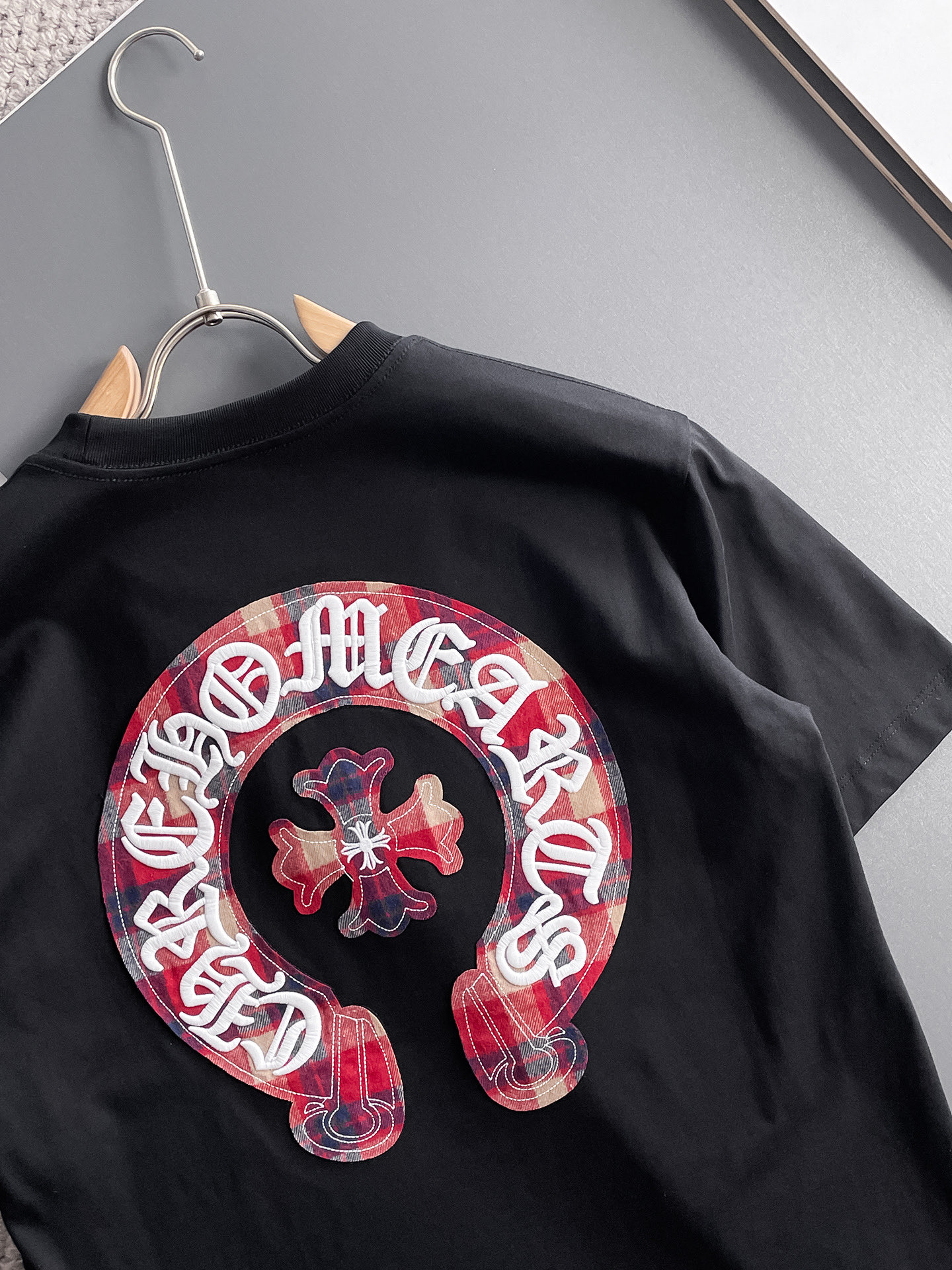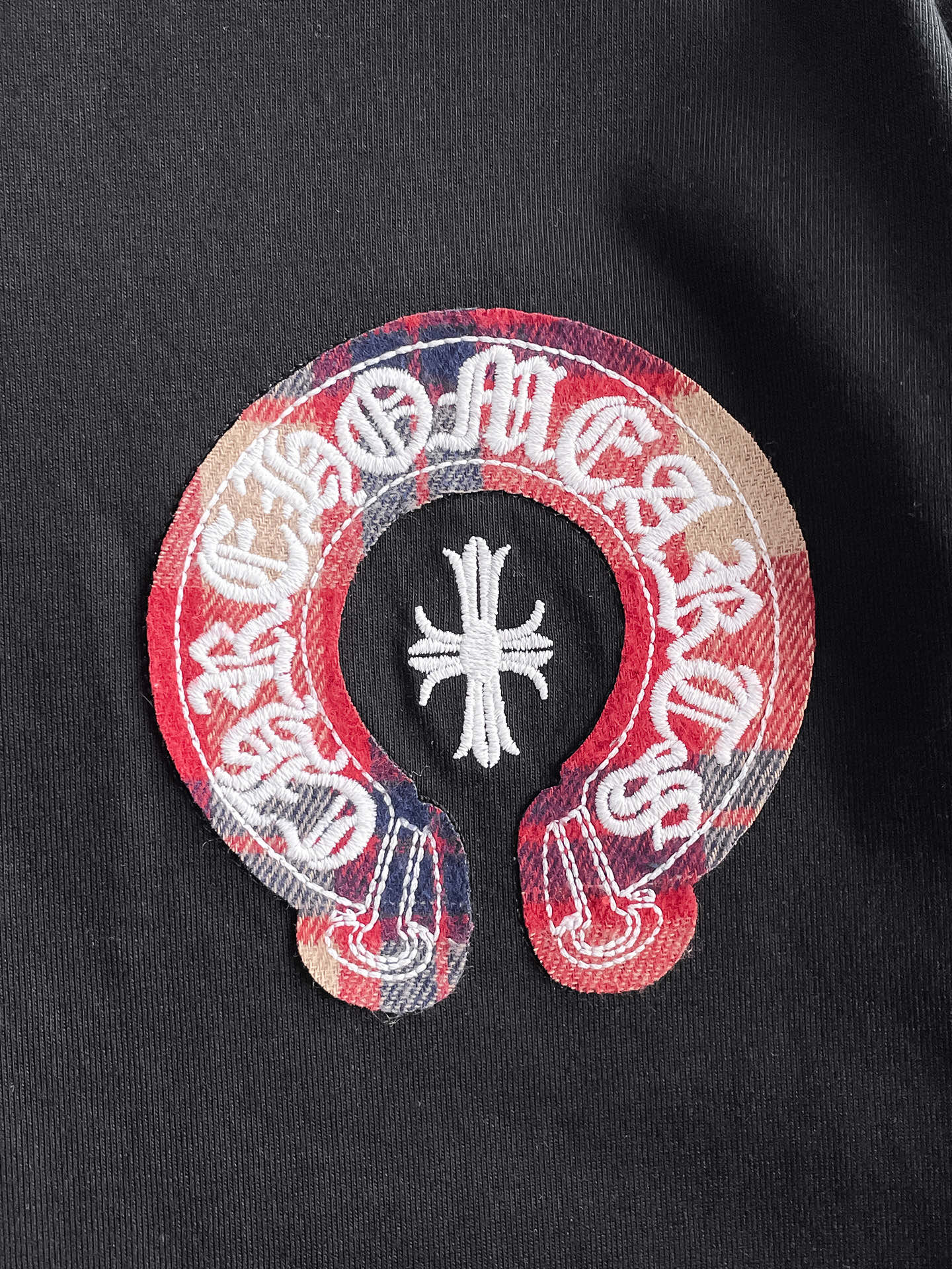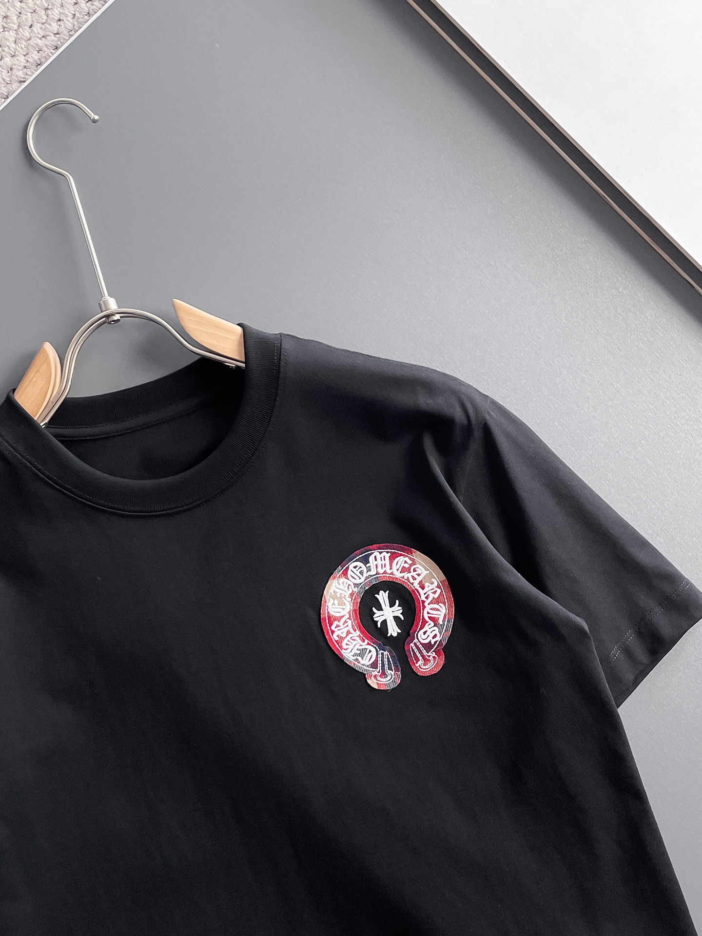 这款衣服是AAAAA 1:1 质量 (非常棒). 使用了和原版一模一样的材料. 商标部分也保持了和克罗心/Chrome Hearts一样. 图片拍摄是实物衣服拍摄, 您所收到的实物保证和我们图片一模一样.