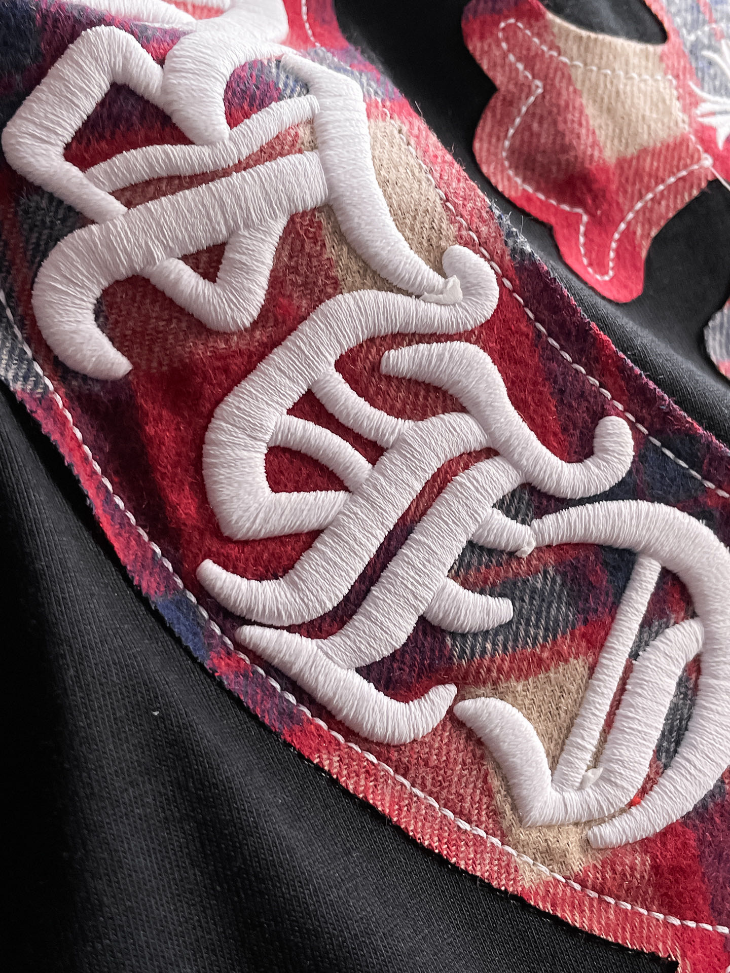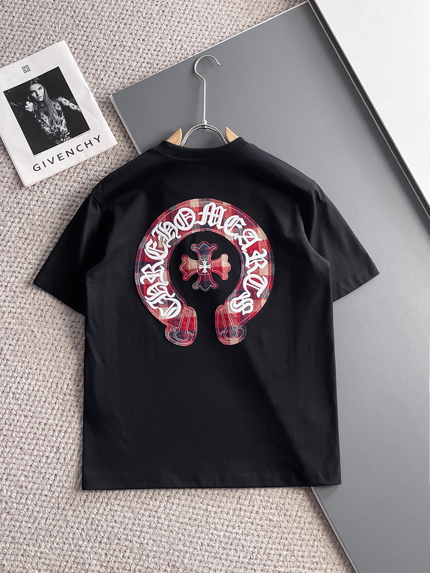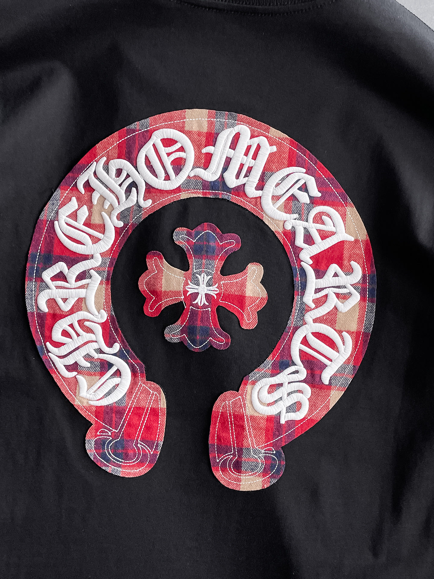 这款衣服是AAAAA 1:1 质量 (非常棒). 使用了和原版一模一样的材料. 商标部分也保持了和克罗心/Chrome Hearts一样. 图片拍摄是实物衣服拍摄, 您所收到的实物保证和我们图片一模一样.