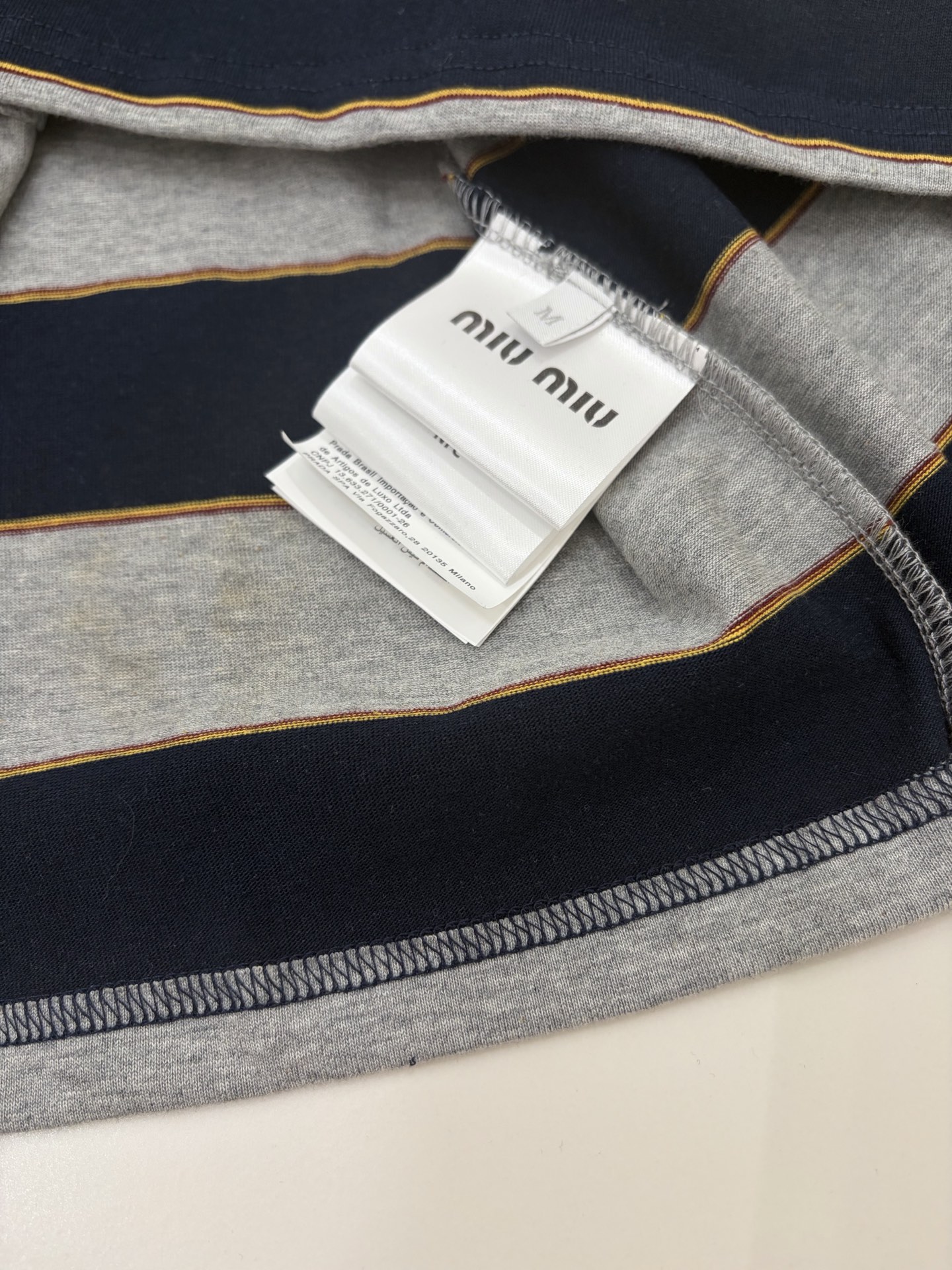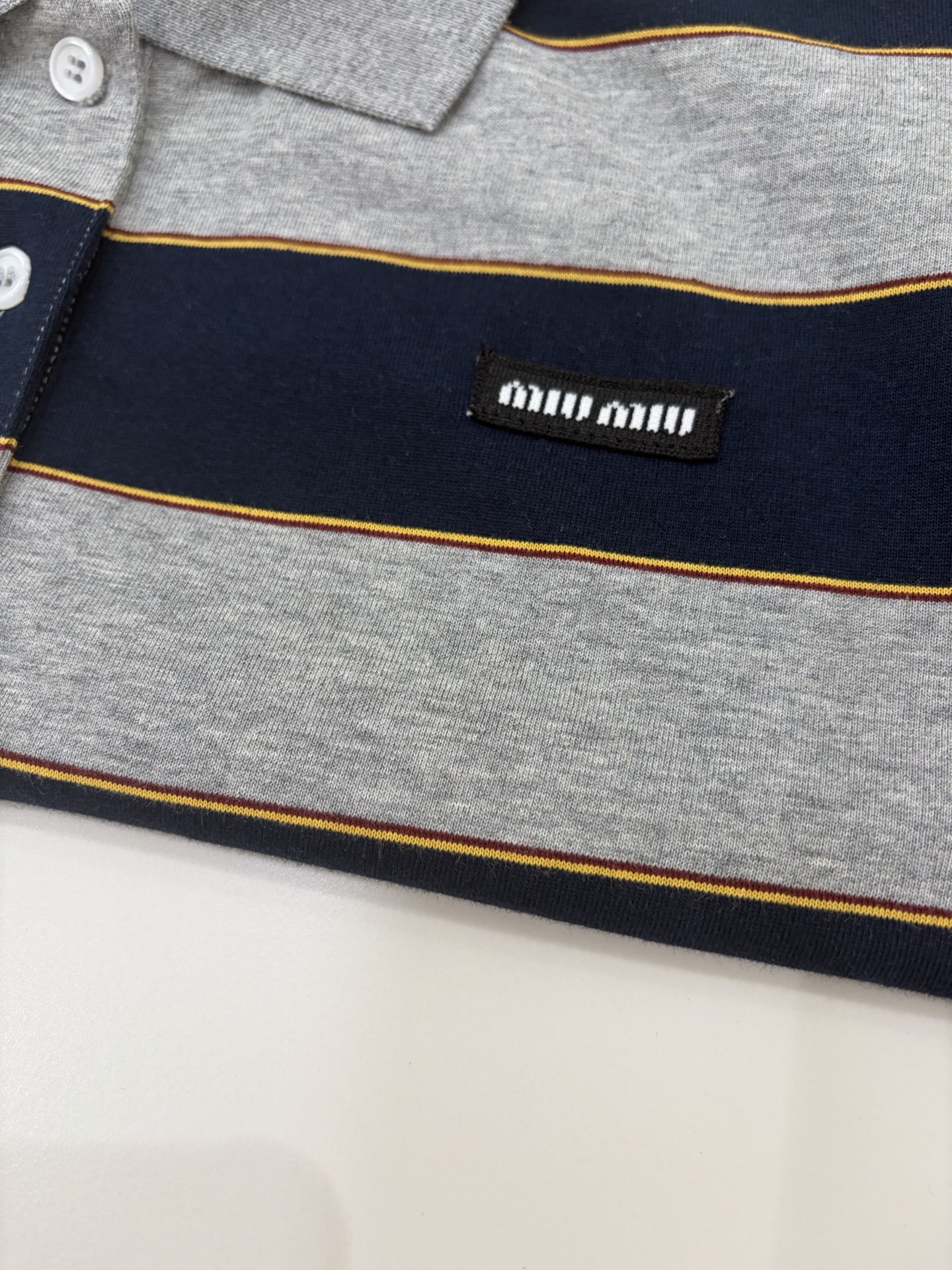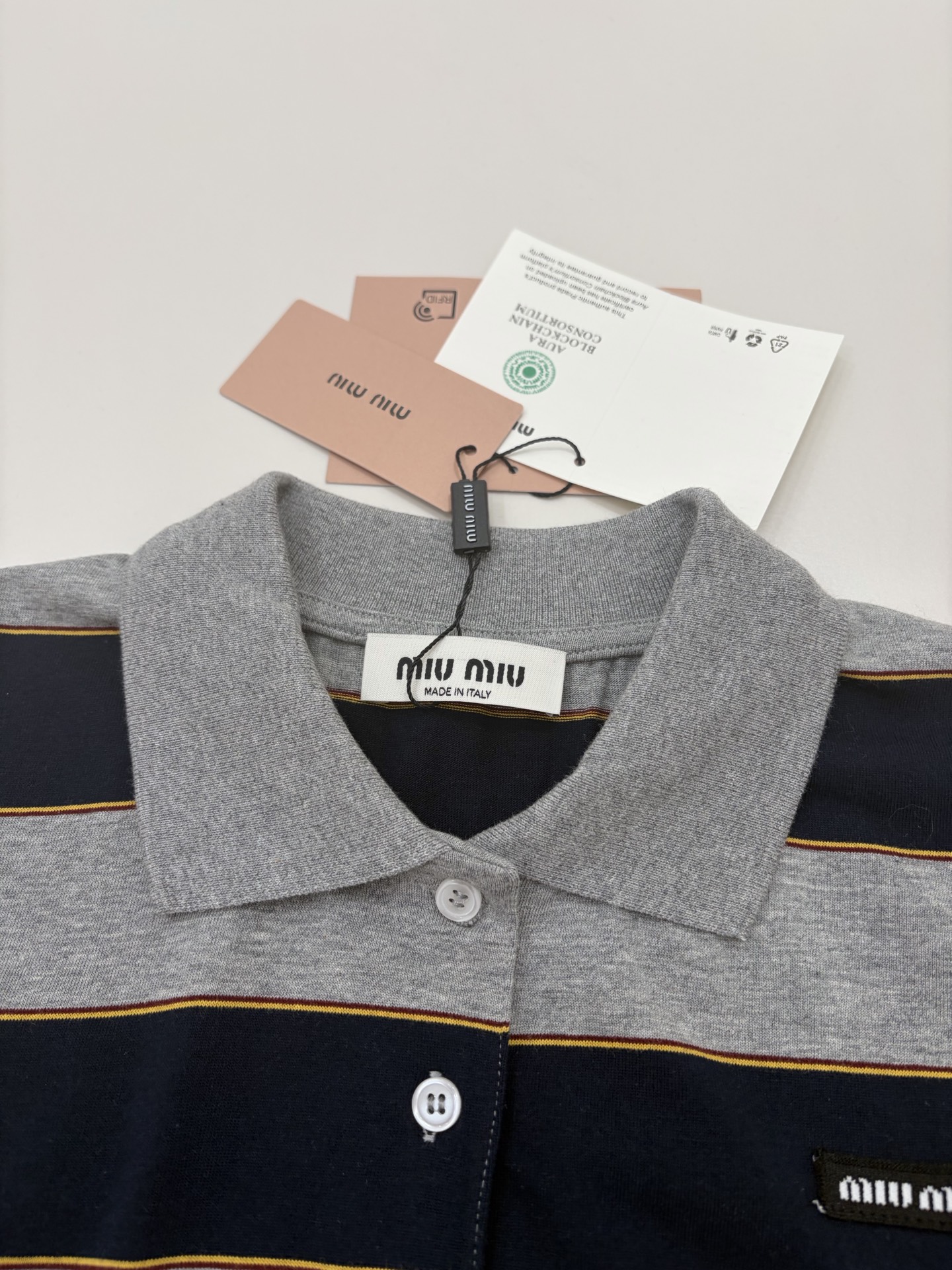 这款衣服是AAAAA 1:1 质量 (非常棒). 使用了和原版一模一样的材料. 商标部分也保持了和缪缪/Miu Miu一样. 图片拍摄是实物衣服拍摄, 您所收到的实物保证和我们图片一模一样.