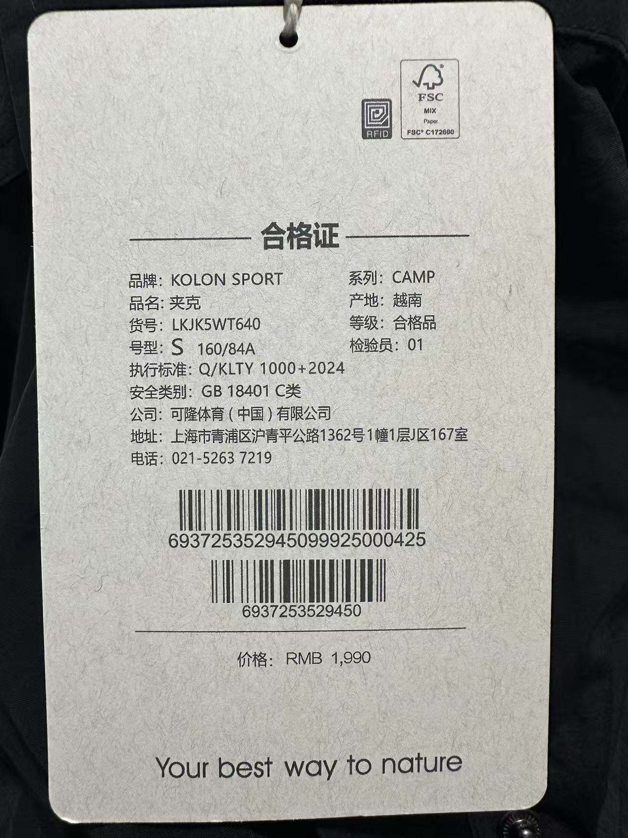 这款衣服是AAAAA 1:1 质量 (非常棒). 使用了和原版一模一样的材料. 商标部分也保持了和KOLON一样. 图片拍摄是实物衣服拍摄, 您所收到的实物保证和我们图片一模一样.