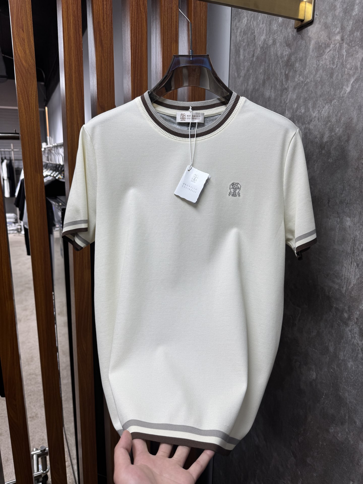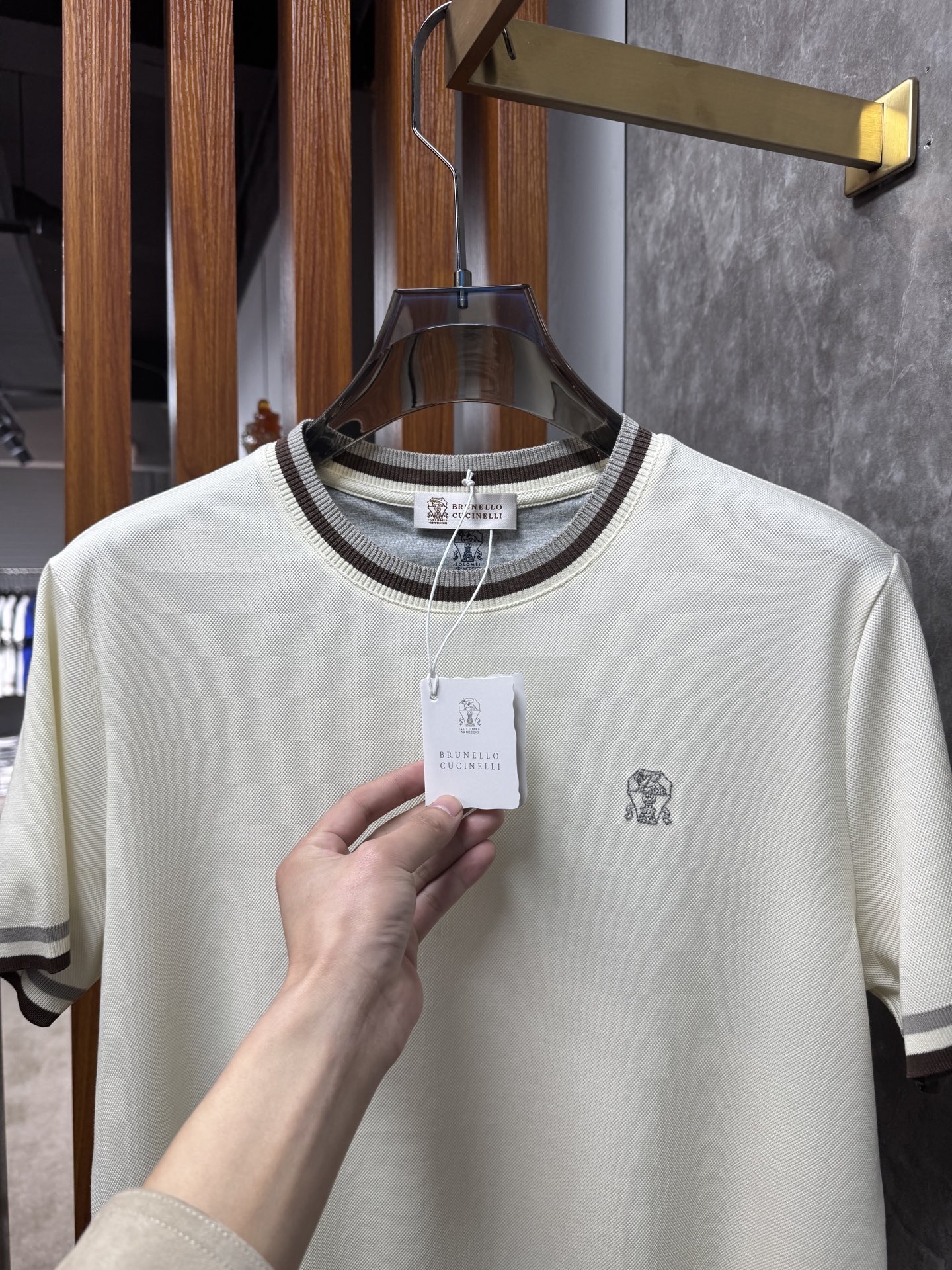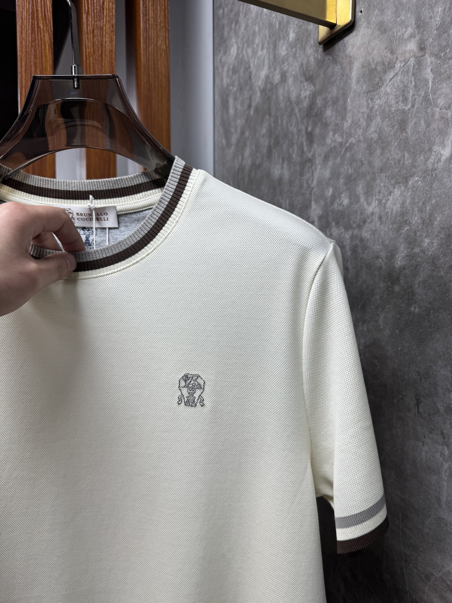 这款衣服是AAAAA 1:1 质量 (非常棒). 使用了和原版一模一样的材料. 商标部分也保持了和Brunello Cucinelli一样. 图片拍摄是实物衣服拍摄, 您所收到的实物保证和我们图片一模一样.