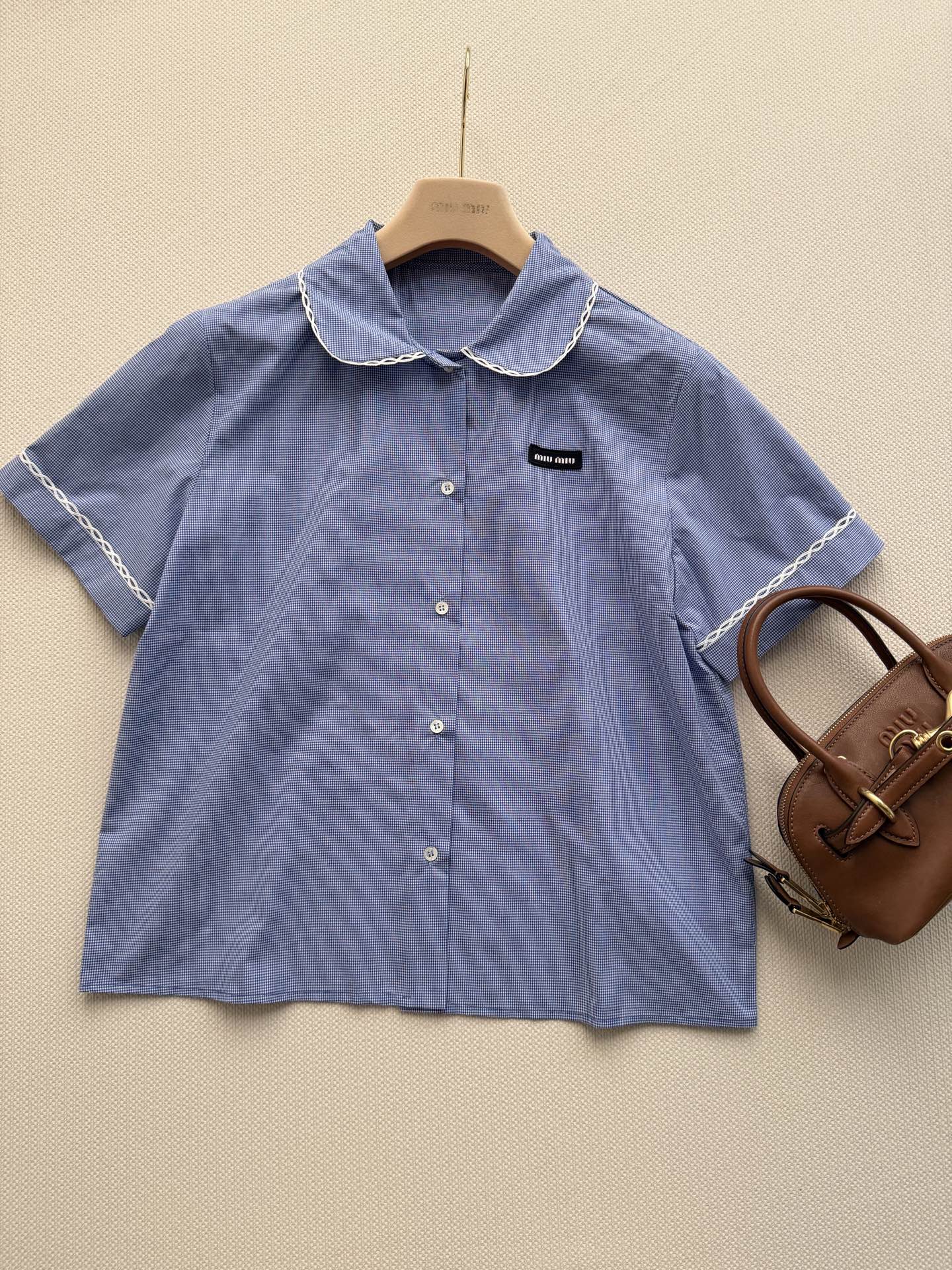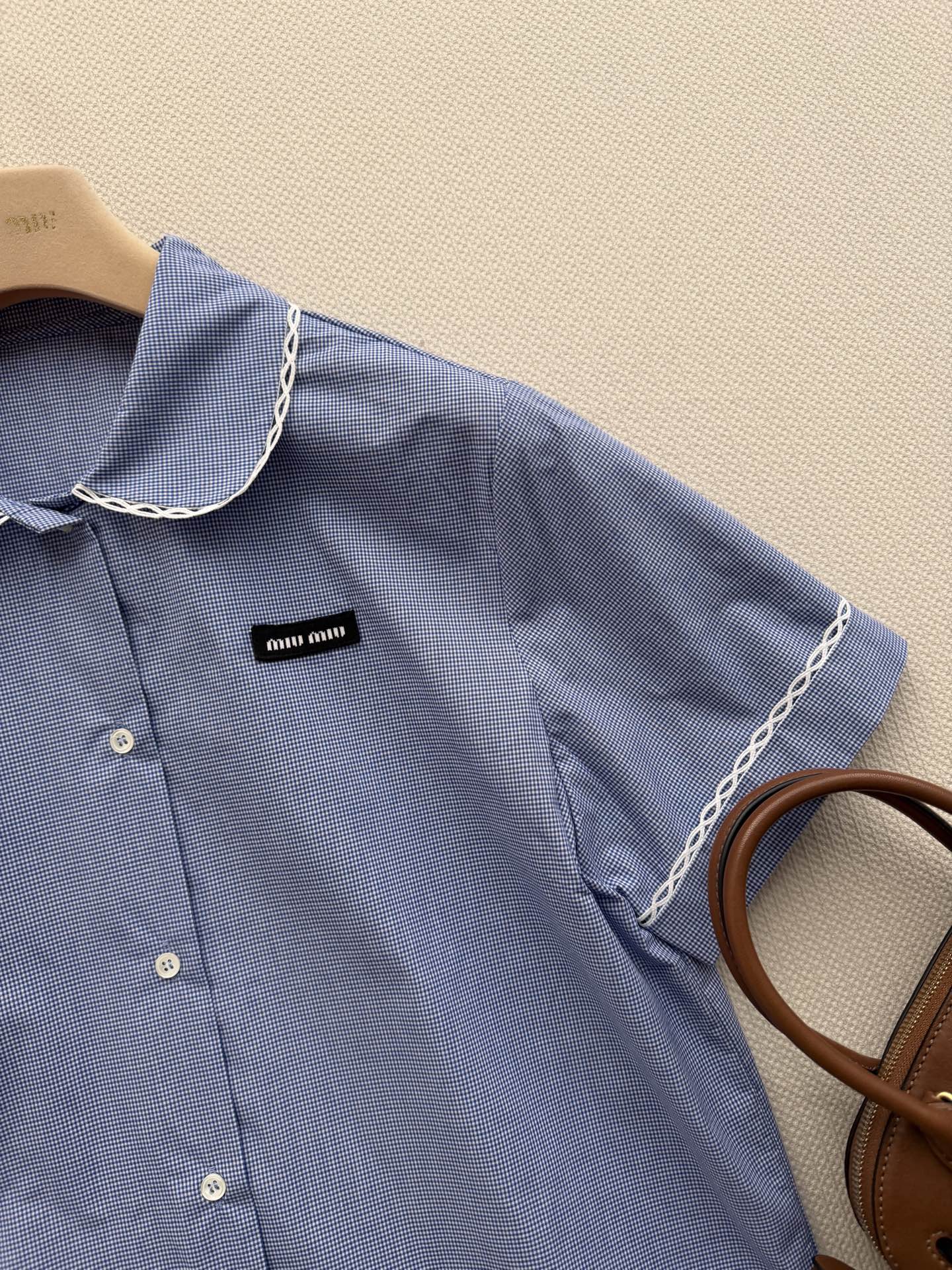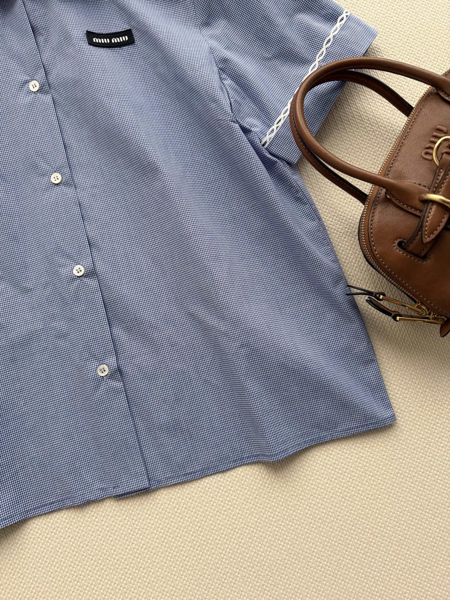 这款衣服是AAAAA 1:1 质量 (非常棒). 使用了和原版一模一样的材料. 商标部分也保持了和缪缪/Miu Miu一样. 图片拍摄是实物衣服拍摄, 您所收到的实物保证和我们图片一模一样.