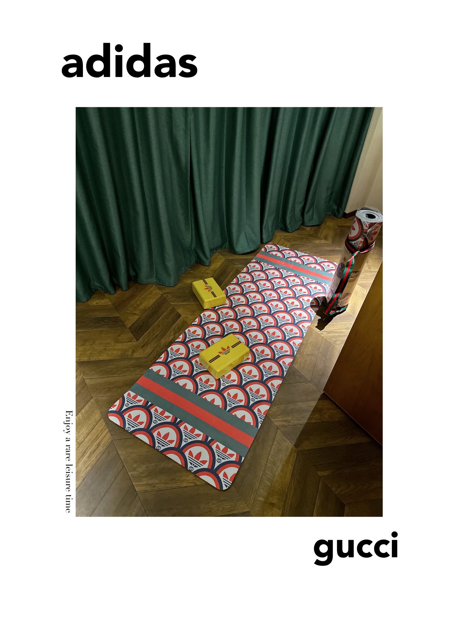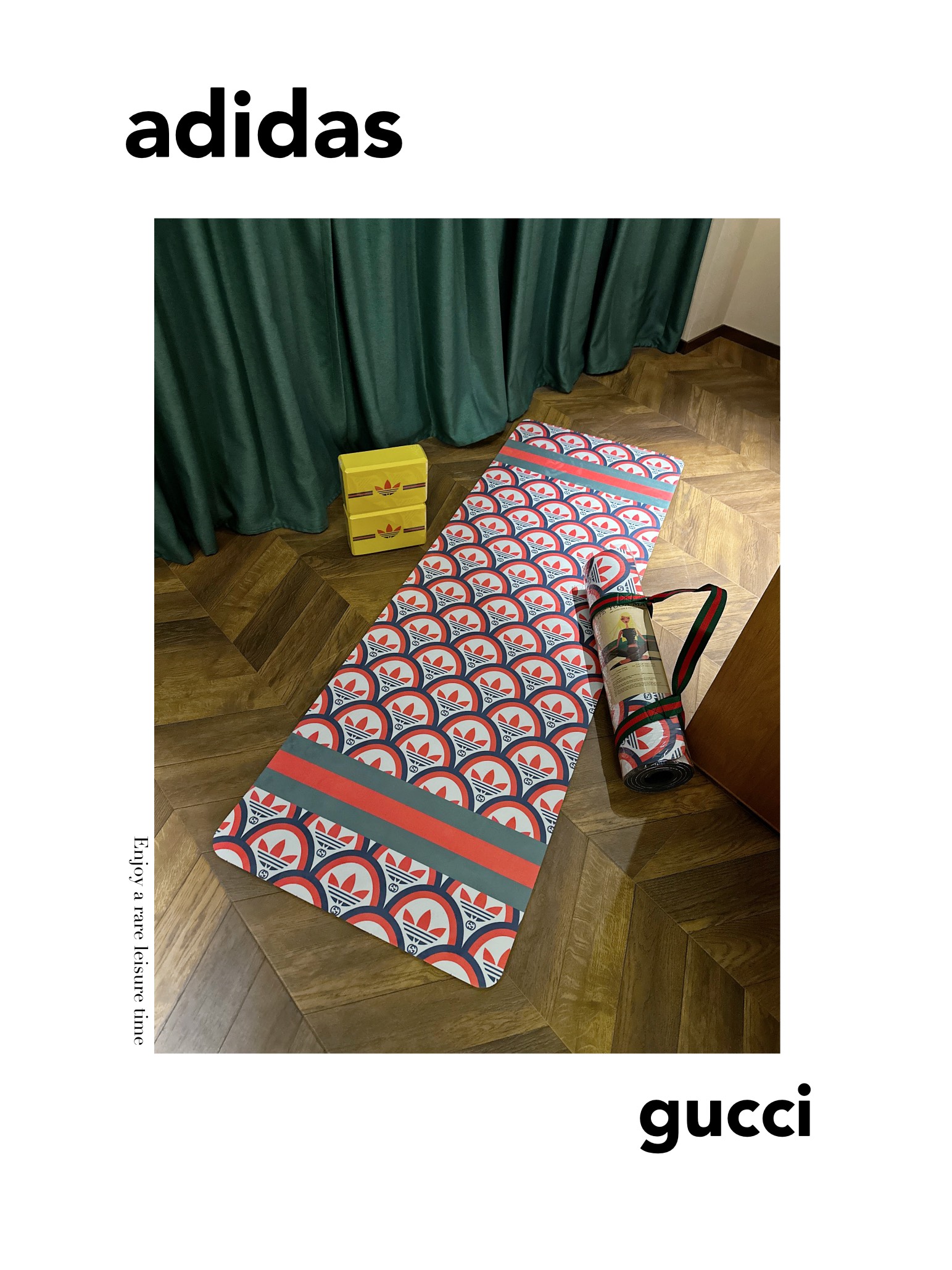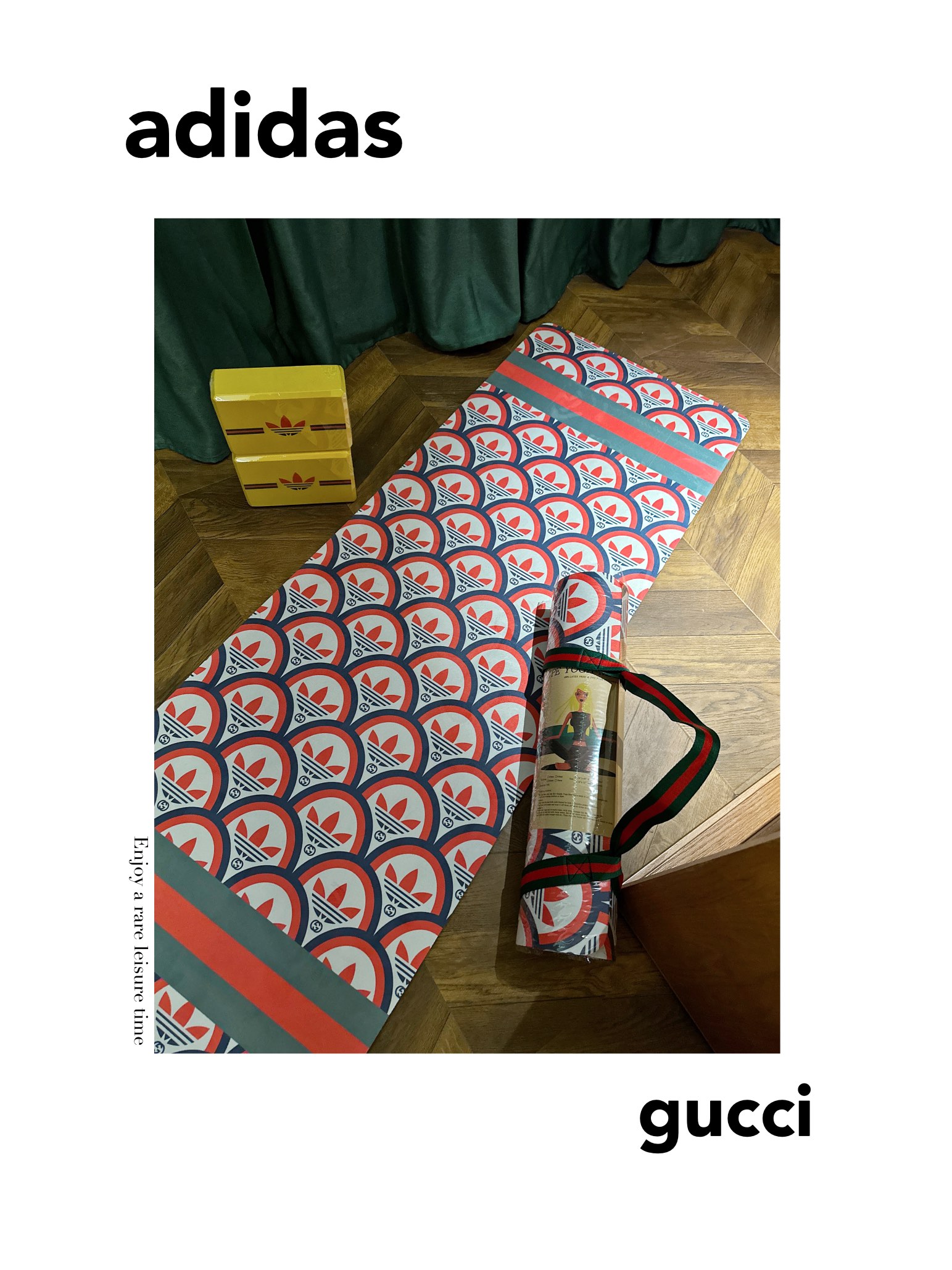这款yoga mat是AAAAA 1:1 质量 (非常棒). 使用了和原版一模一样的材料. 商标部分也保持了和Gucci & Adidas一样. 图片拍摄是实物yoga mat拍摄, 您所收到的实物保证和我们图片一模一样.