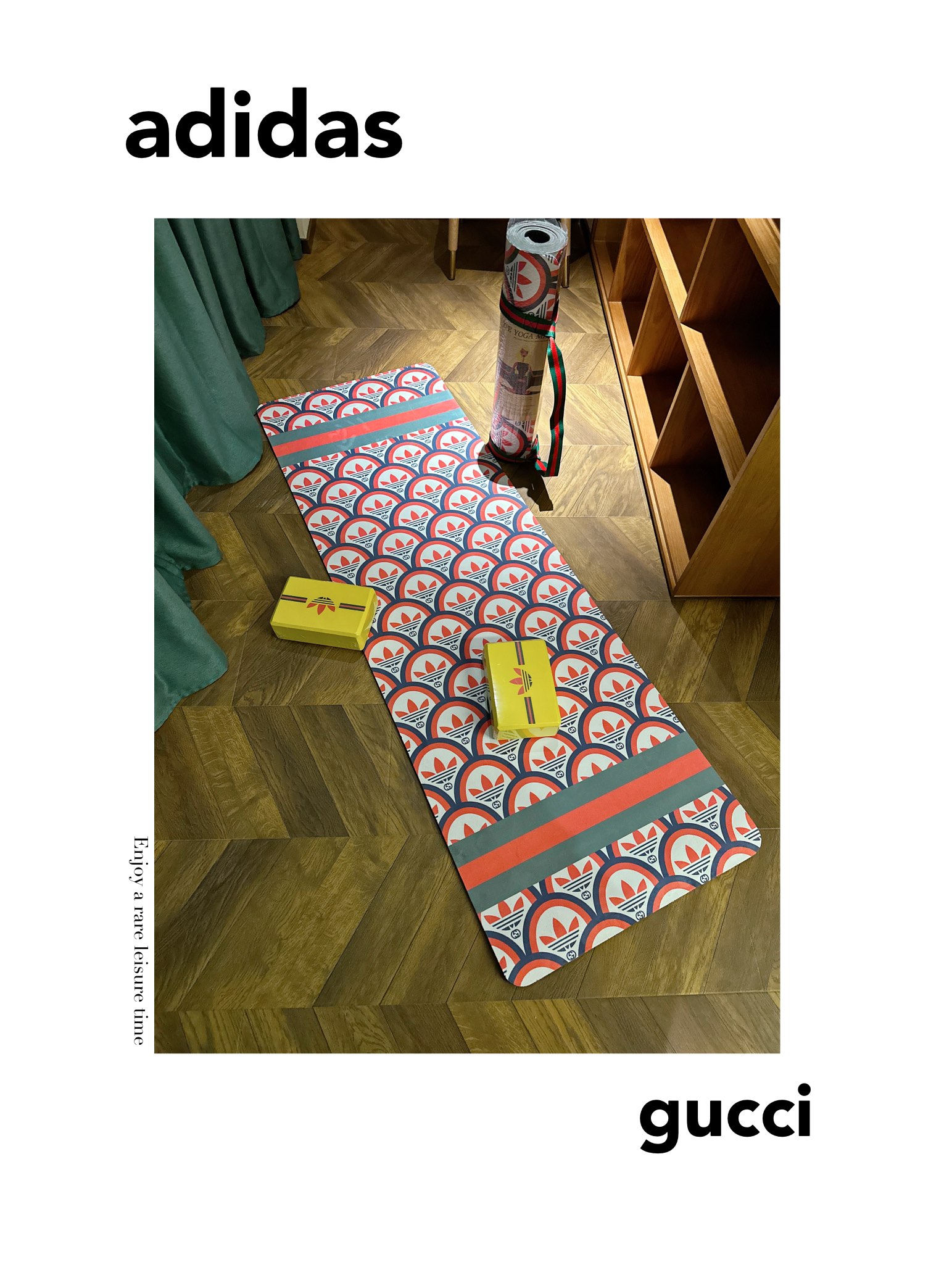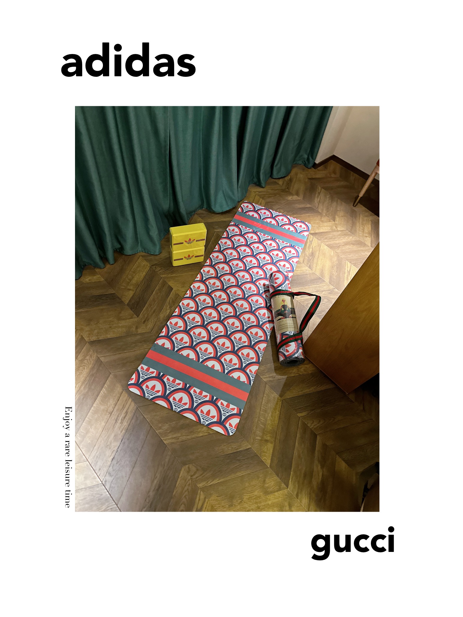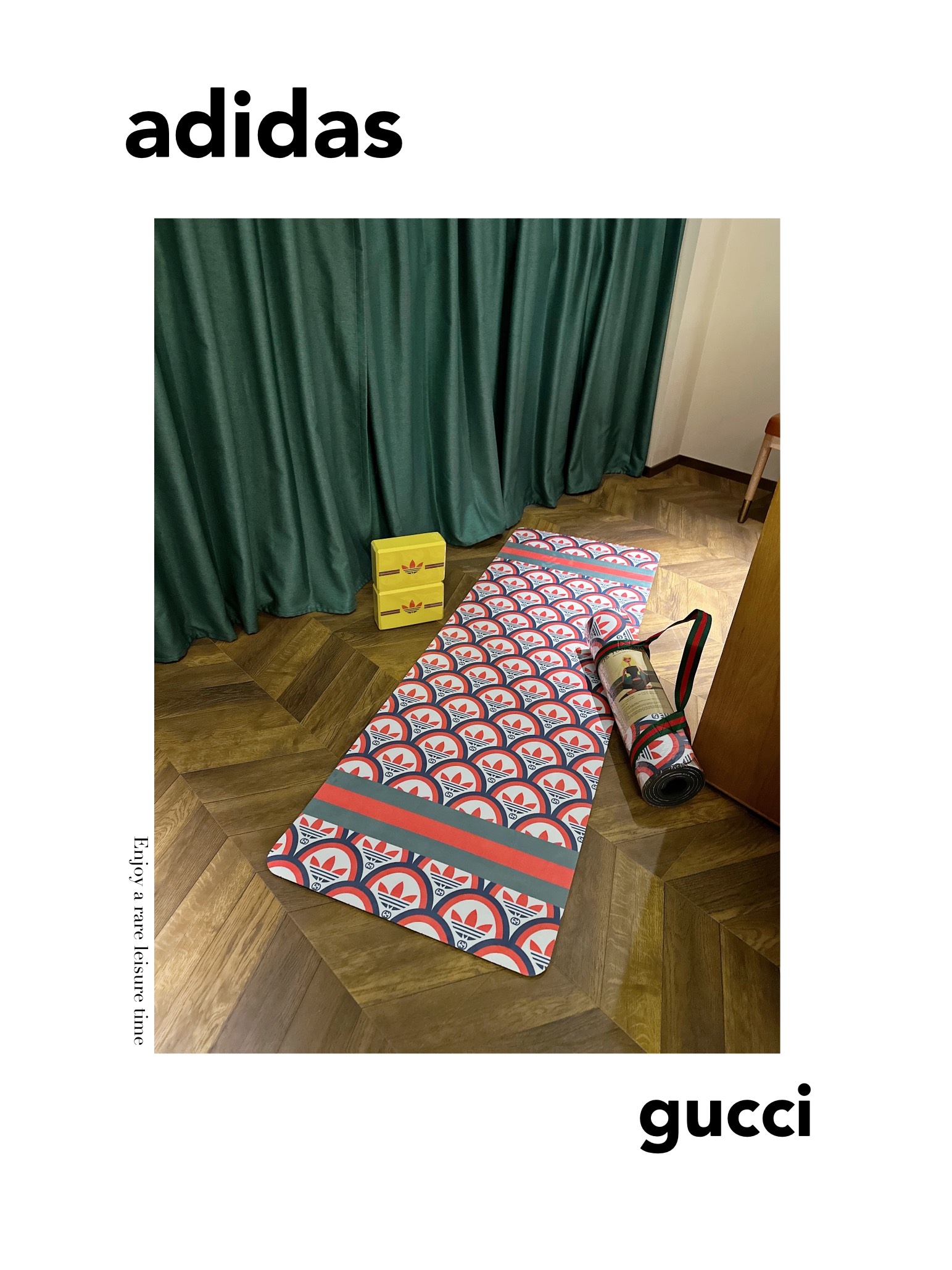 这款yoga mat是AAAAA 1:1 质量 (非常棒). 使用了和原版一模一样的材料. 商标部分也保持了和Gucci & Adidas一样. 图片拍摄是实物yoga mat拍摄, 您所收到的实物保证和我们图片一模一样.