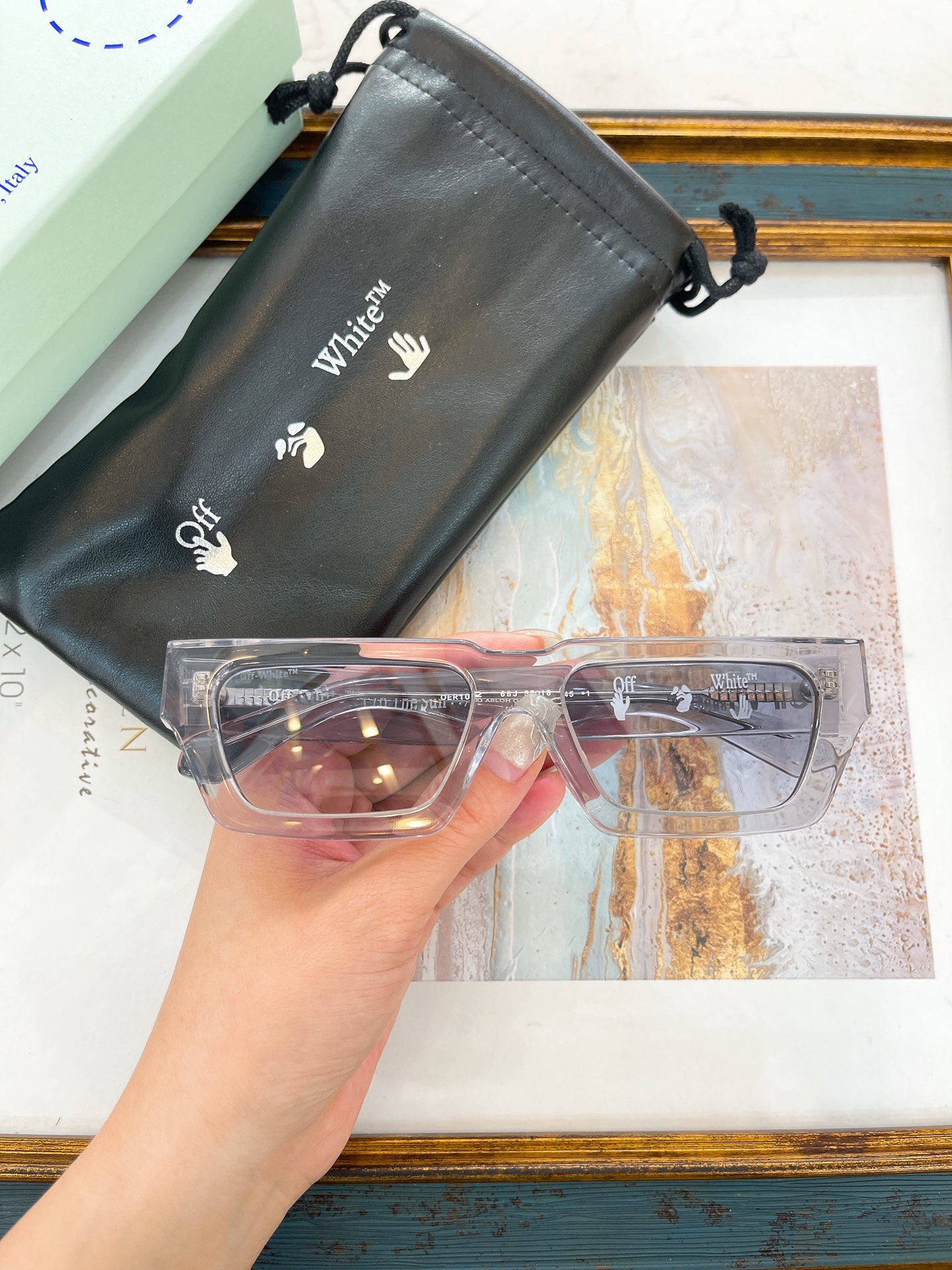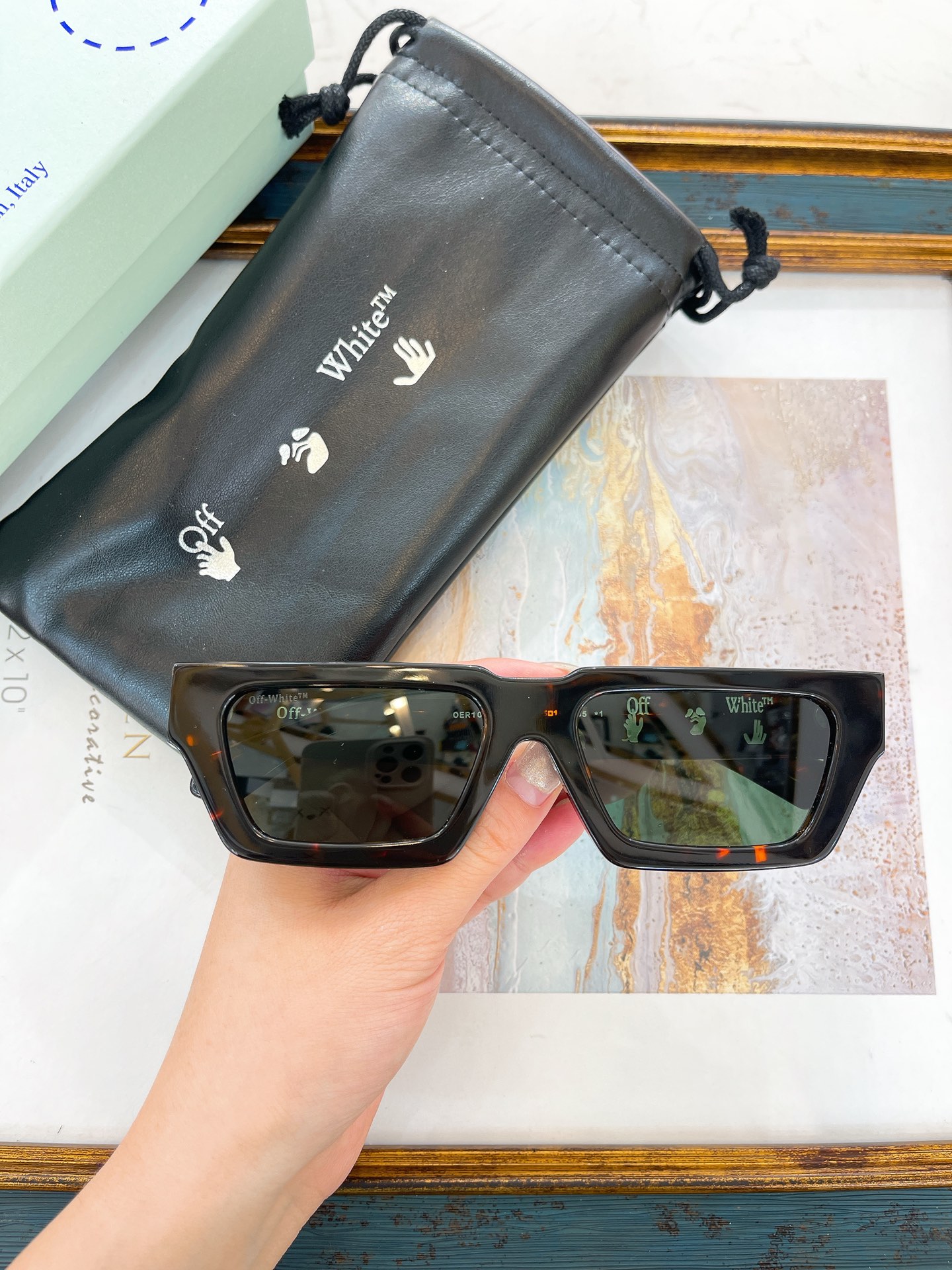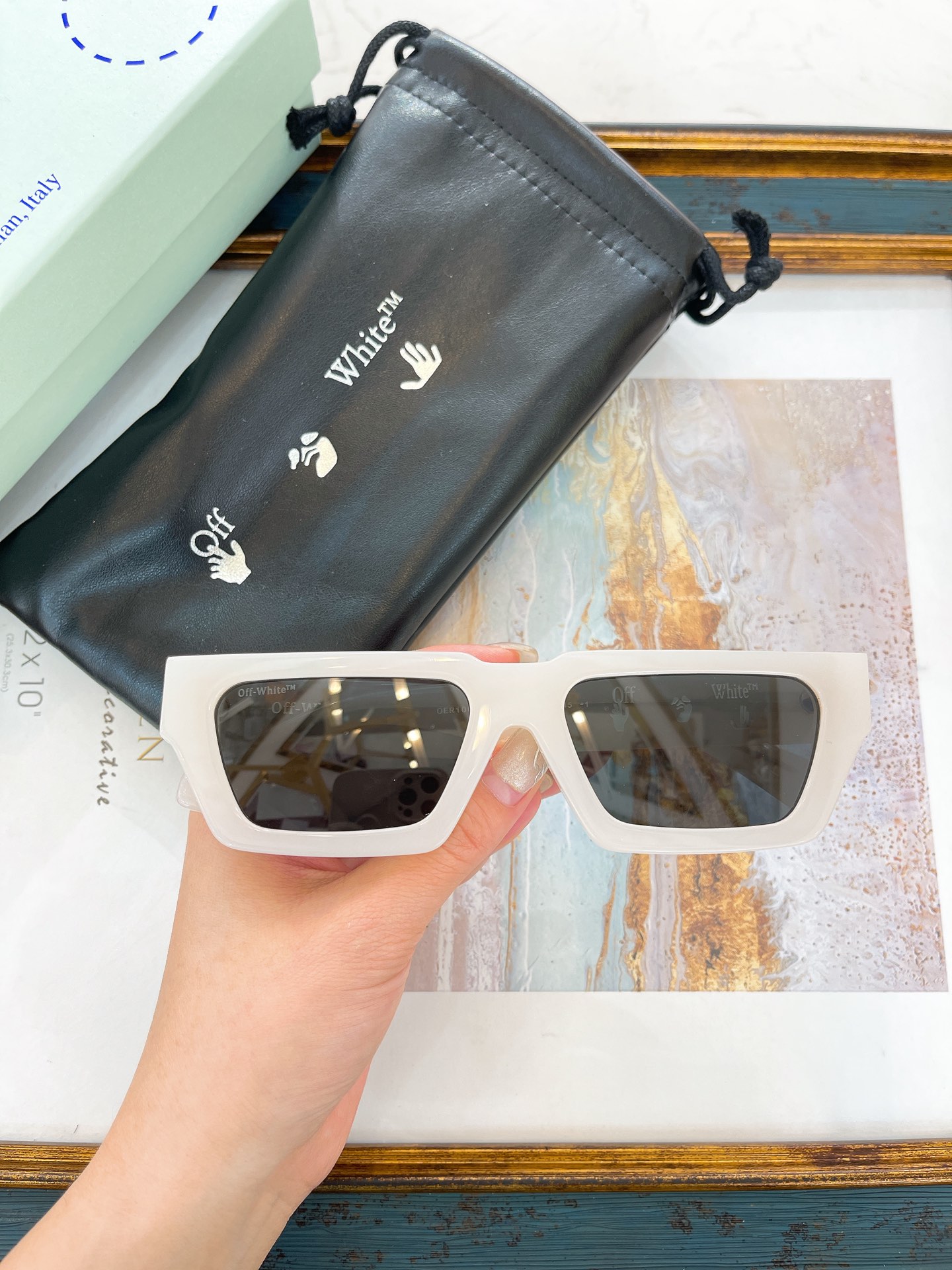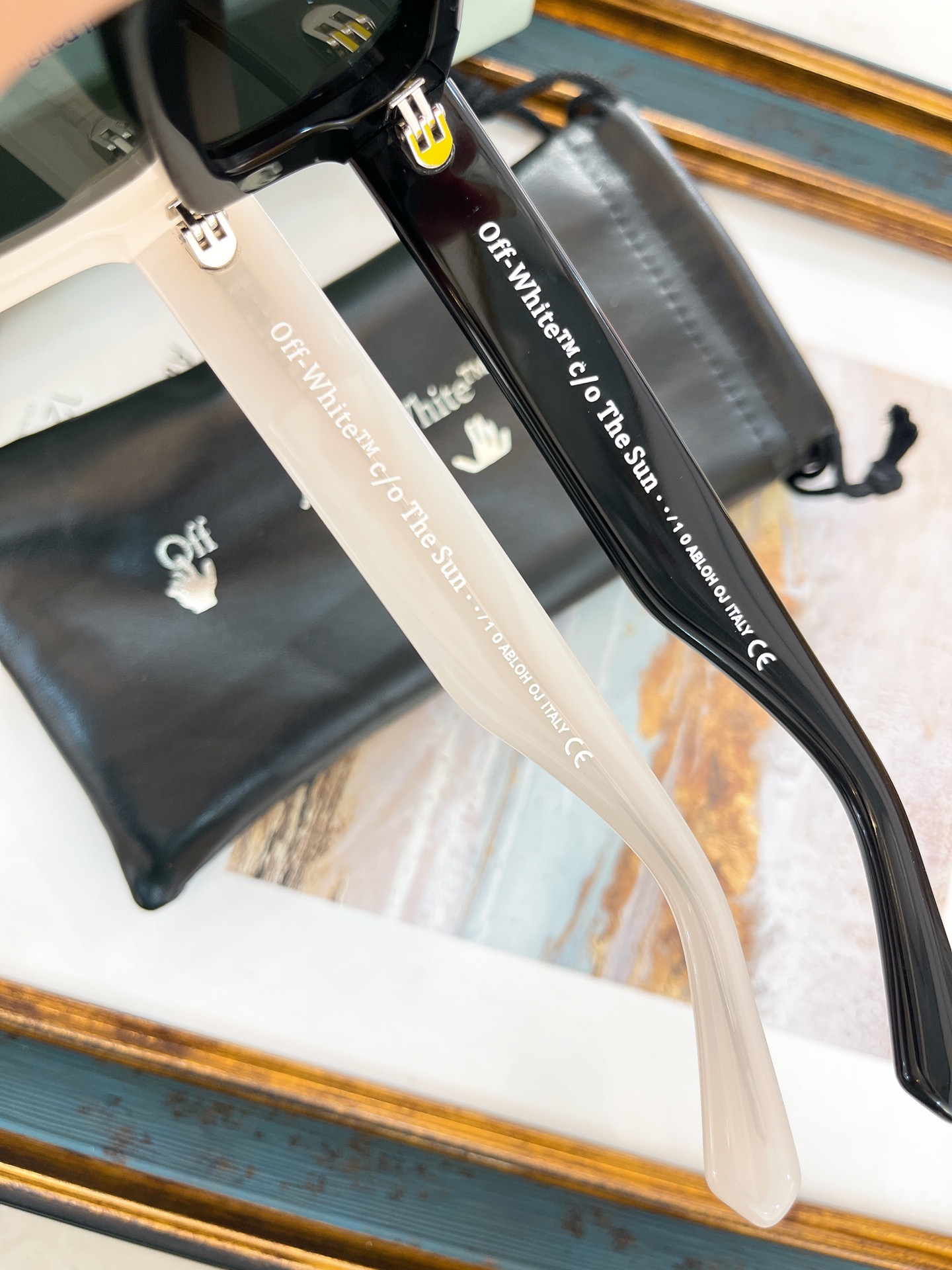 这款太阳眼镜是AAAAA 1:1 质量 (非常棒). 使用了和原版一模一样的材料. 商标部分也保持了和OFF WHITE一样. 图片拍摄是实物太阳眼镜拍摄, 您所收到的实物保证和我们图片一模一样.