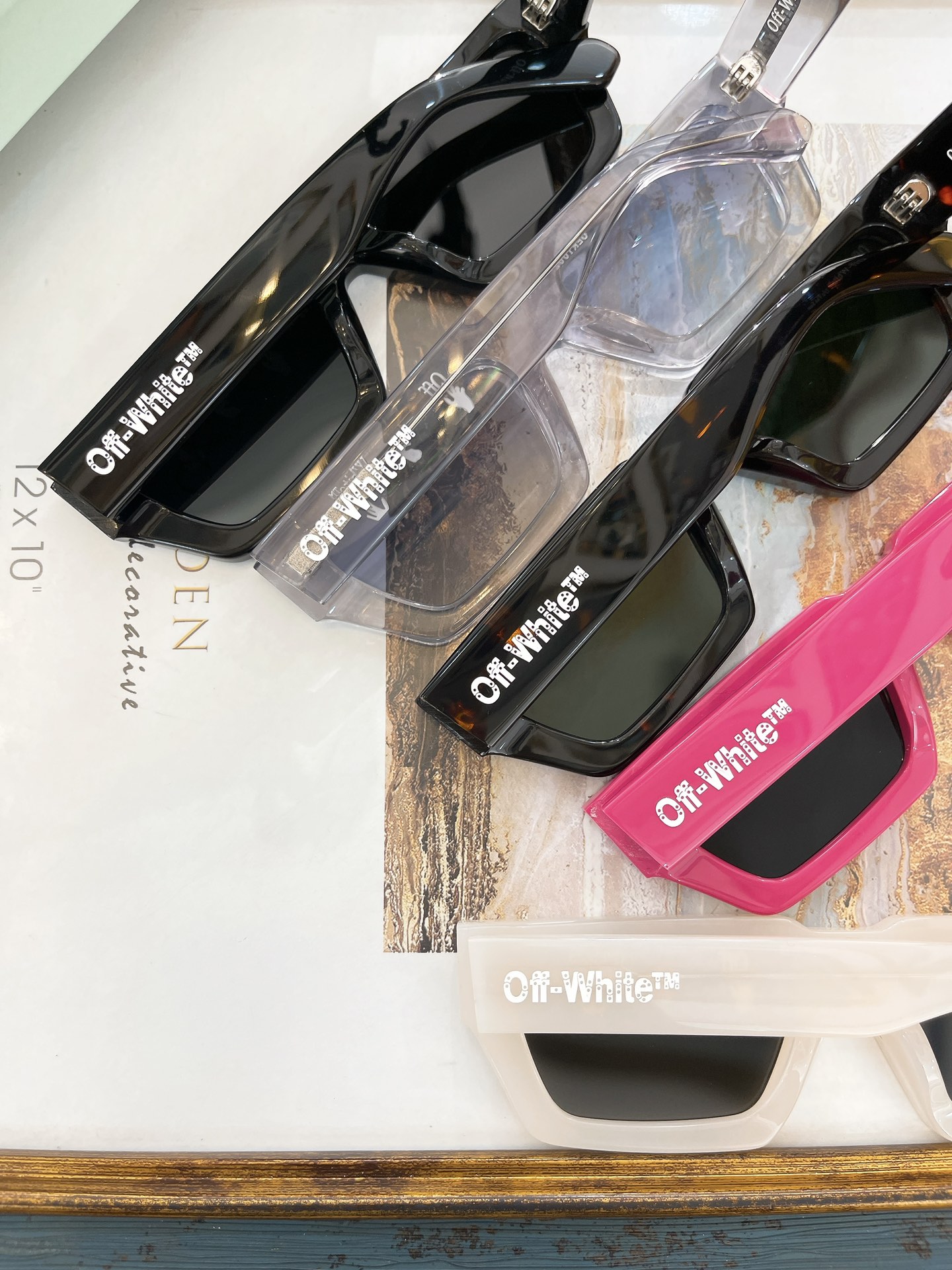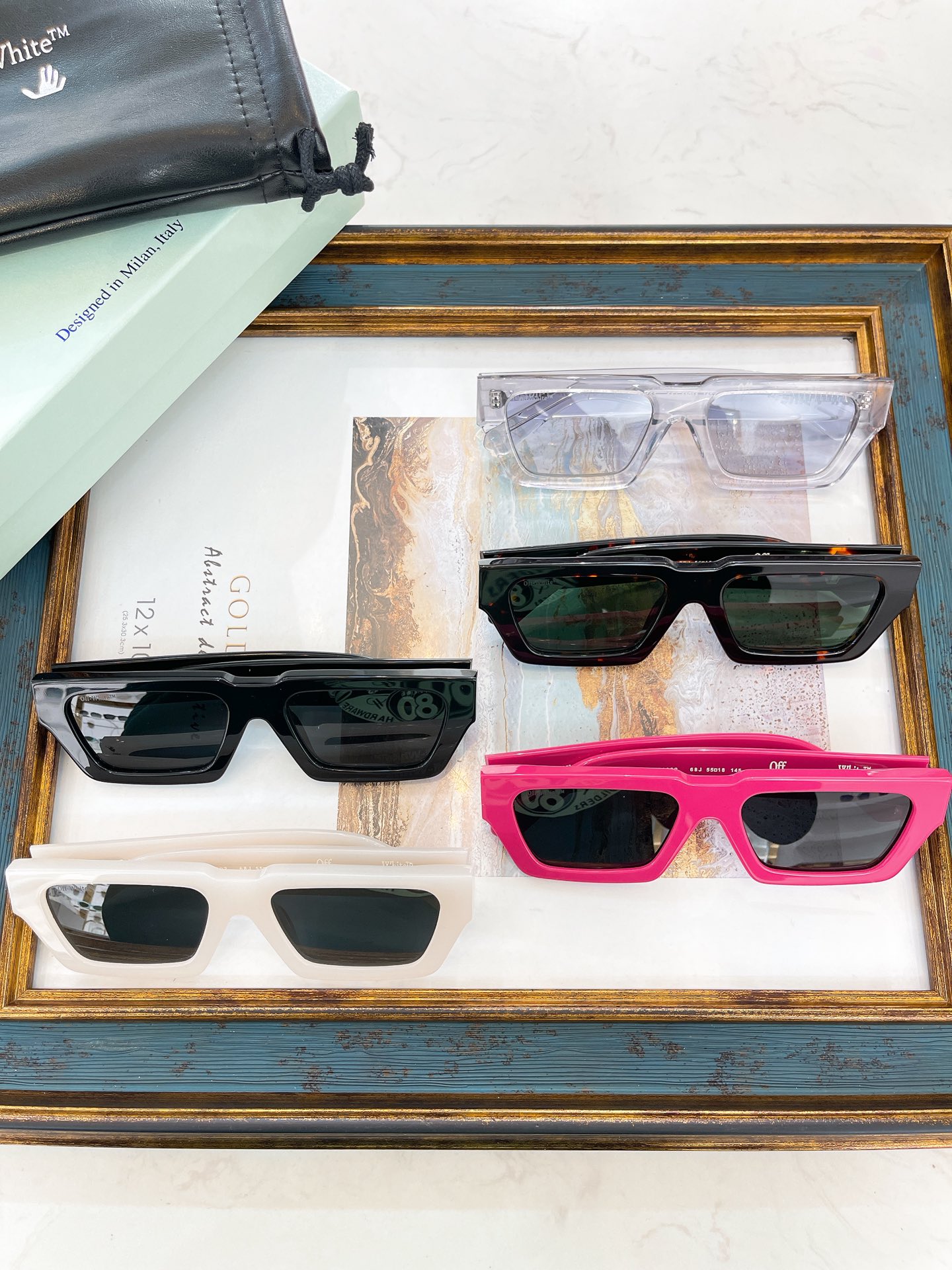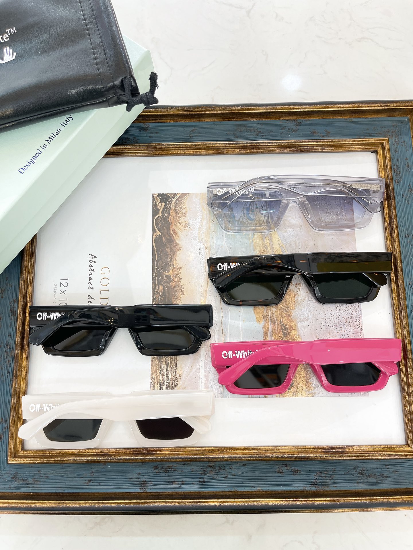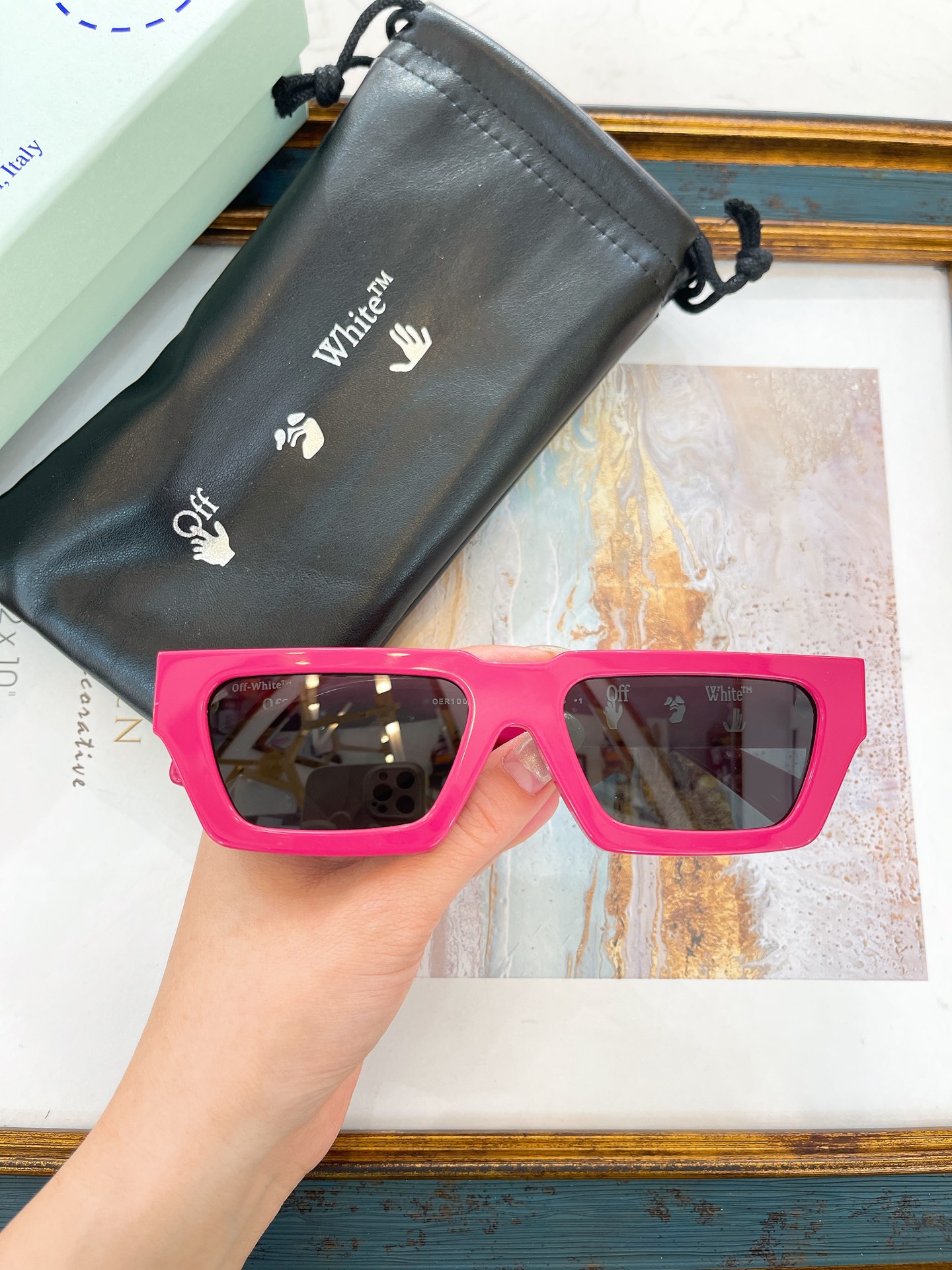 这款太阳眼镜是AAAAA 1:1 质量 (非常棒). 使用了和原版一模一样的材料. 商标部分也保持了和OFF WHITE一样. 图片拍摄是实物太阳眼镜拍摄, 您所收到的实物保证和我们图片一模一样.
