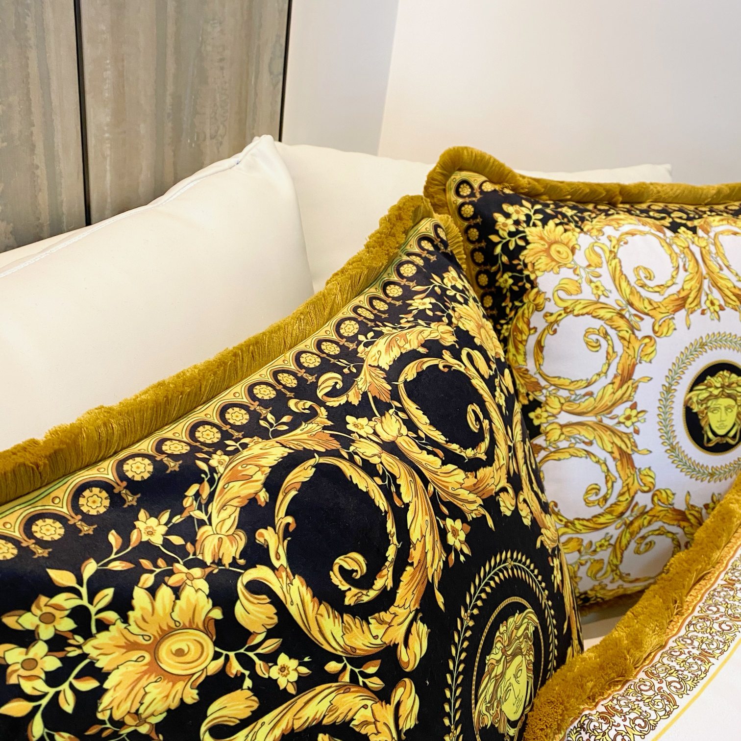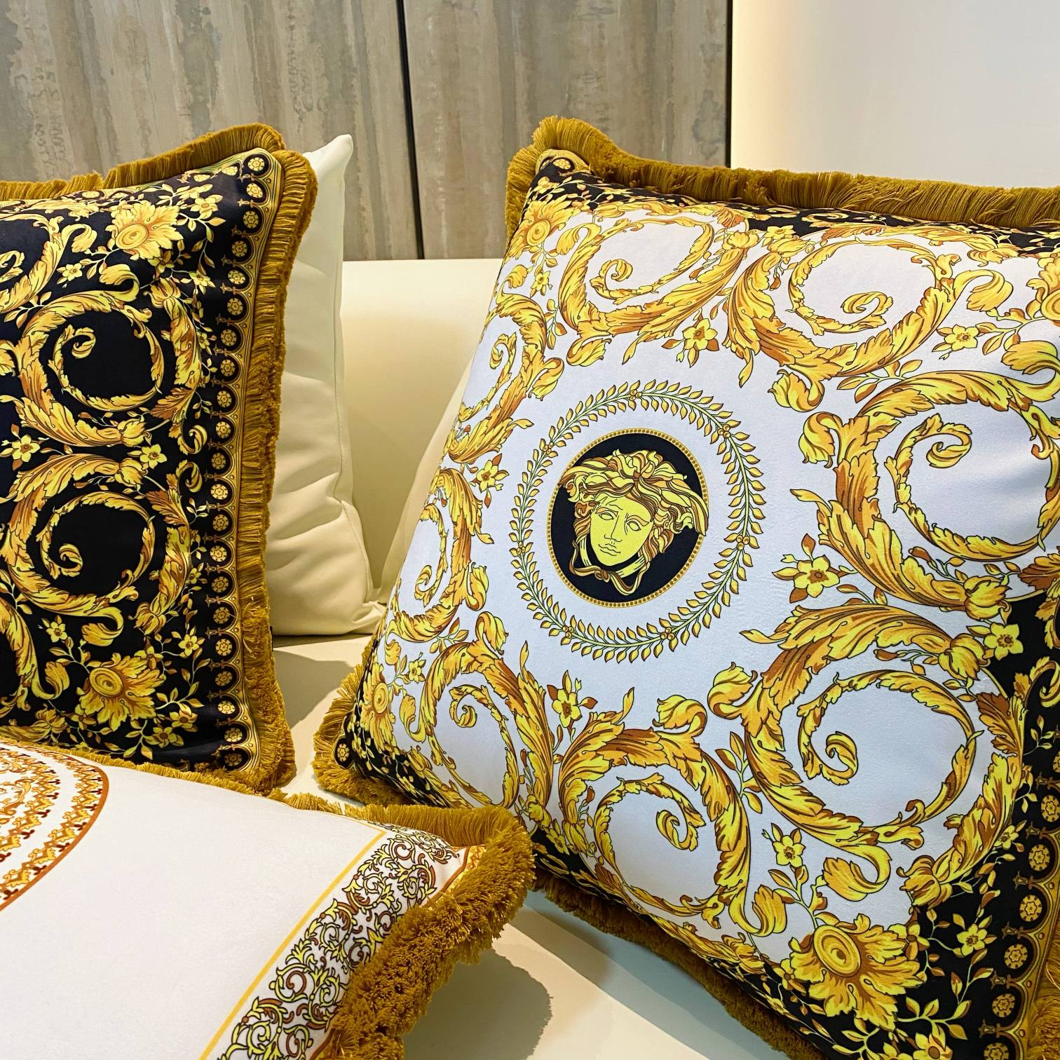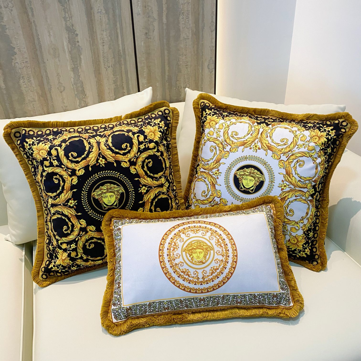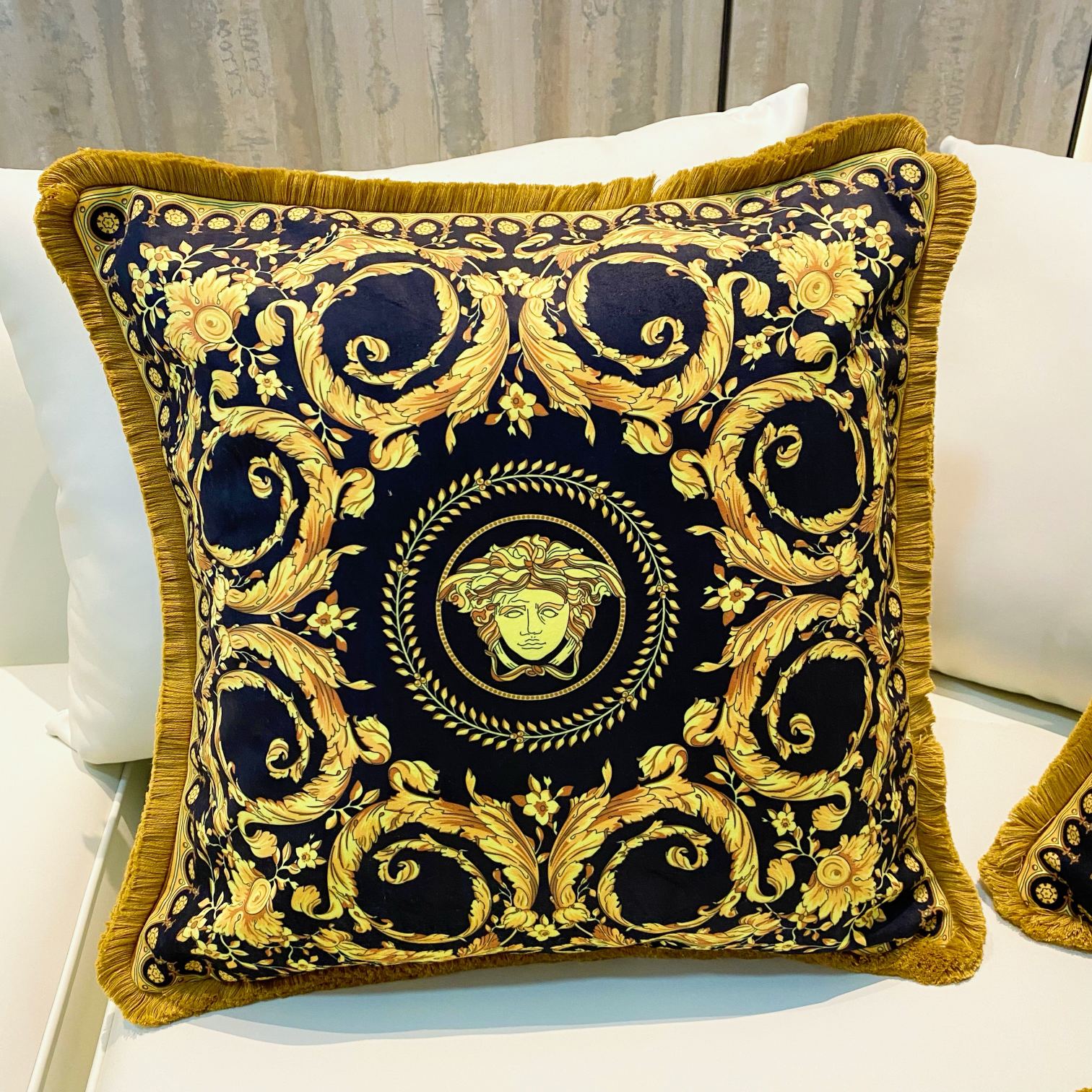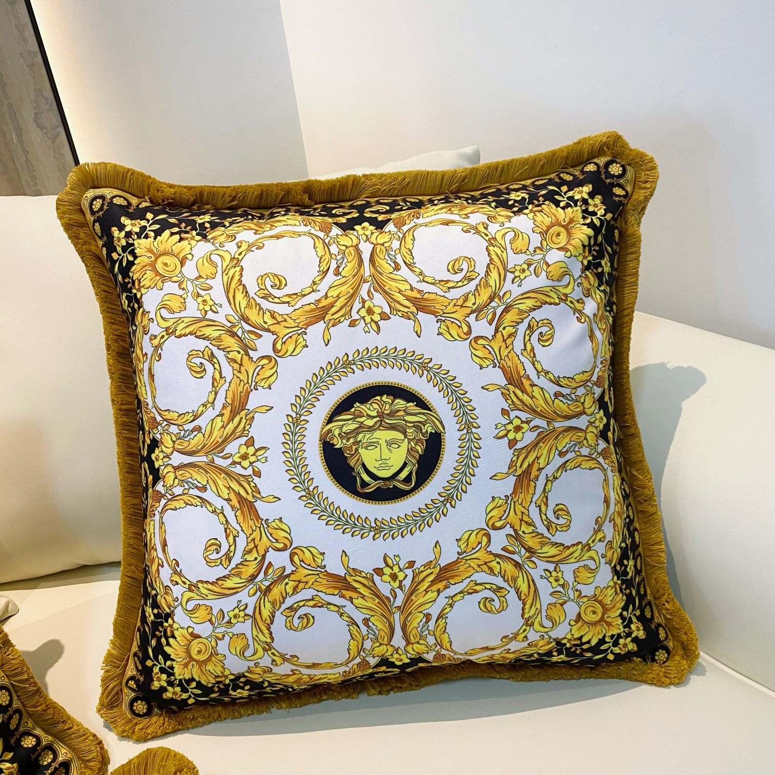 这款pillow是AAAAA 1:1 质量 (非常棒). 使用了和原版一模一样的材料. 商标部分也保持了和范思哲/Versace一样. 图片拍摄是实物pillow拍摄, 您所收到的实物保证和我们图片一模一样.