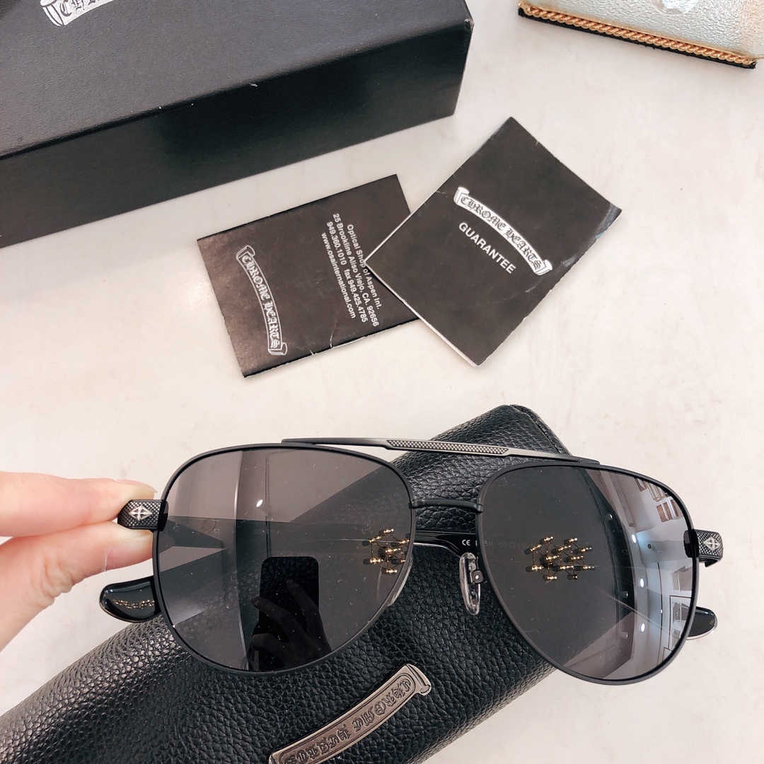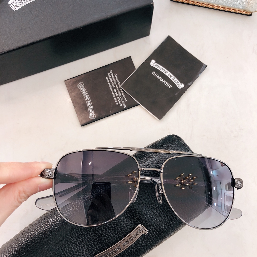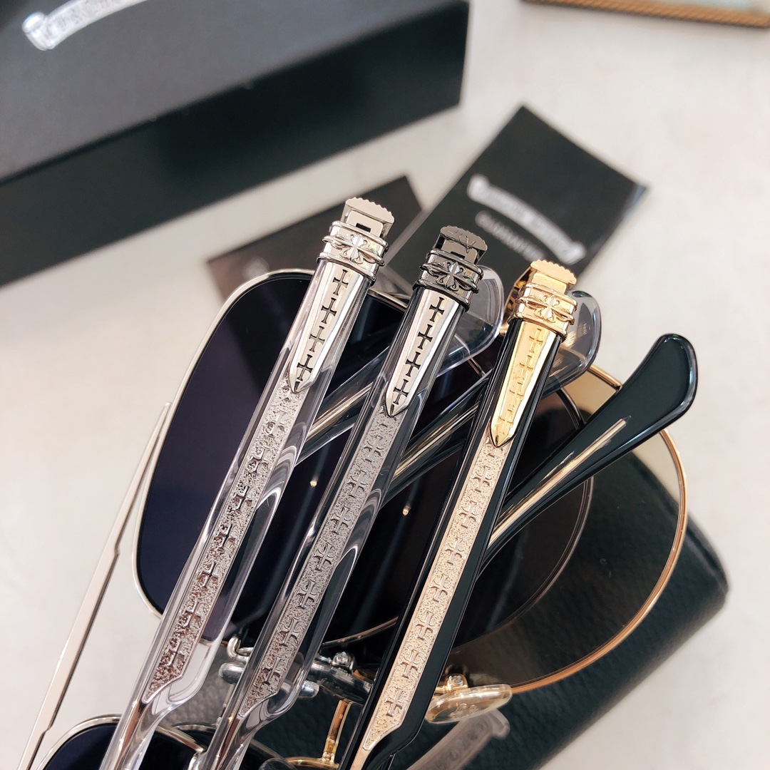 这款太阳眼镜是AAAAA 1:1 质量 (非常棒). 使用了和原版一模一样的材料. 商标部分也保持了和克罗心/Chrome Hearts一样. 图片拍摄是实物太阳眼镜拍摄, 您所收到的实物保证和我们图片一模一样.
