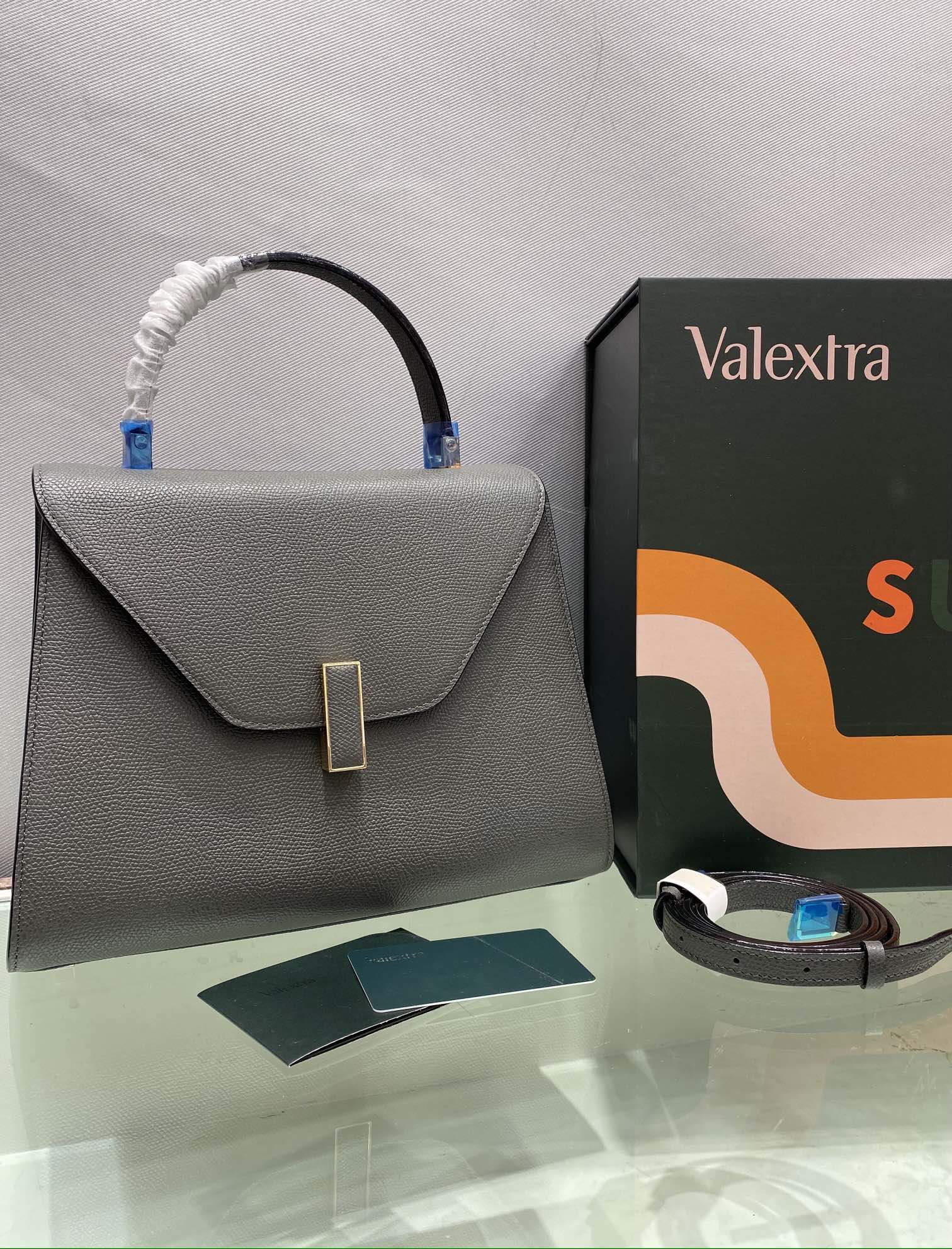 这款包包是AAAAA 1:1 质量 (非常棒). 使用了和原版一模一样的材料. 商标部分也保持了和Valextra一样. 图片拍摄是实物包包拍摄, 您所收到的实物保证和我们图片一模一样.