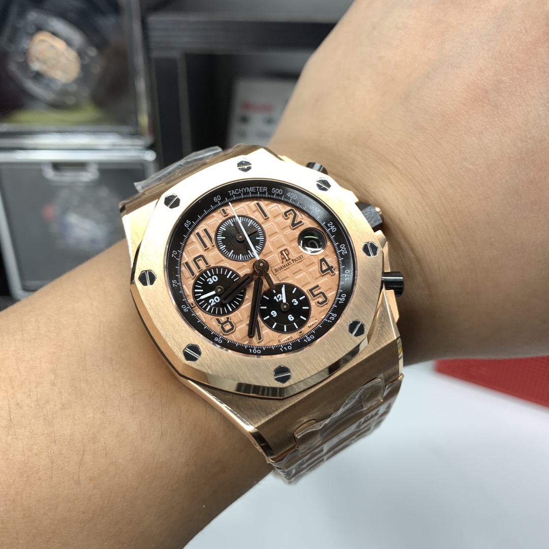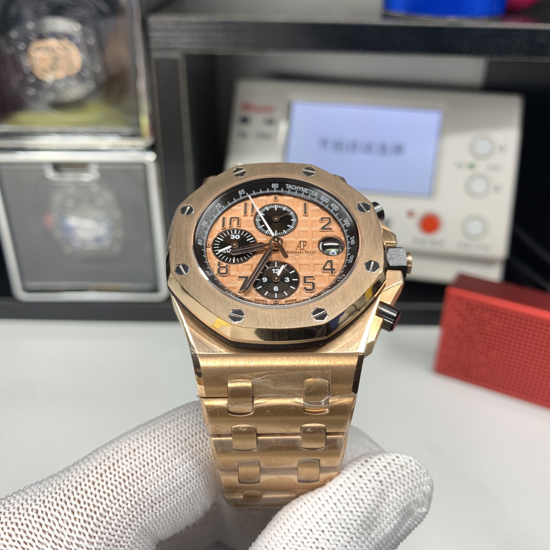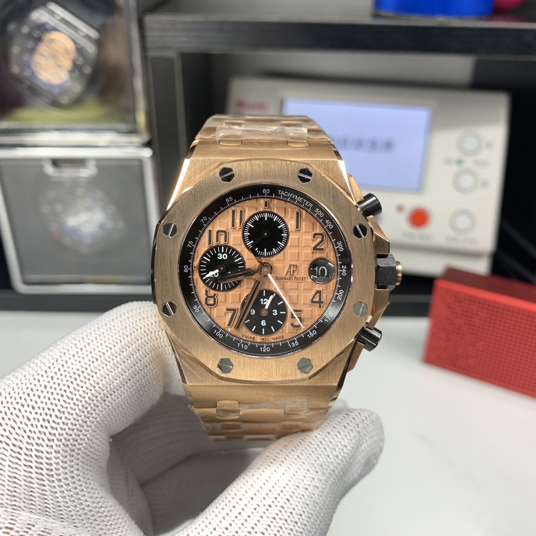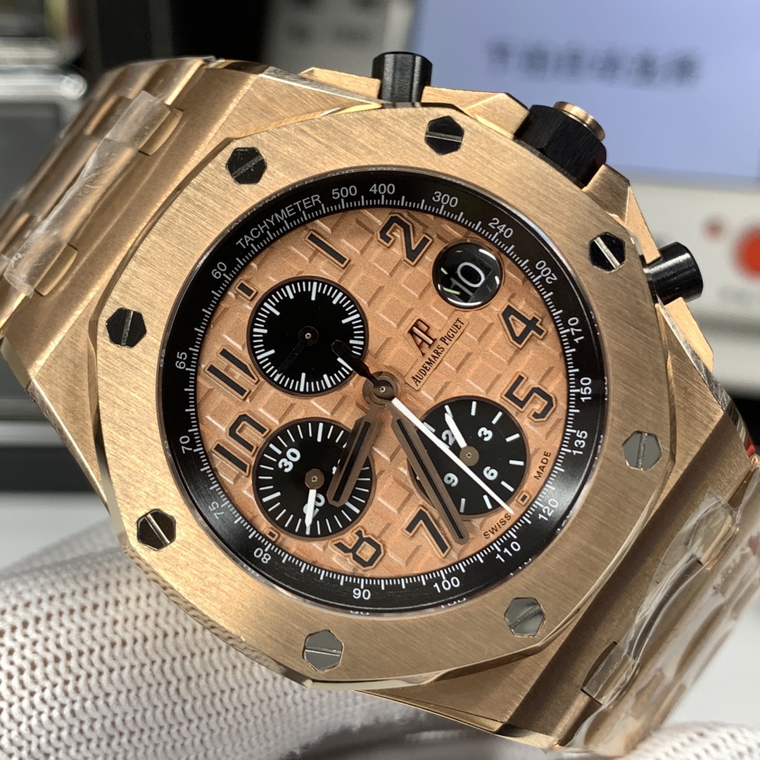 这款手表是AAAAA 1:1 质量 (非常棒). 使用了和原版一模一样的材料. 商标部分也保持了和爱彼/Audemars Piguet一样. 图片拍摄是实物手表拍摄, 您所收到的实物保证和我们图片一模一样.