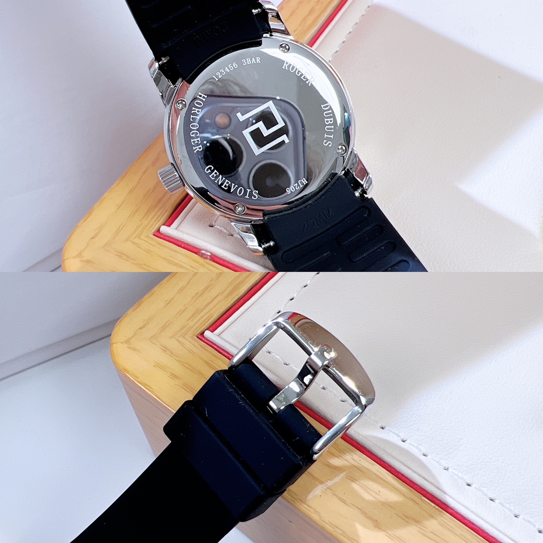 这款手表是AAAAA 1:1 质量 (非常棒). 使用了和原版一模一样的材料. 商标部分也保持了和Roger Dubuis一样. 图片拍摄是实物手表拍摄, 您所收到的实物保证和我们图片一模一样.